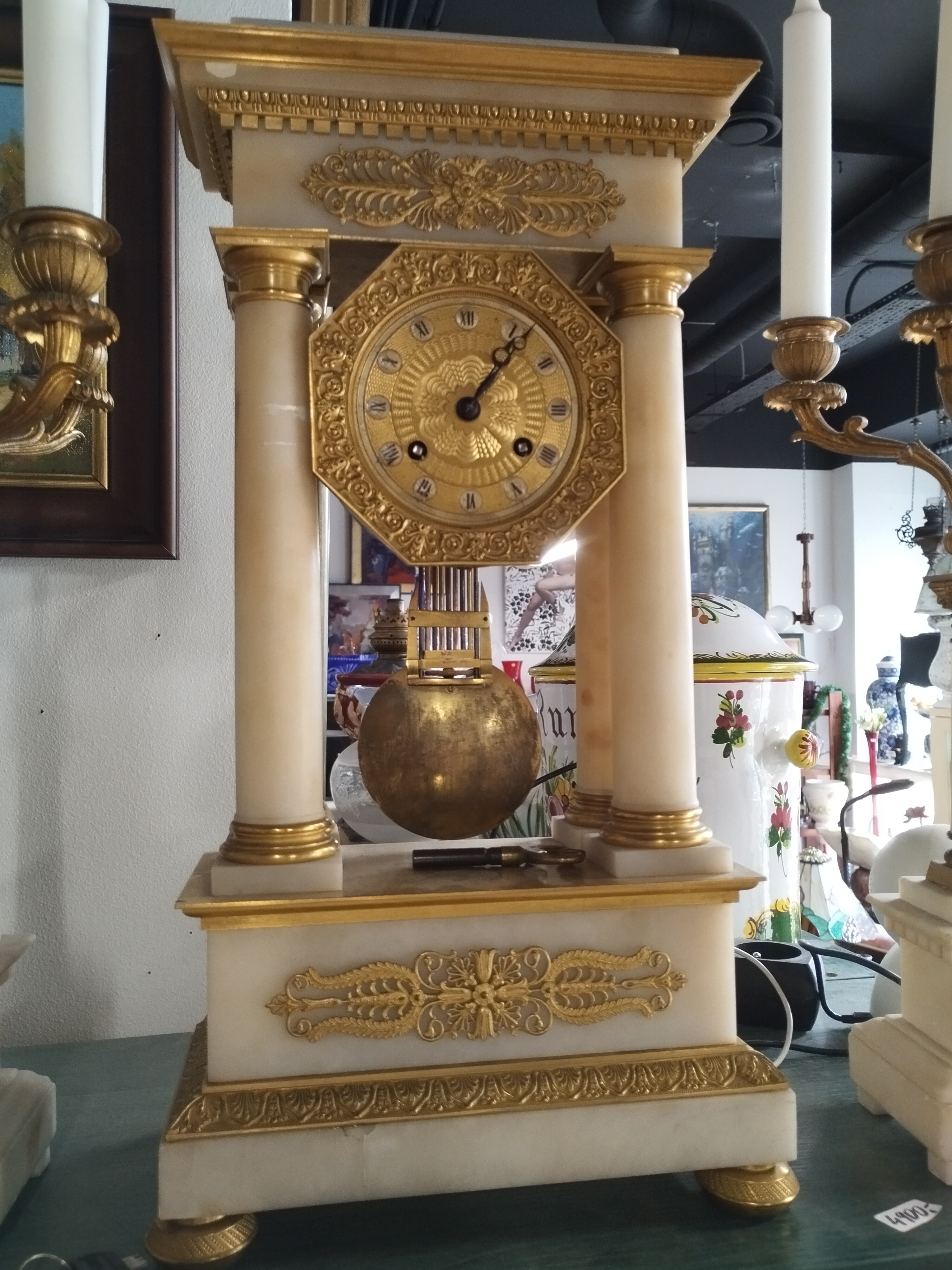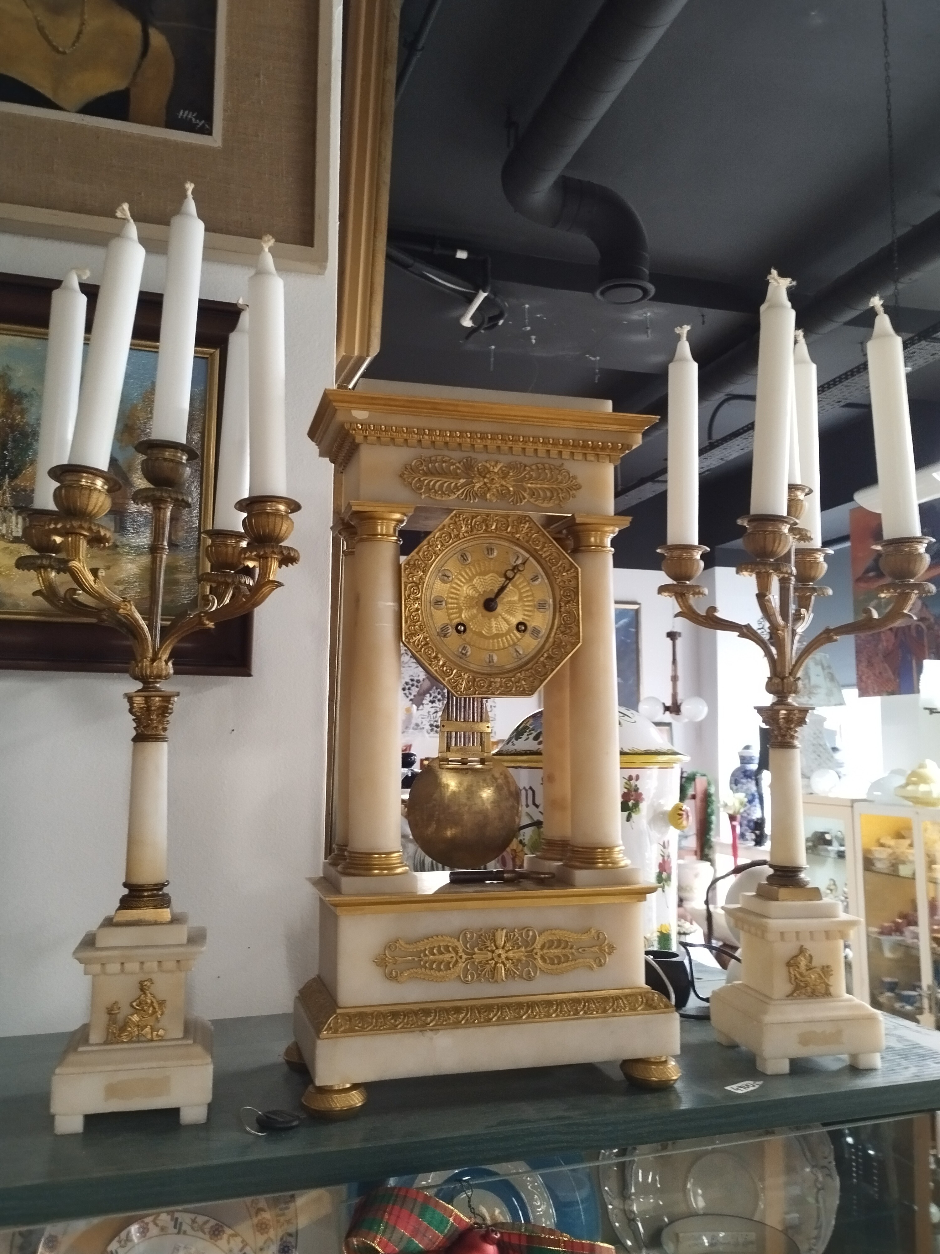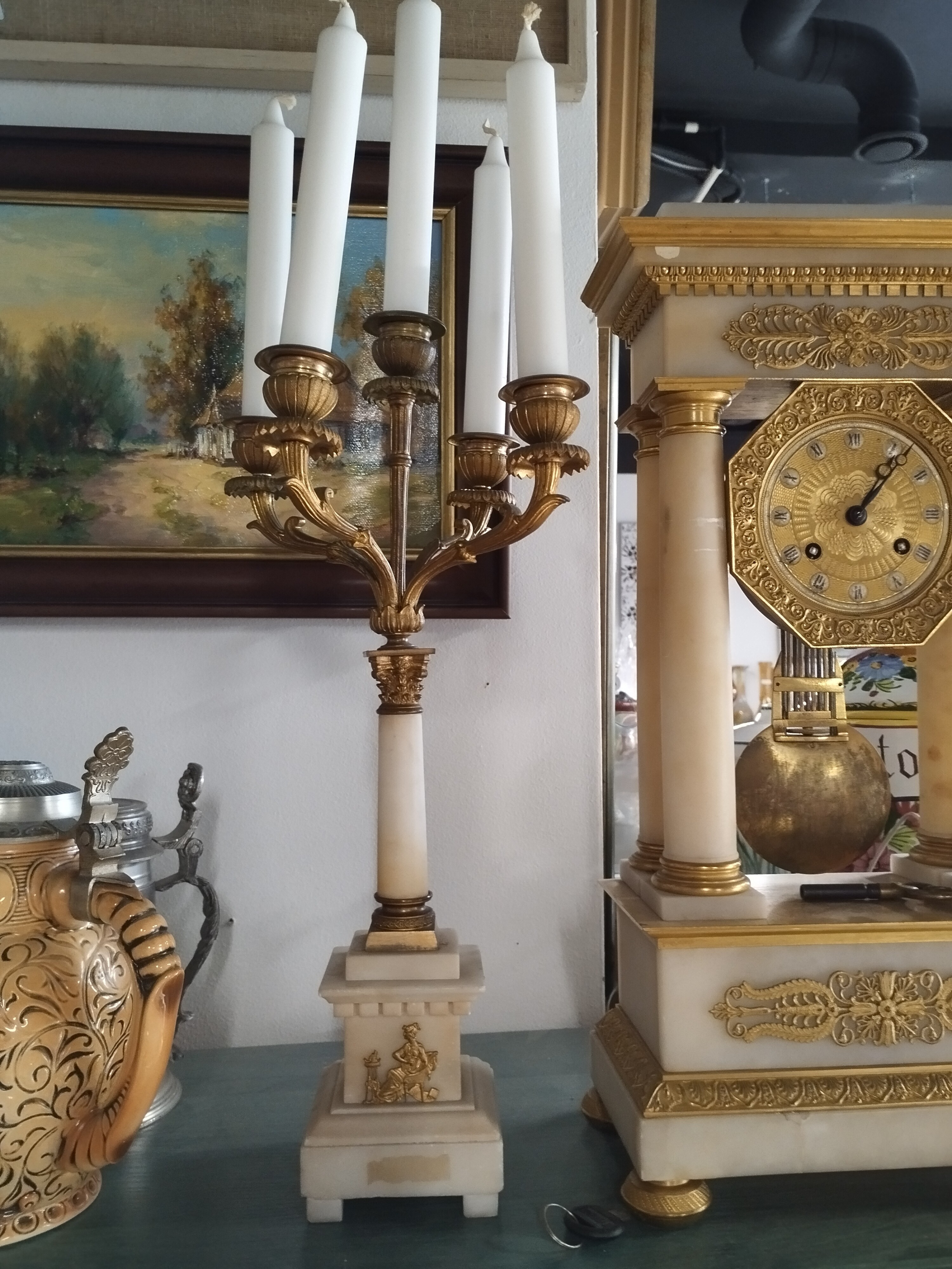 Zegar kominkowy, portykowy + 2 świeczniki. Alabaster i elementy z mosiądzu. Cena do negocjacji.