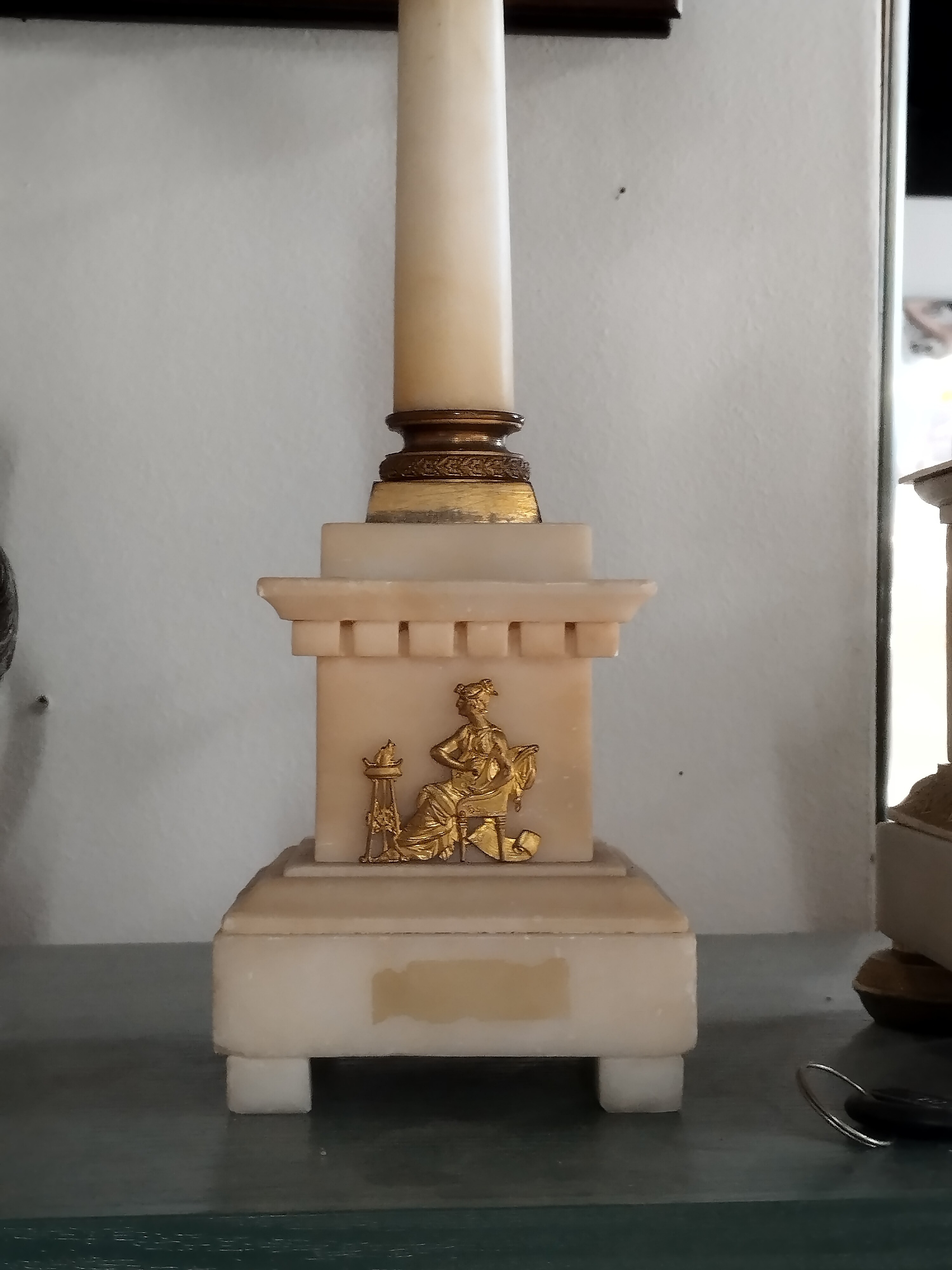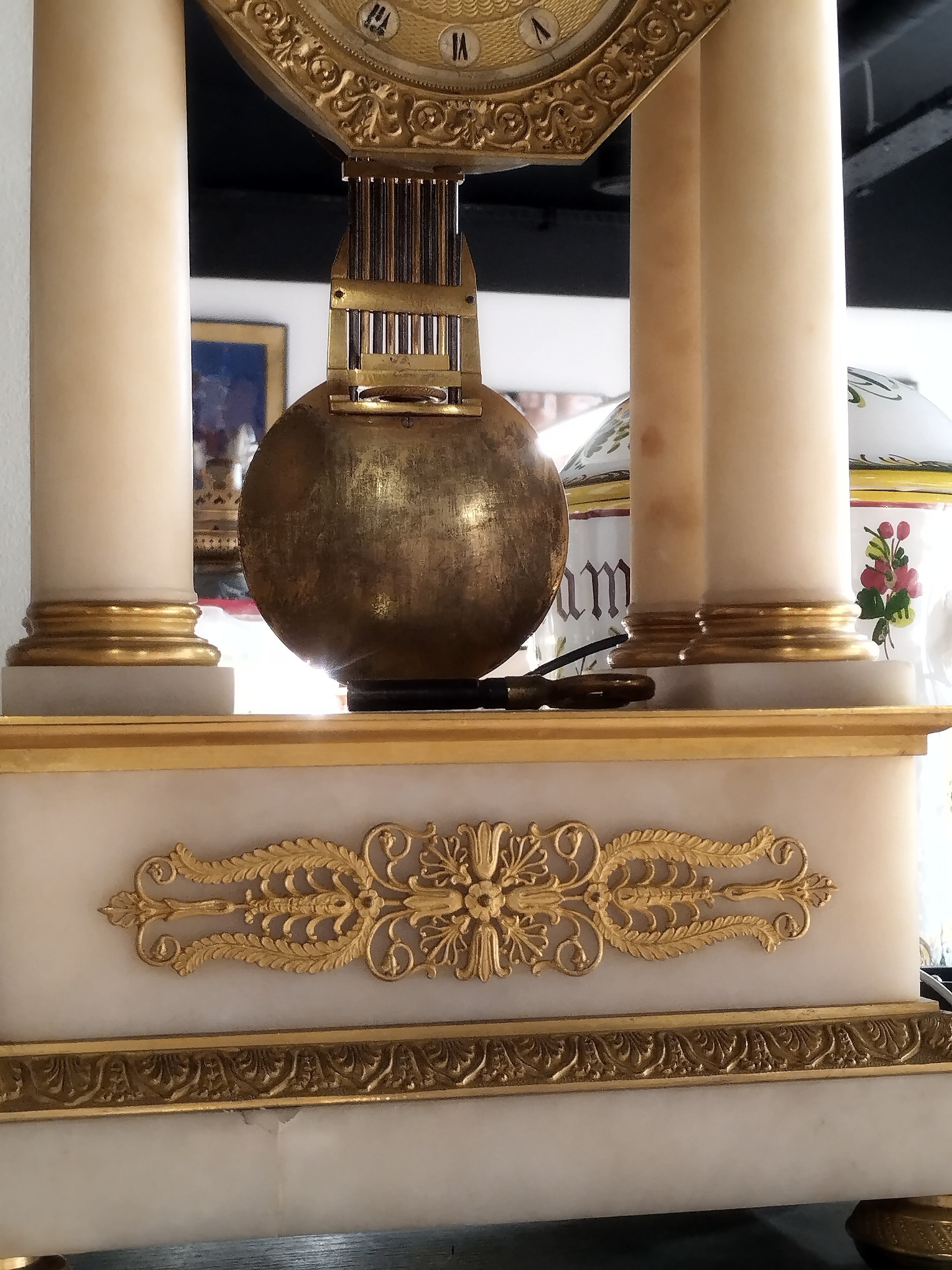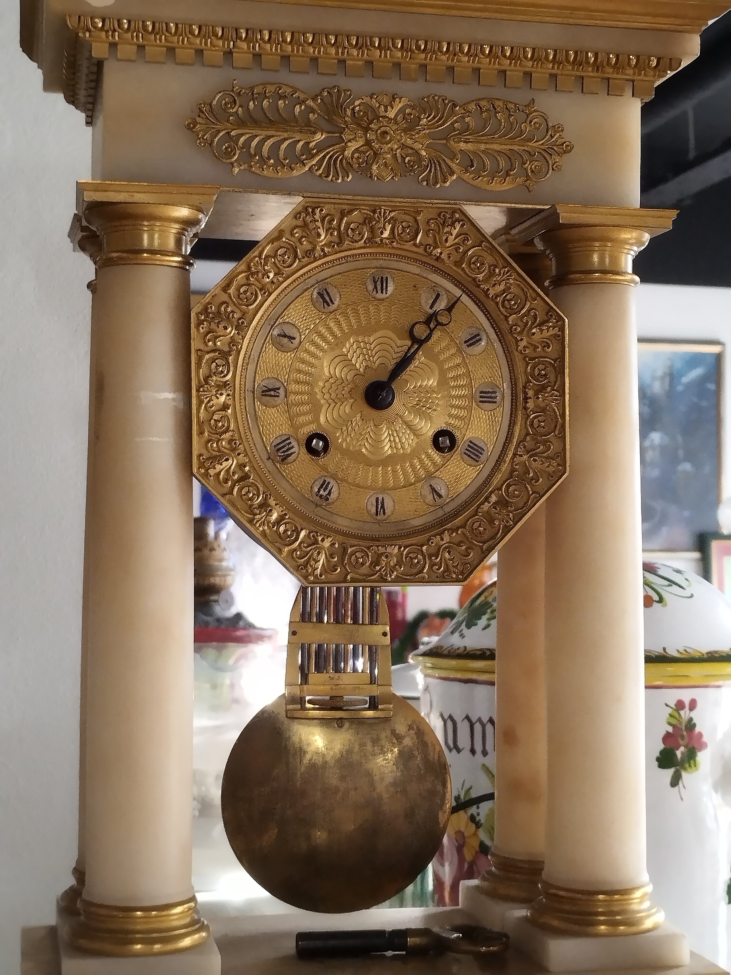 Zegar kominkowy, portykowy + 2 świeczniki. Alabaster i elementy z mosiądzu. Cena do negocjacji.