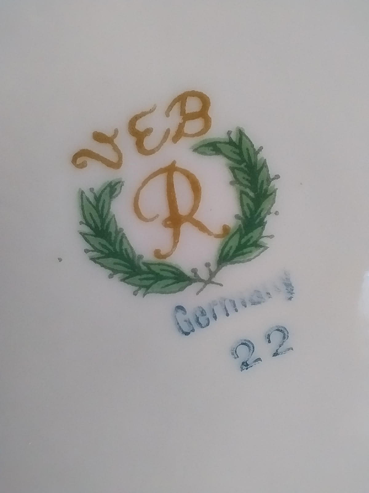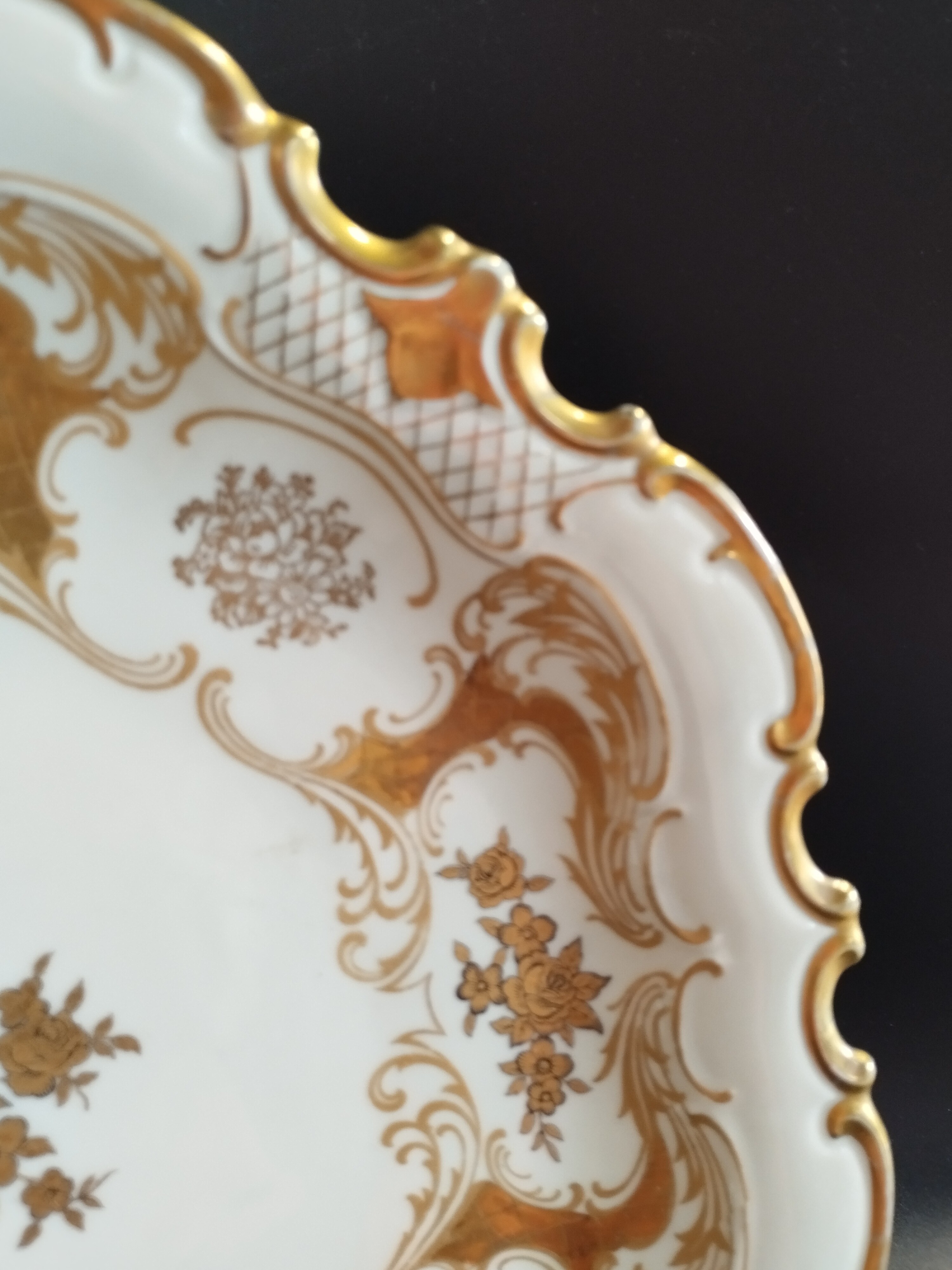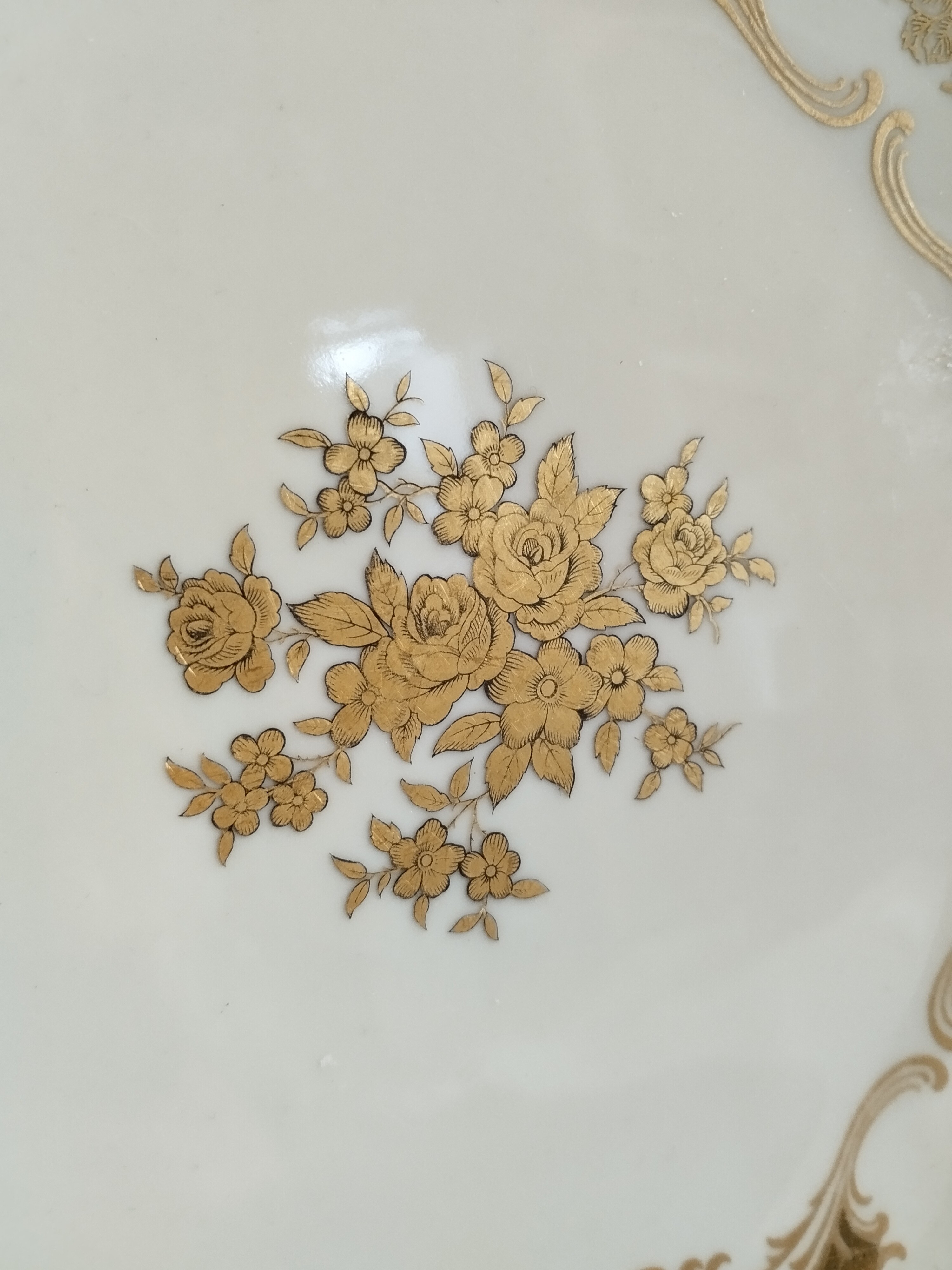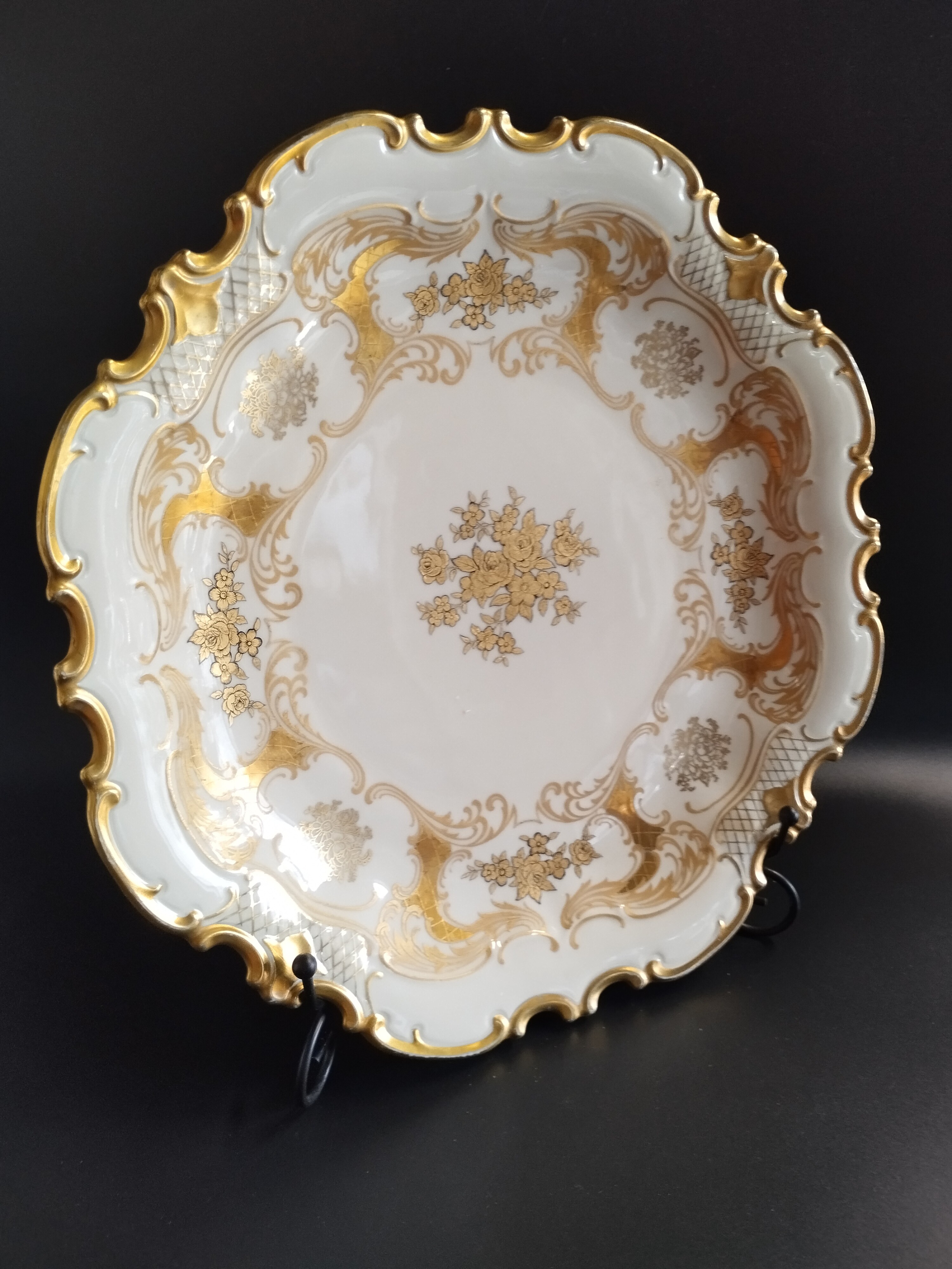 Piękna duża patera w odcieniu ecru, zdobiona złoconym motywem. Firma Reichenbach, Turyngia.