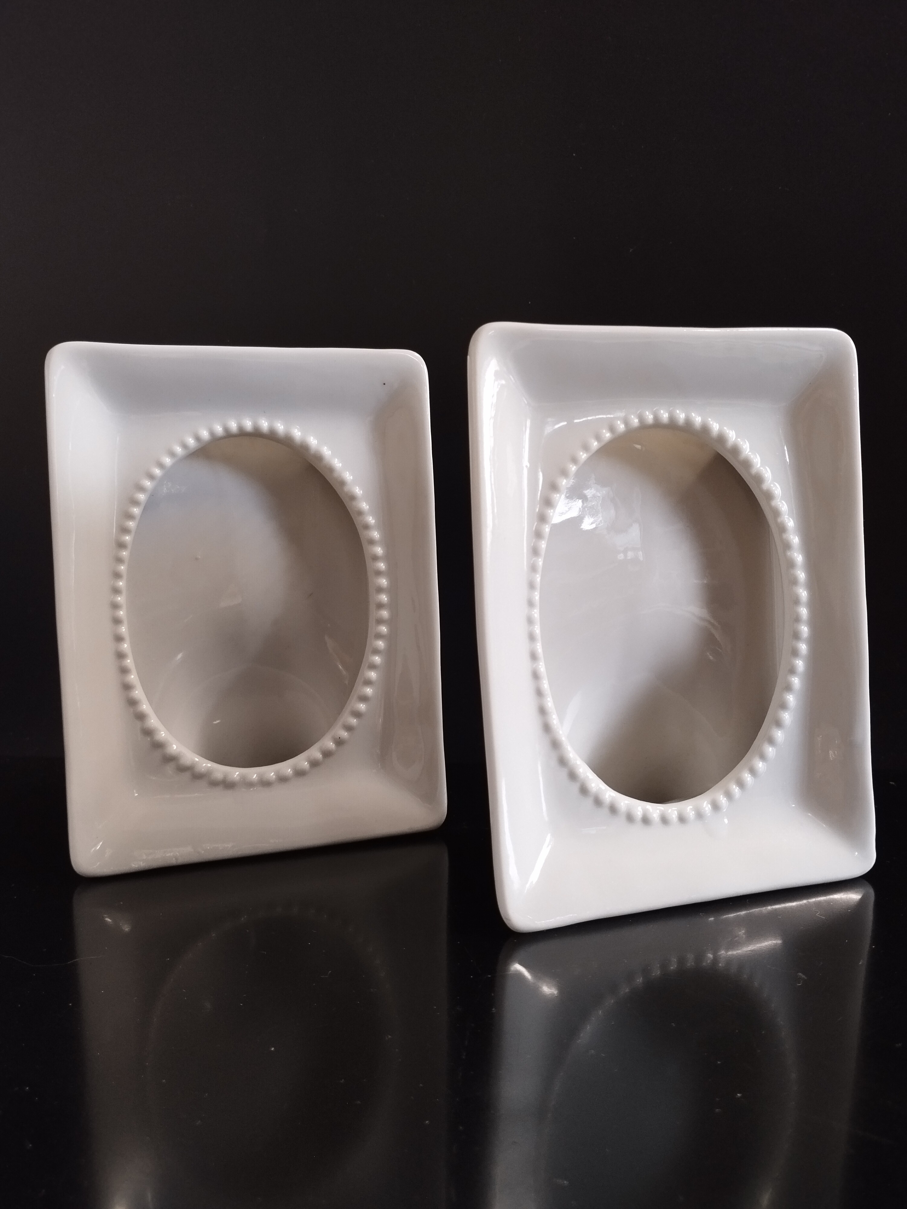 Białe ramki porcelanowe do zdjęć owalnych o wymiarach: 9 x 7 cm. Posiadamy 2 szt. Cena za 1 sztukę.