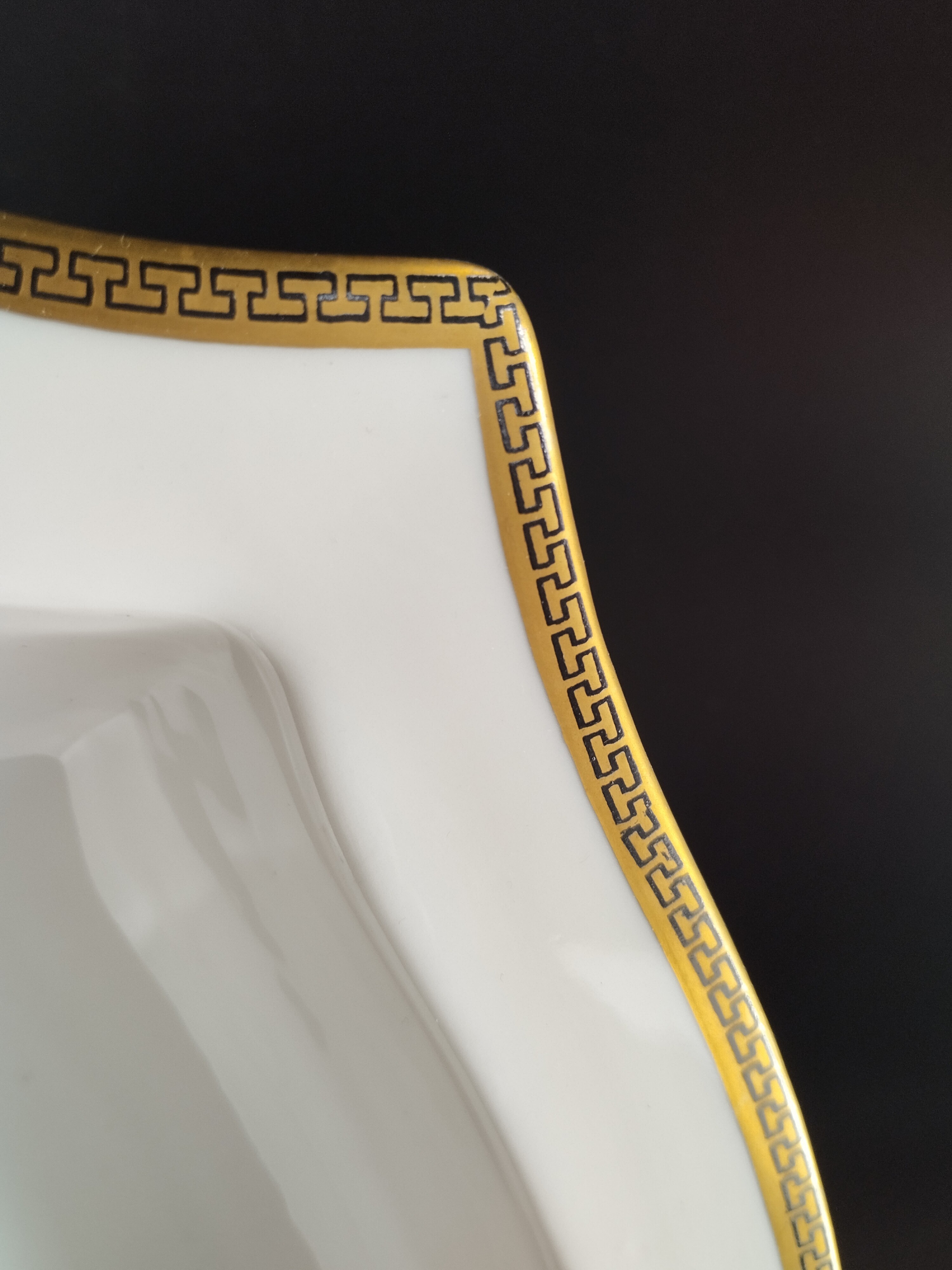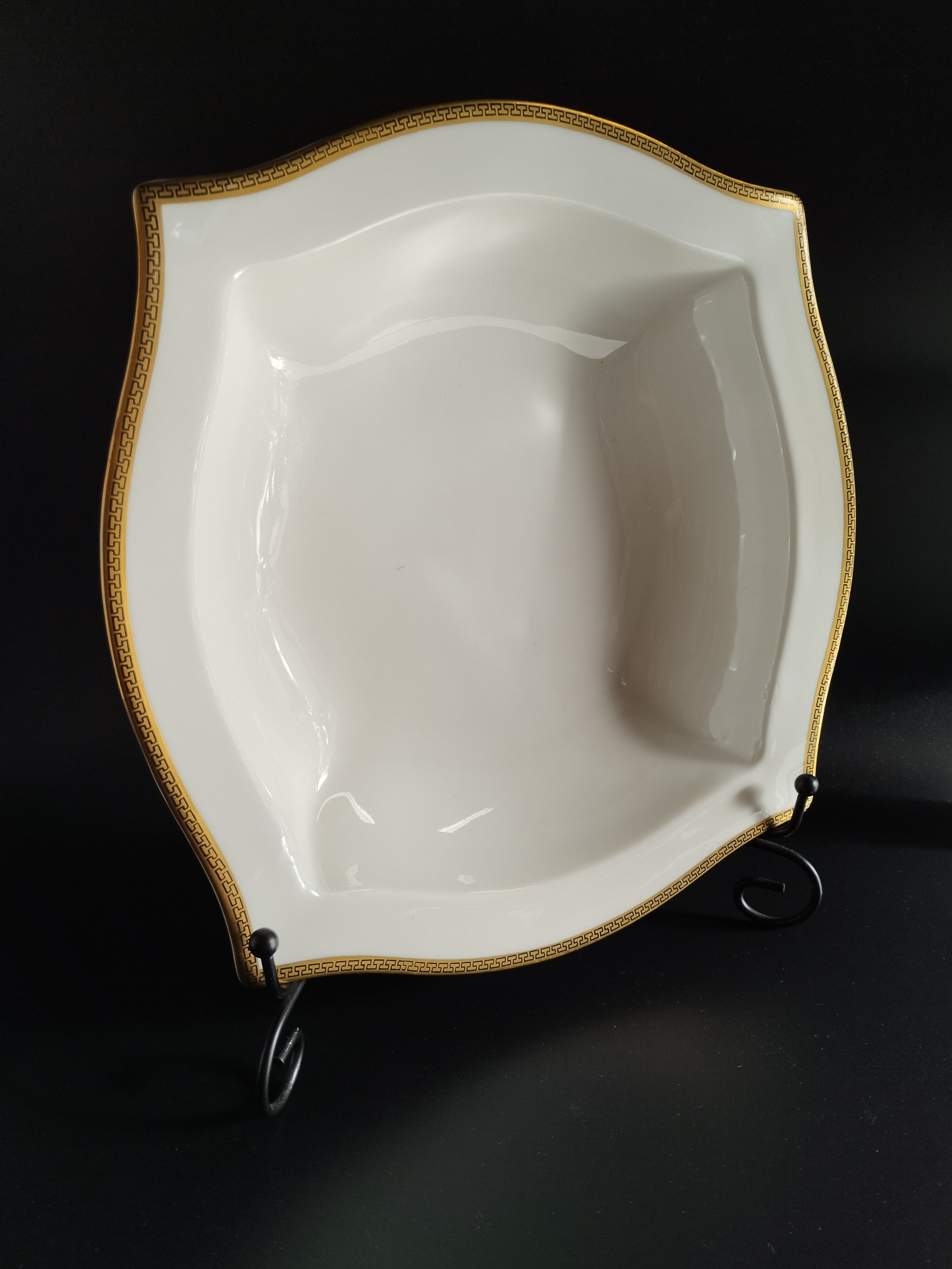 Kwadratowa salaterka porcelanowa ze złoconym brzegiem.