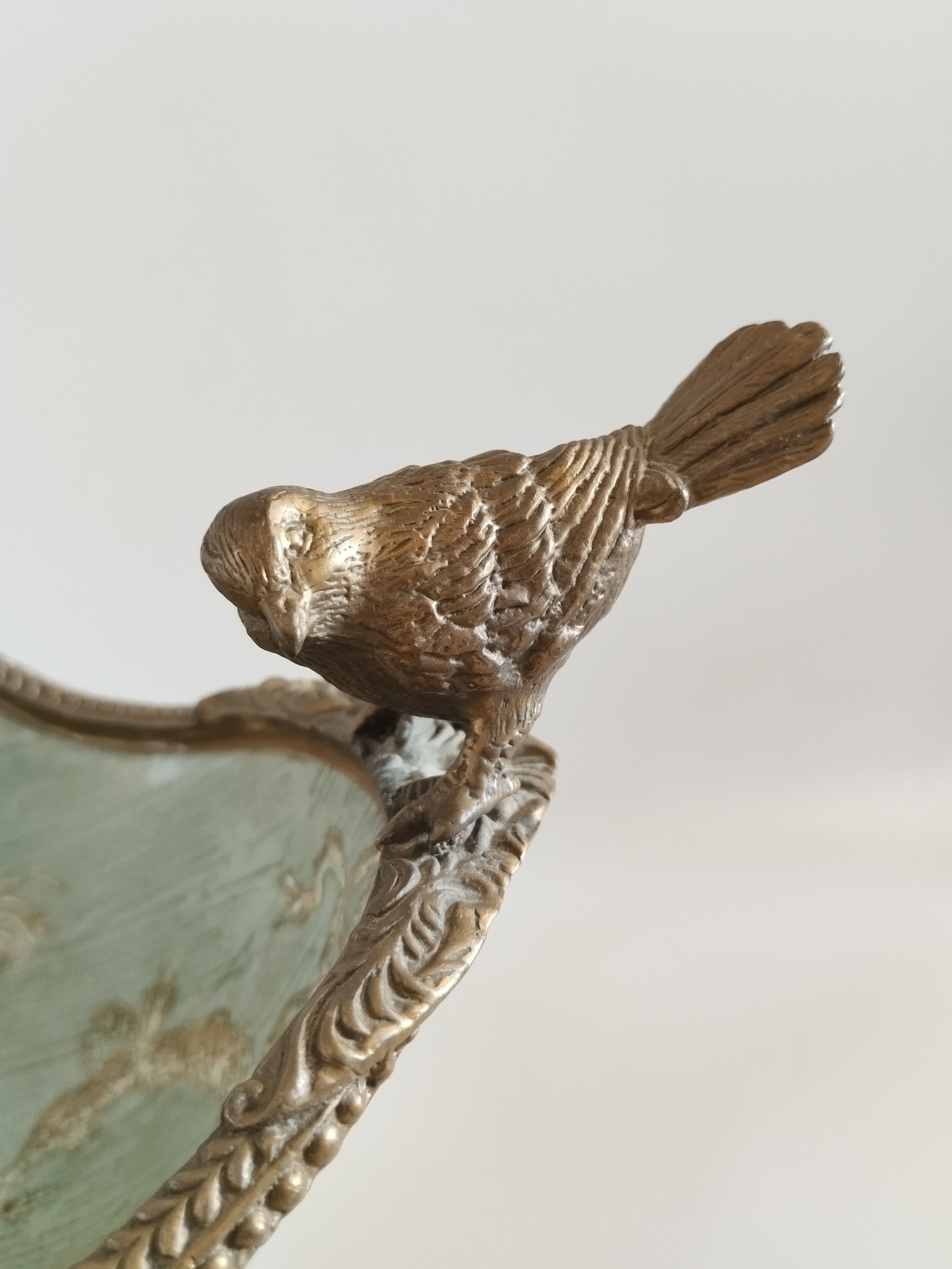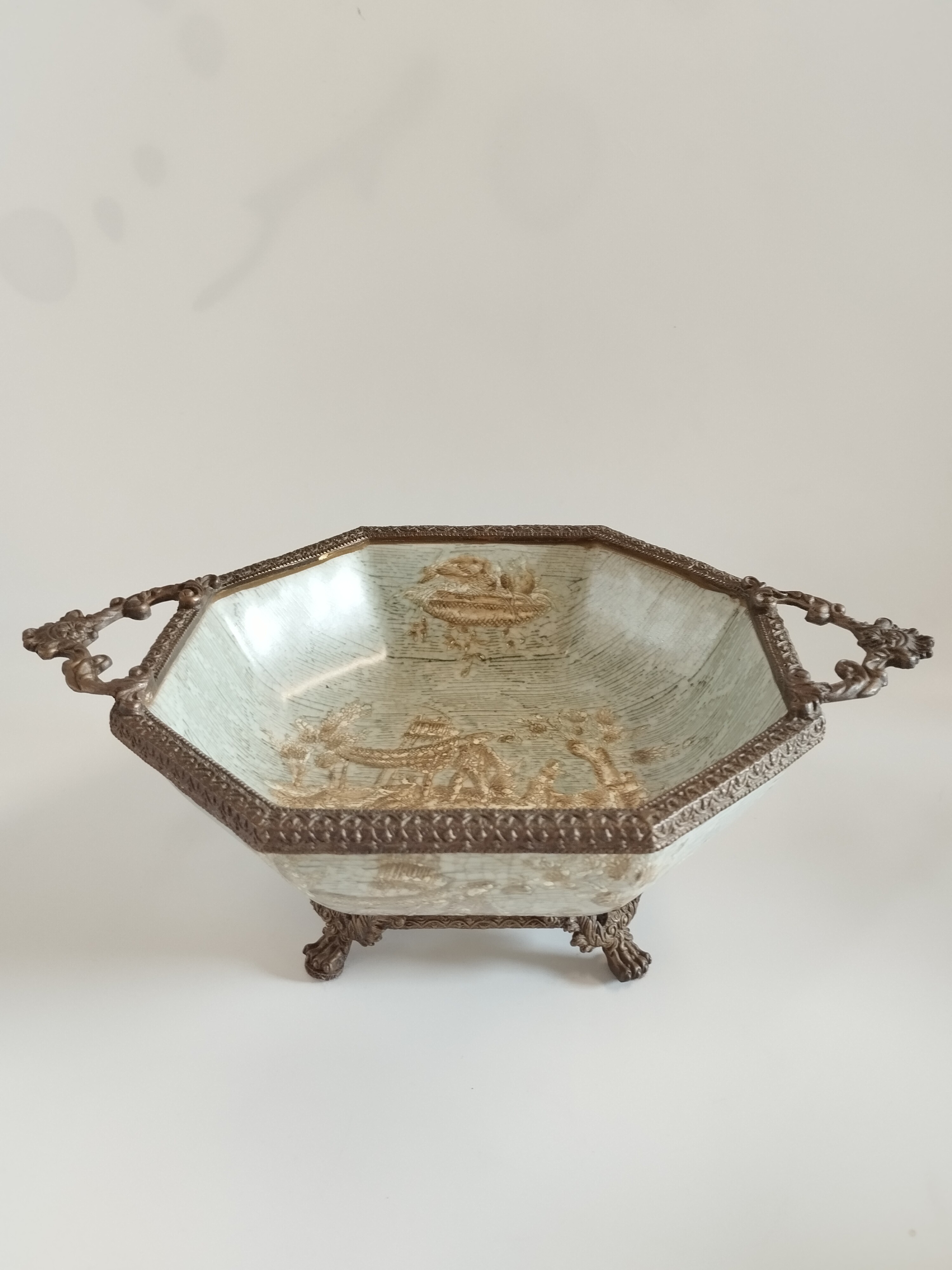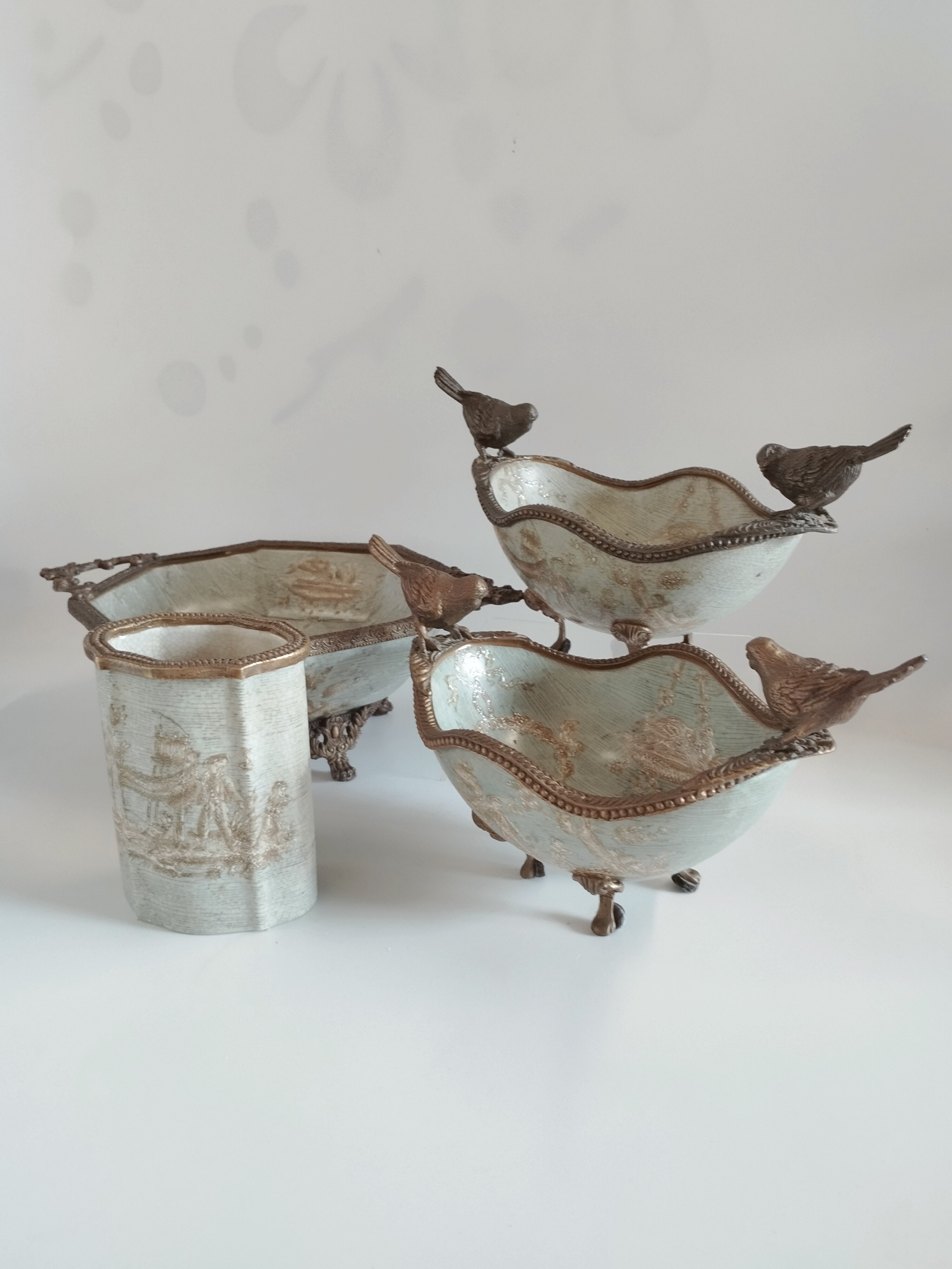 Komplet z ceramiki spękanej w okuciach z mosiądzu składający się z żardiniery ośmiokątnej, dwóch paterek podłużnych z rzeźbami ptaszków oraz wazonika.