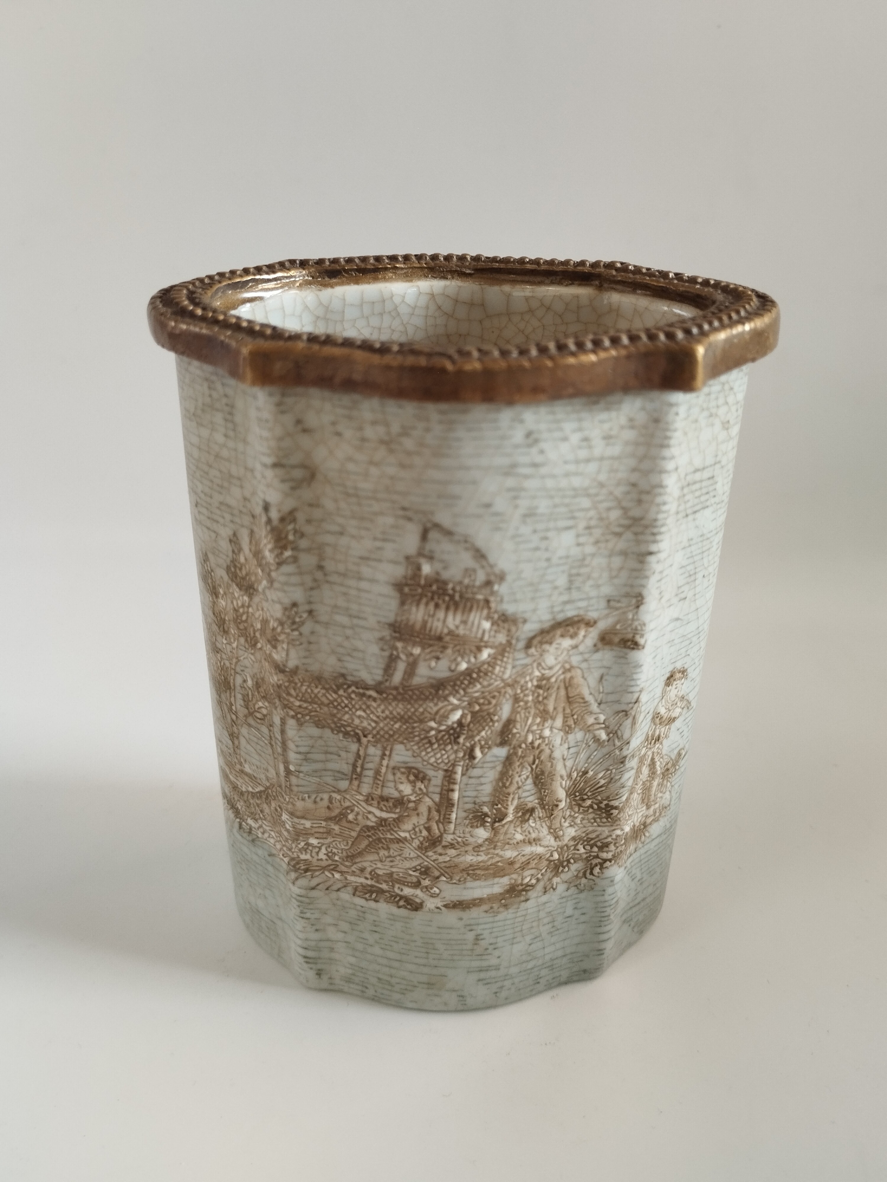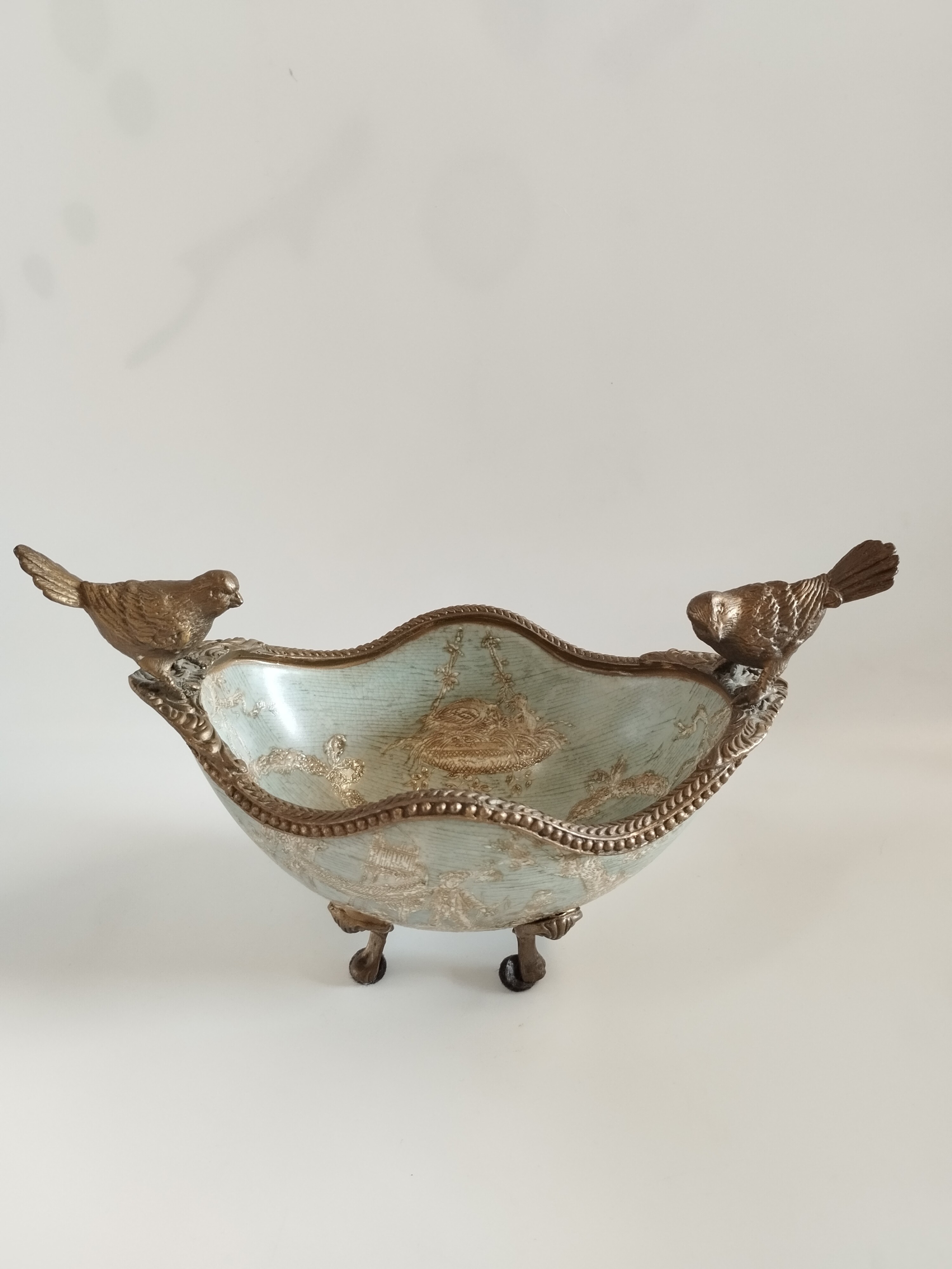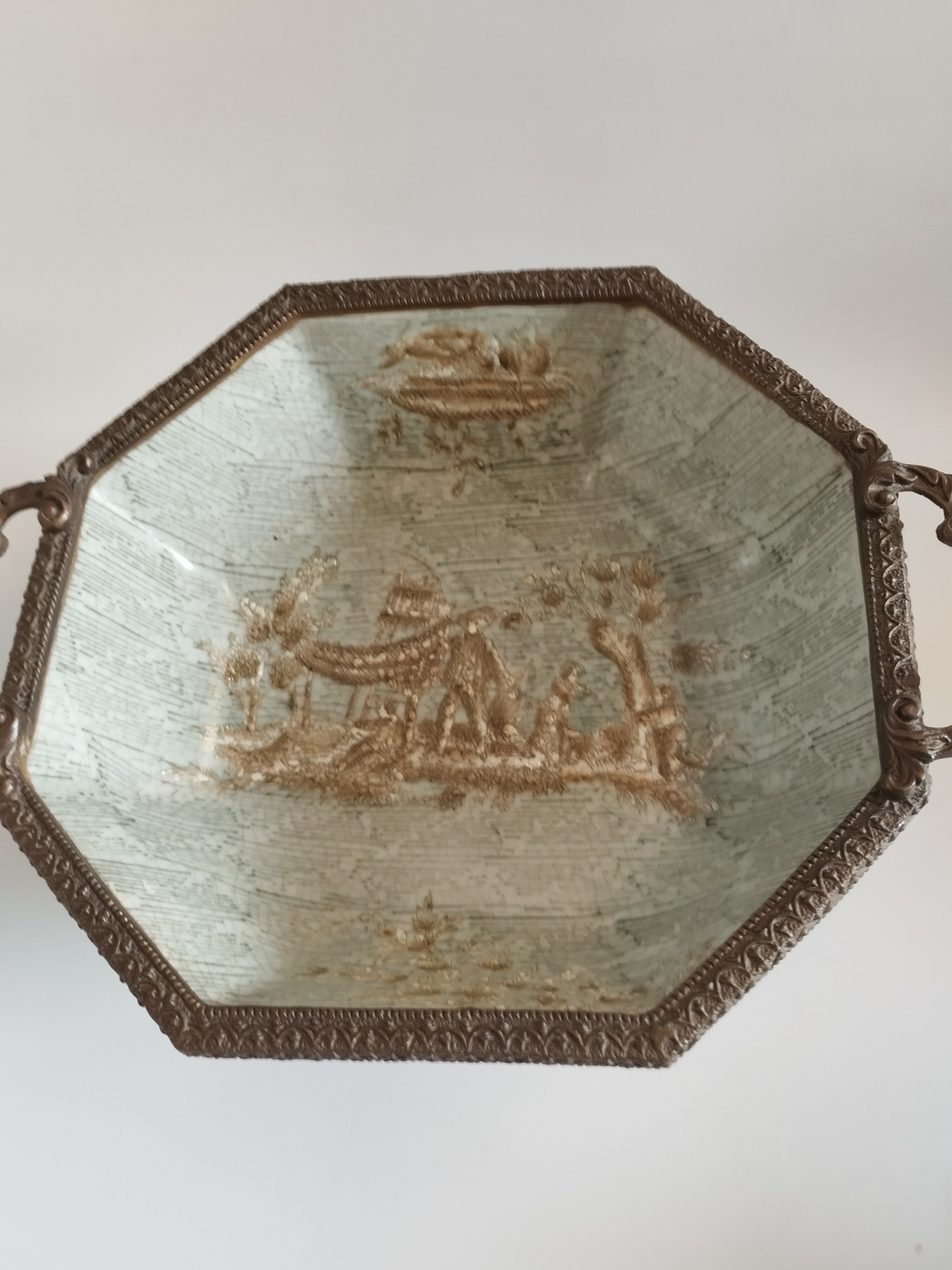 Komplet z ceramiki spękanej w okuciach z mosiądzu składający się z żardiniery ośmiokątnej, dwóch paterek podłużnych z rzeźbami ptaszków oraz wazonika.