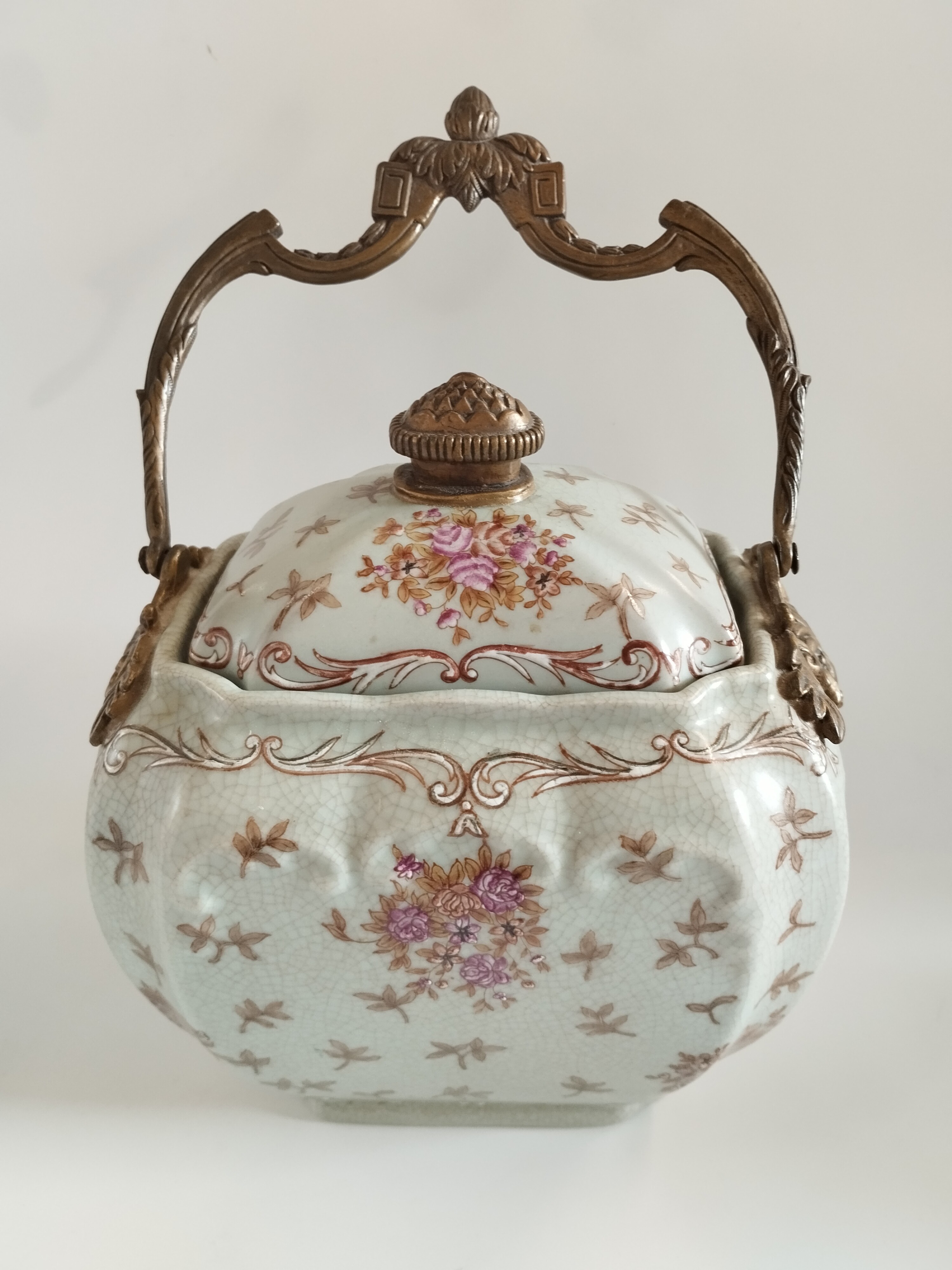 Pojemnik (bombonierka) z mosiężnym uchwytem. Ceramika spękana ręcznie zdobiona.