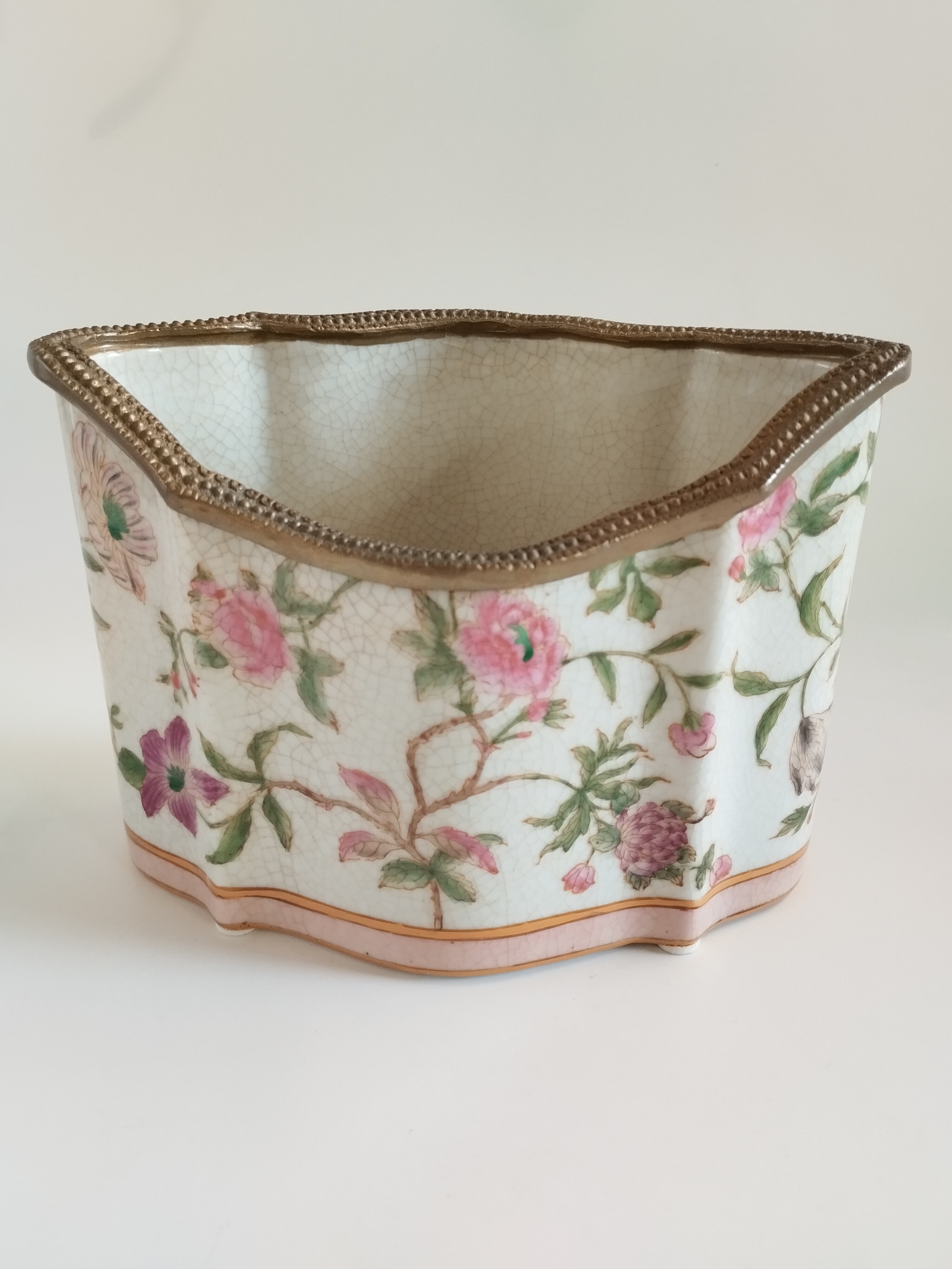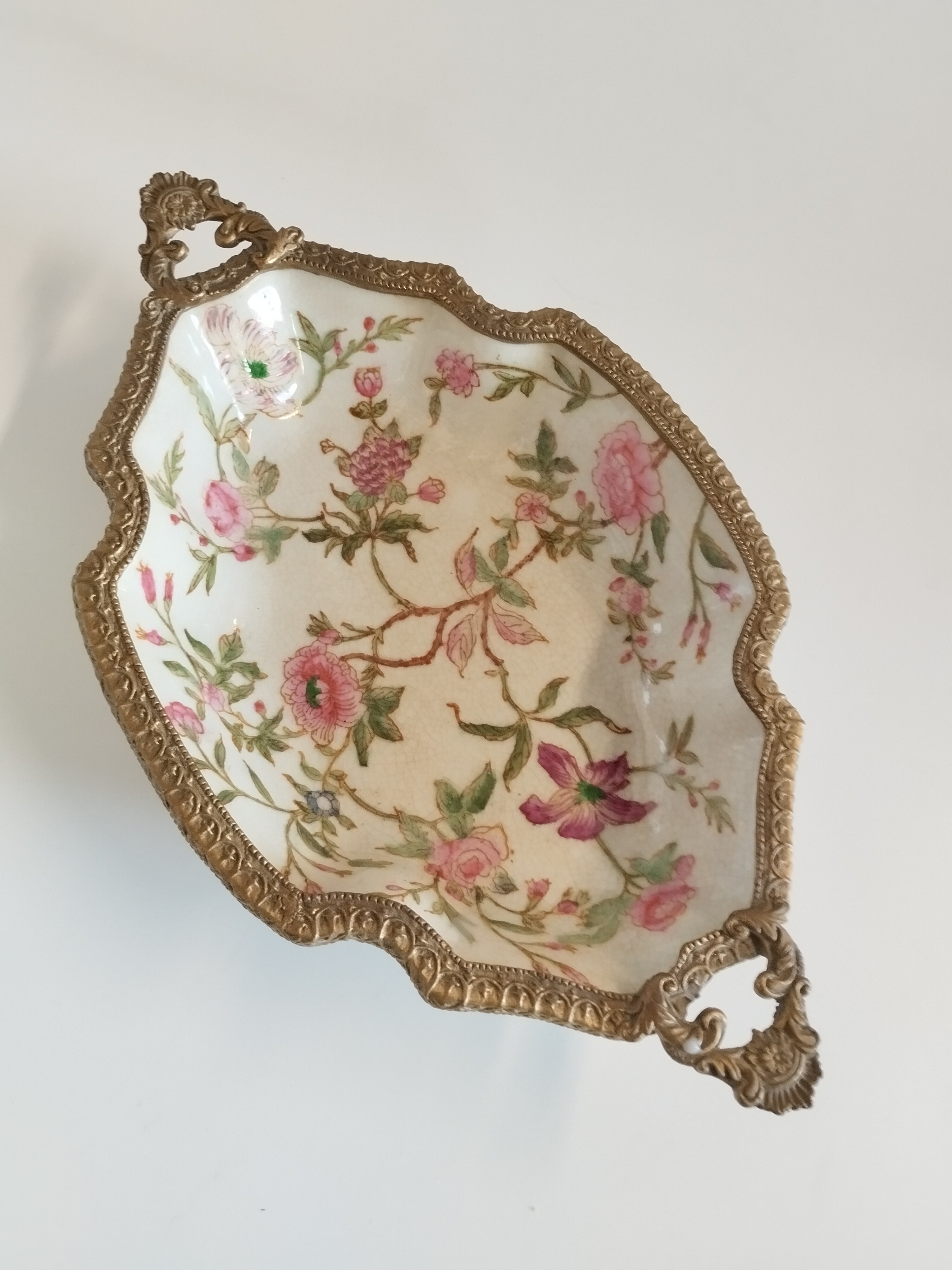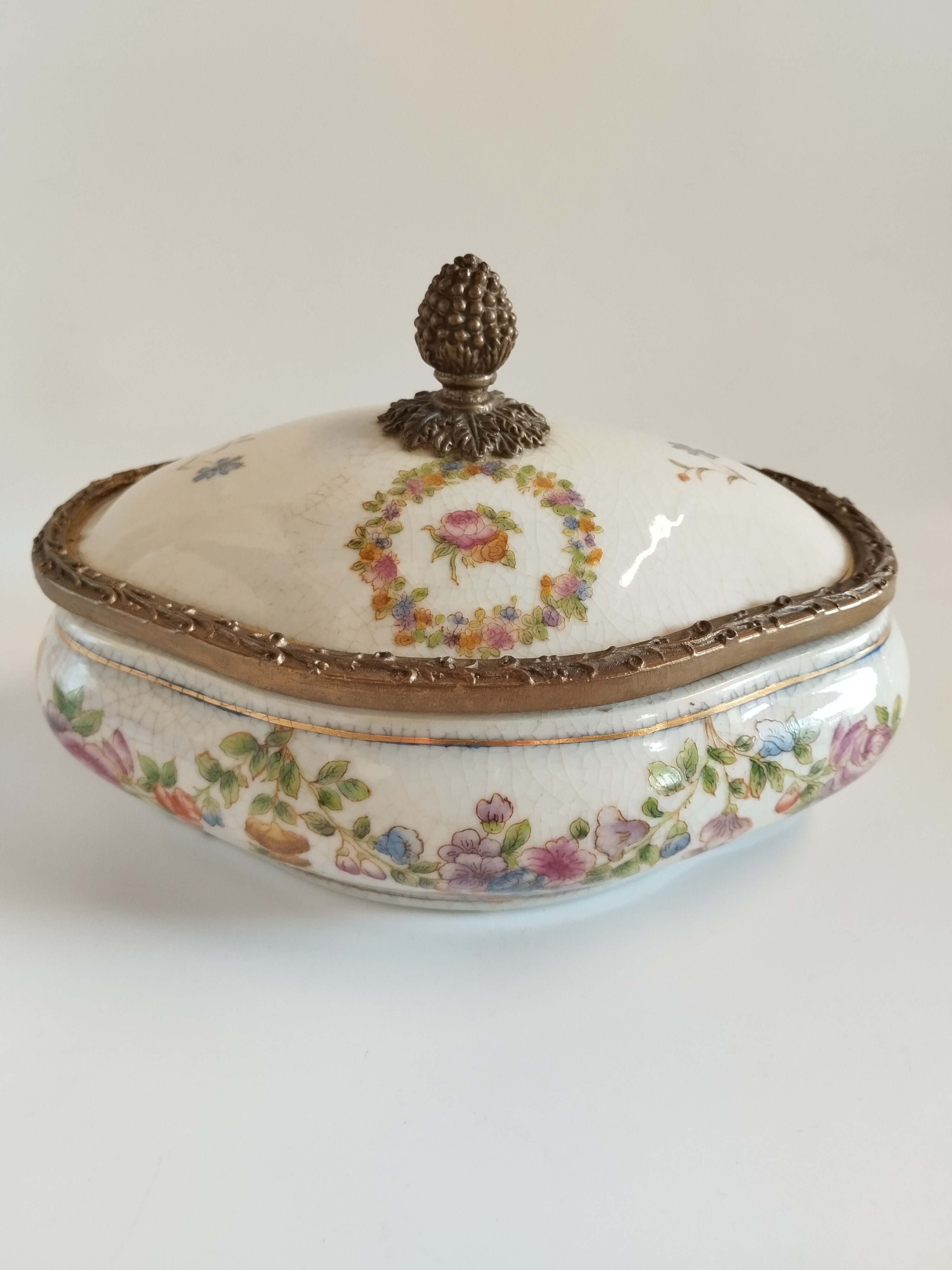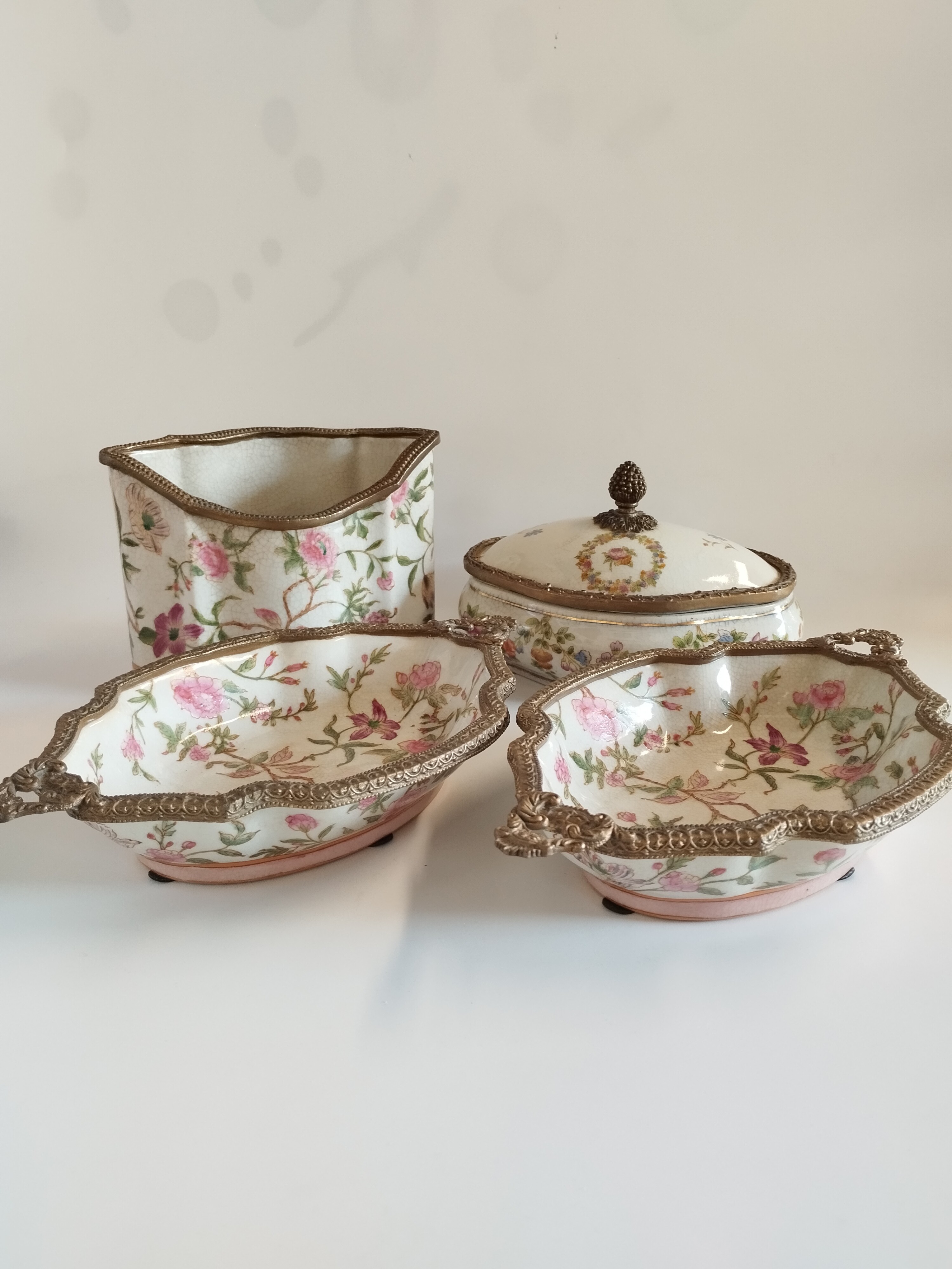 Komplet ceramiki spękanej ręcznie zdobionej składający się z czterech elementów: pudełeczka, dwóch podłużnych paterek oraz cukiernicy.