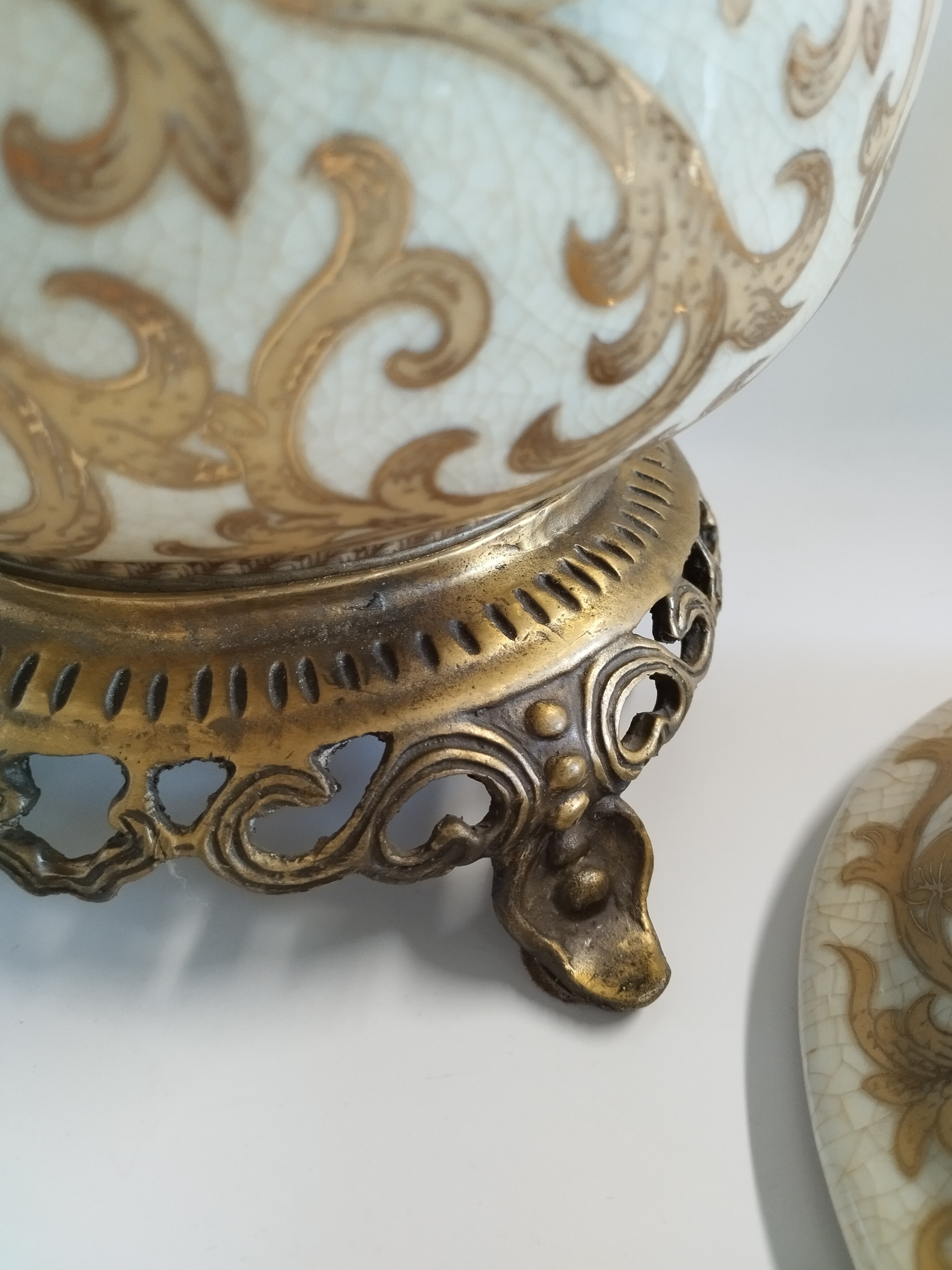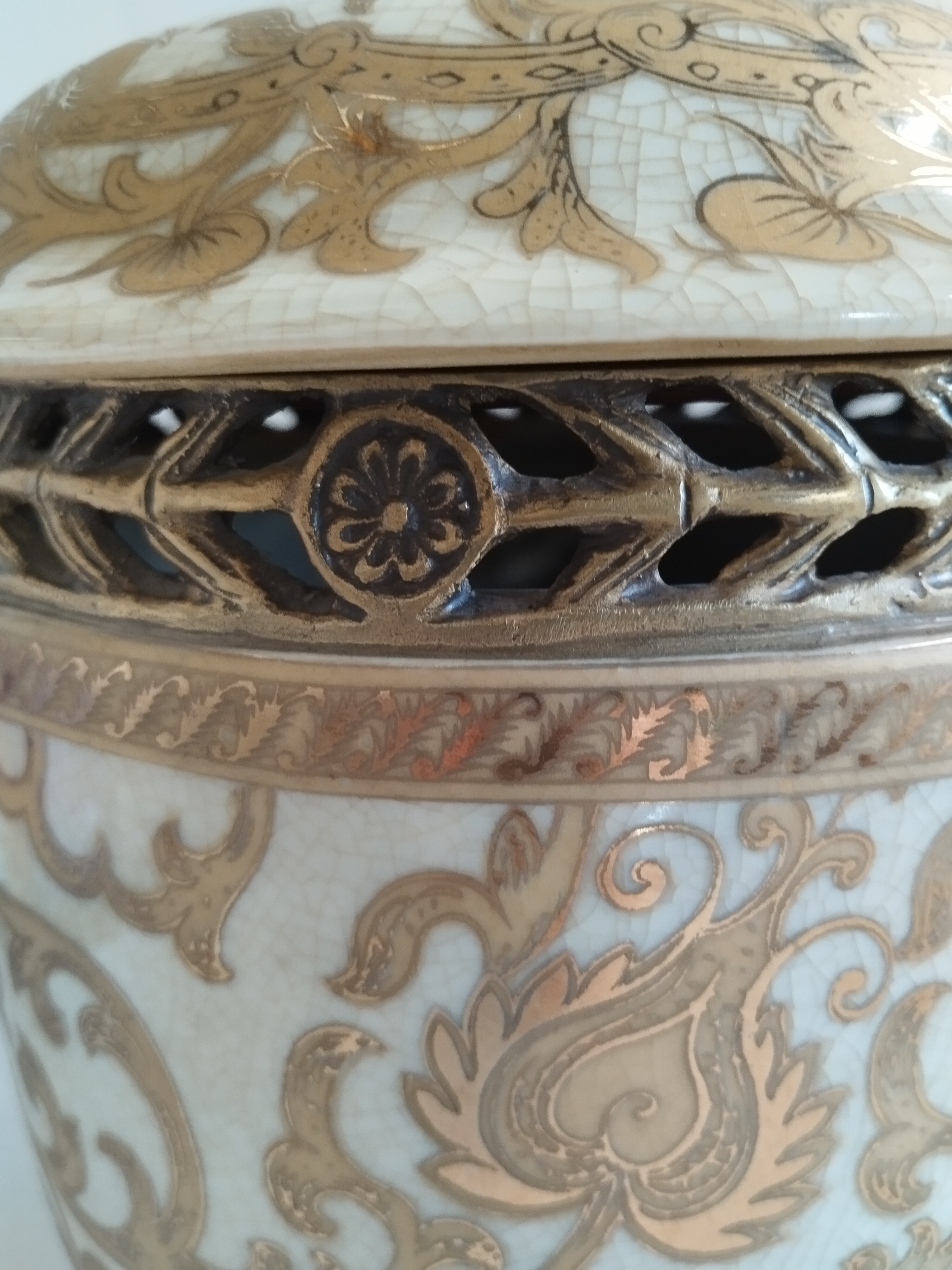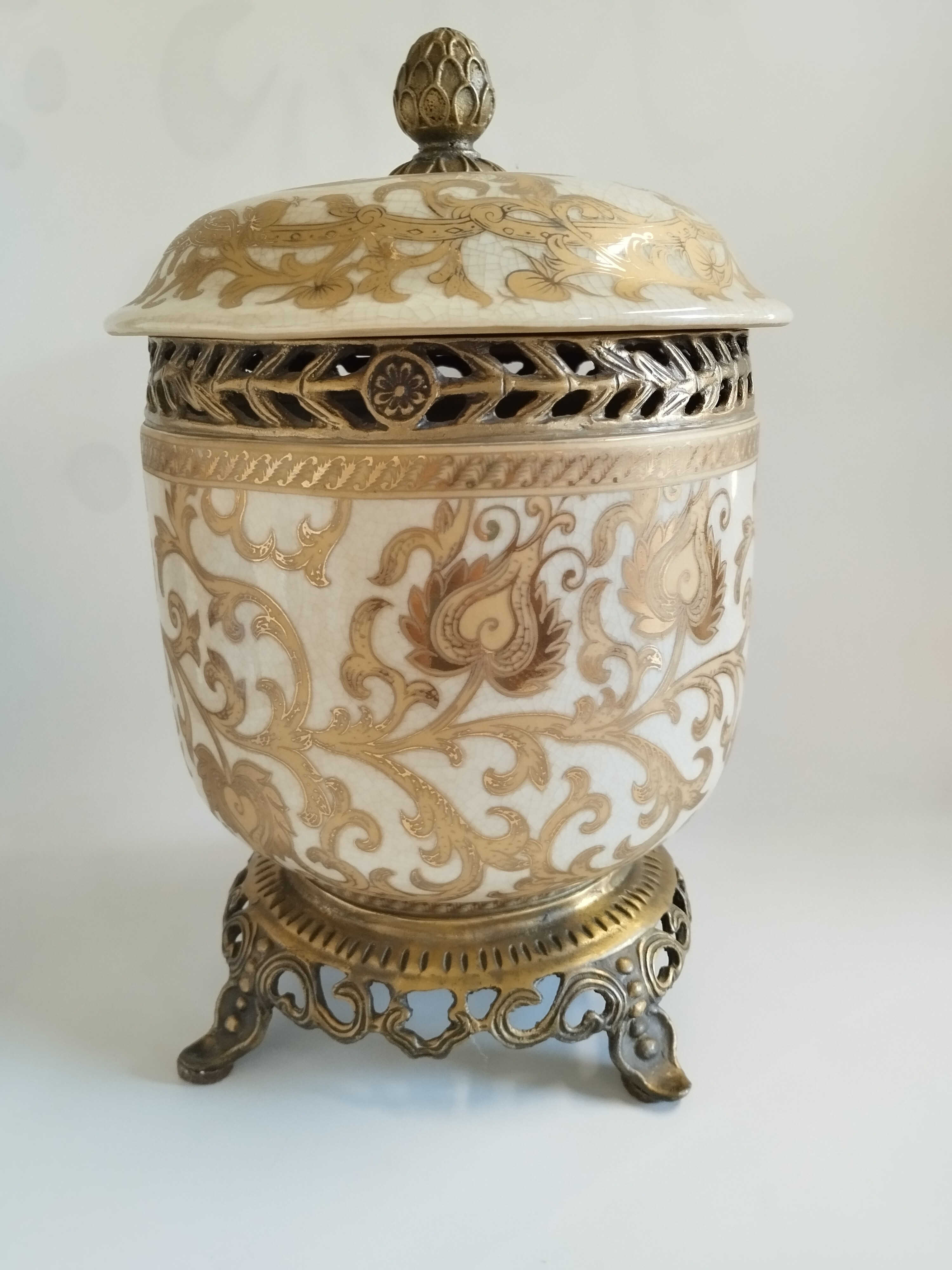 Wysoka szkatułka (bombonierka) wykonana z ceramiki spękanej ręcznie zdobionej i z elementami z mosiądzu..