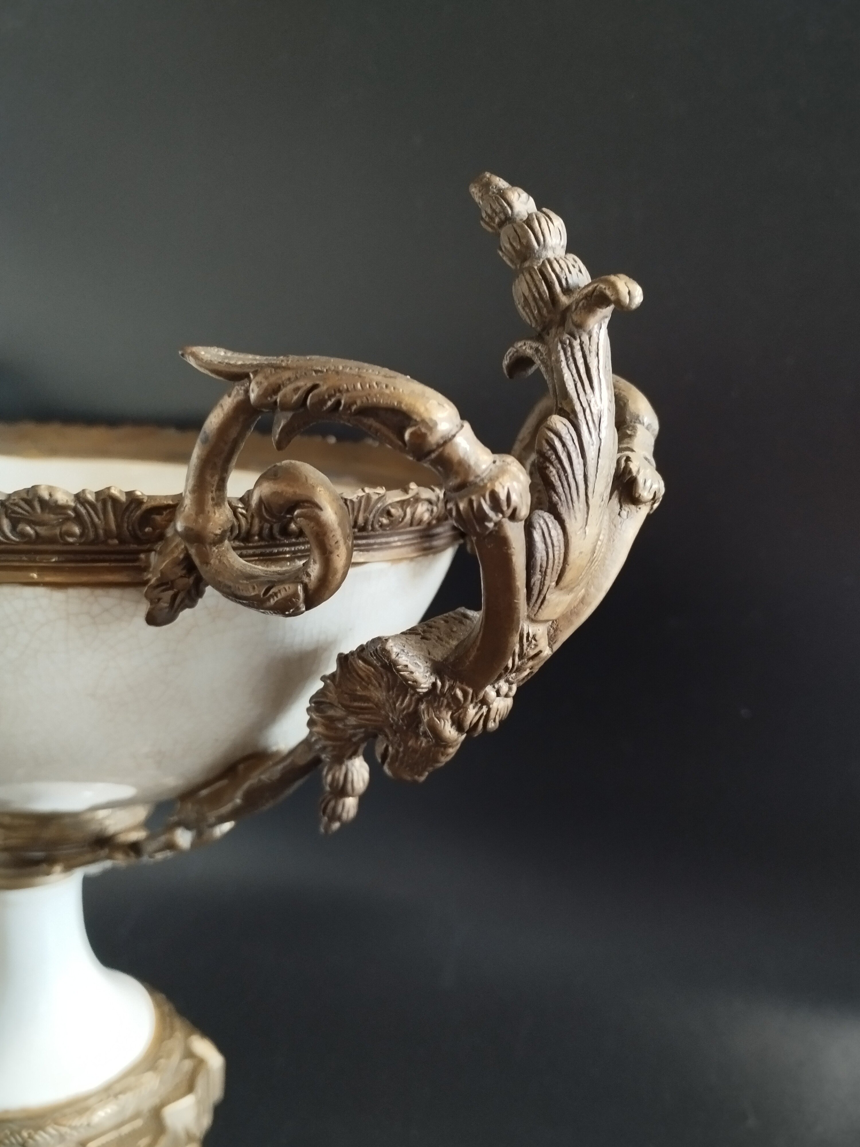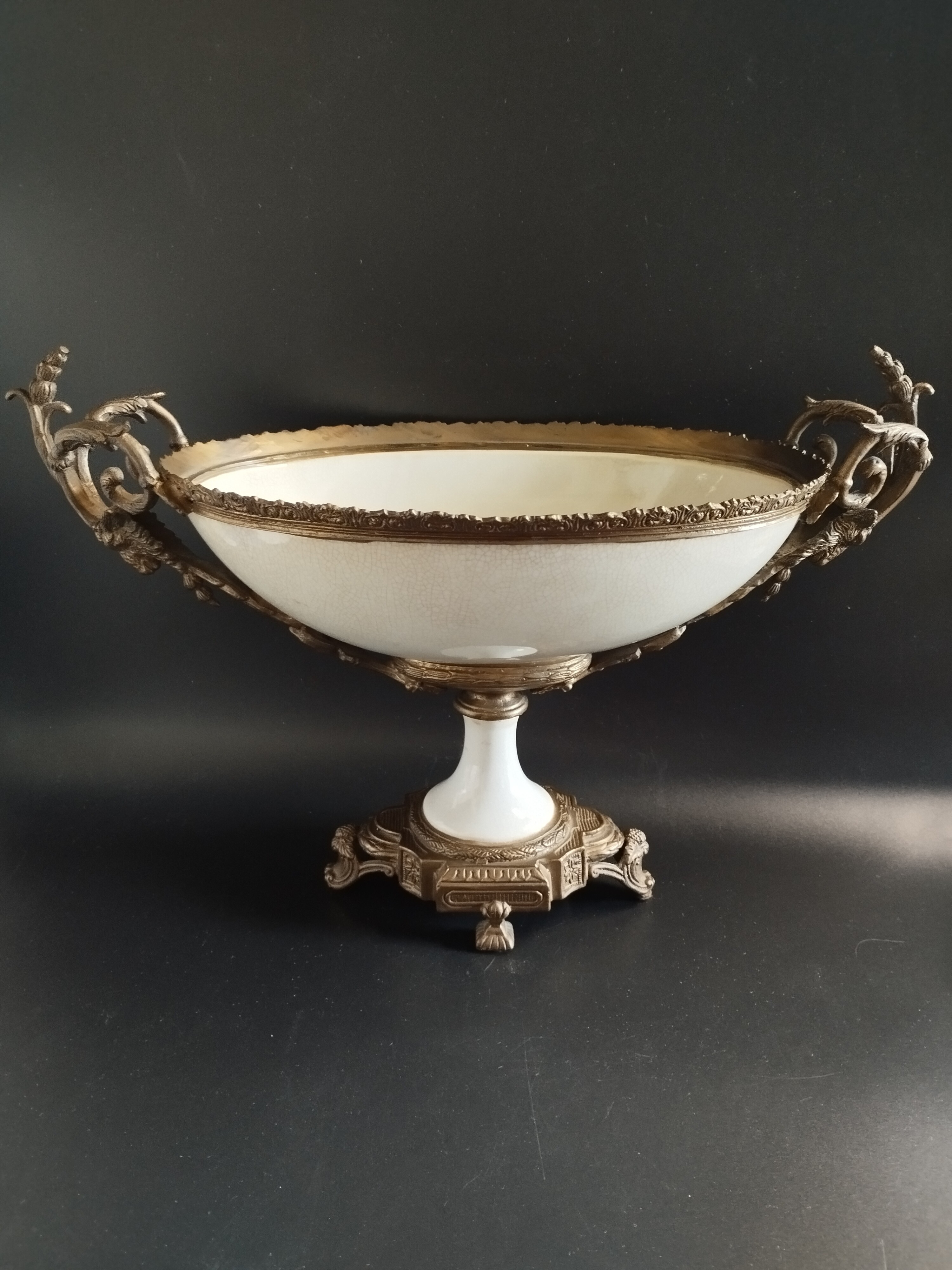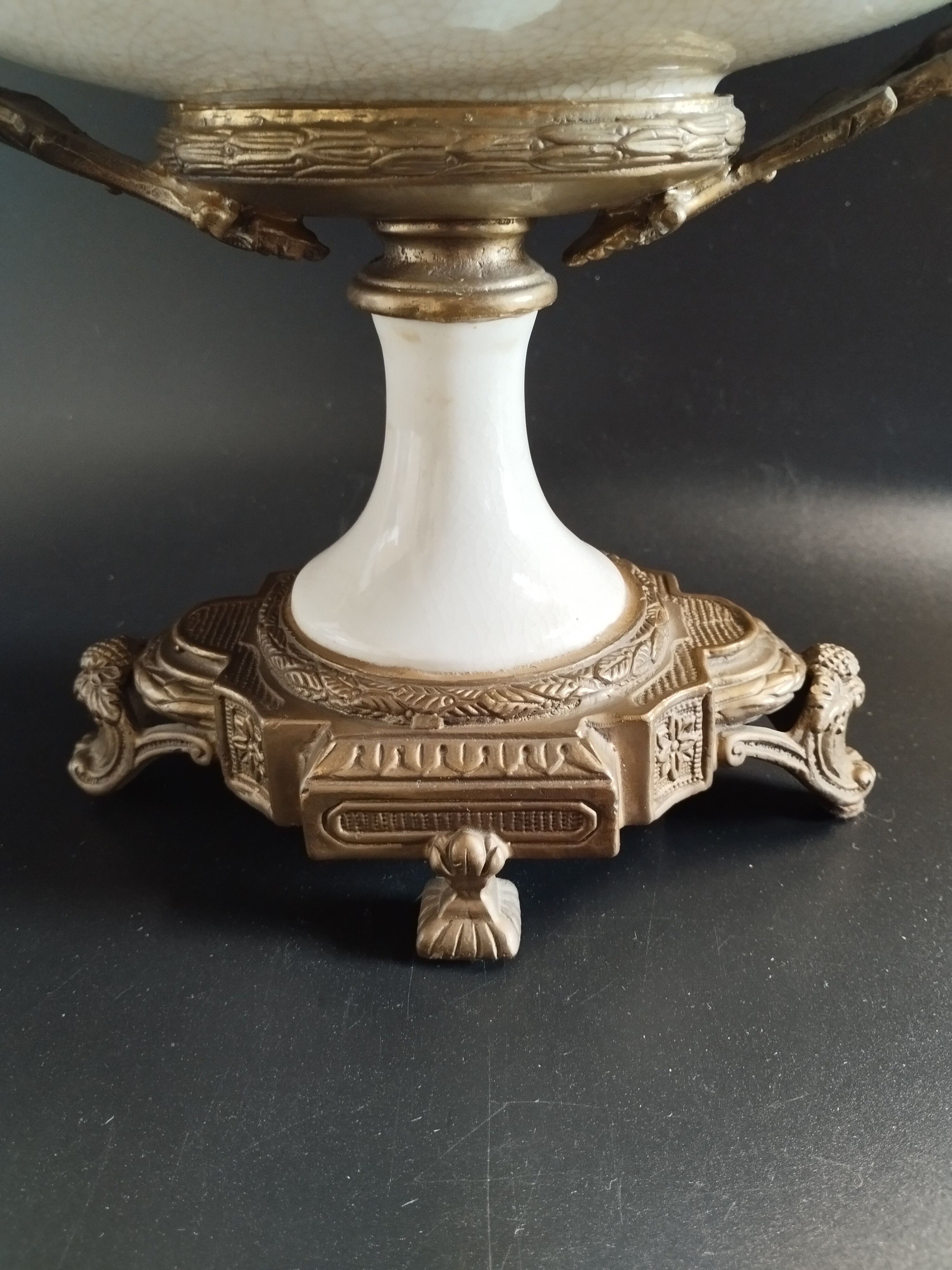 Piękna owocarka na nóżce wykonana z ceramiki spękanej, zdobiona elementami z mosiądzu.