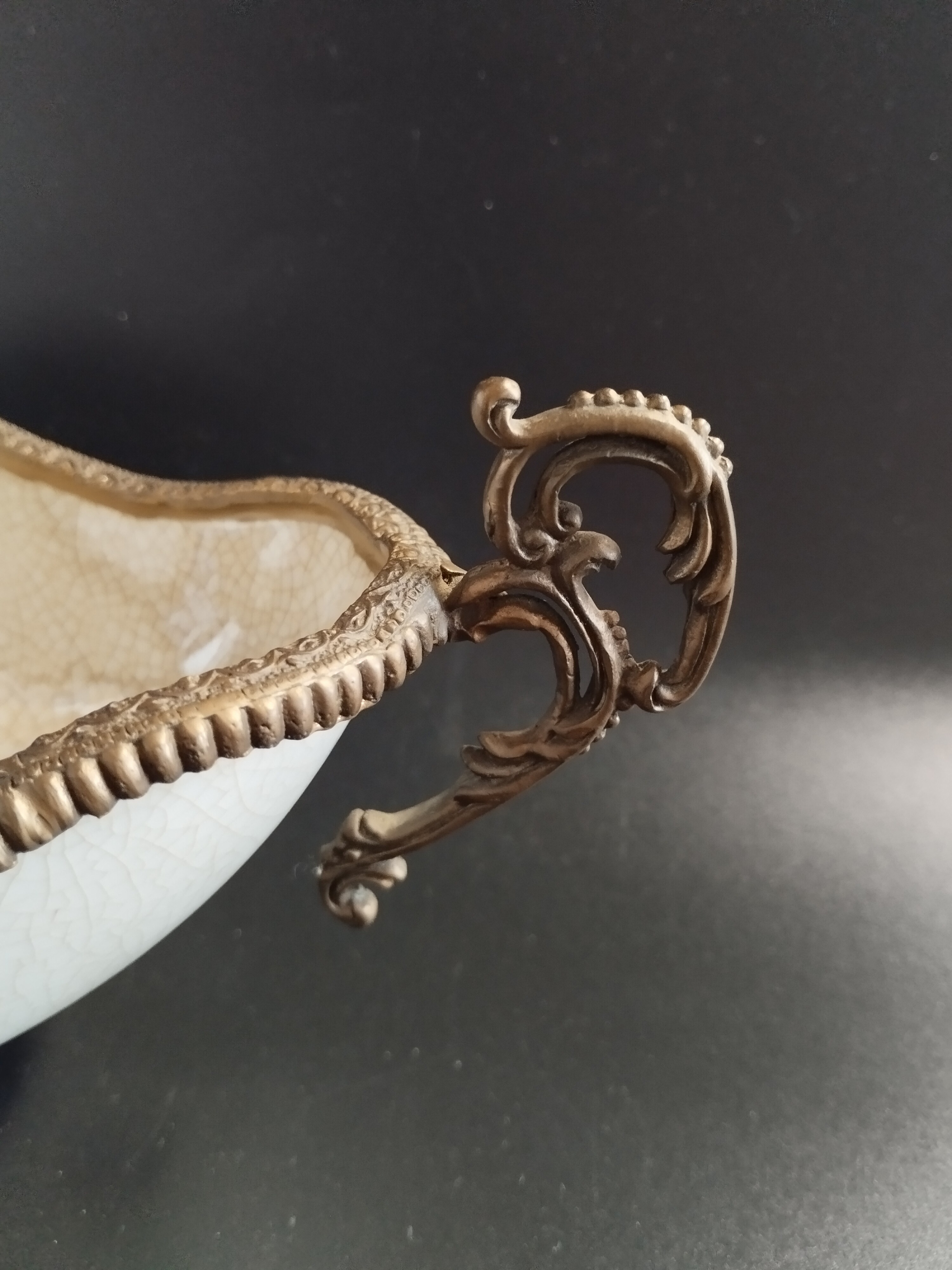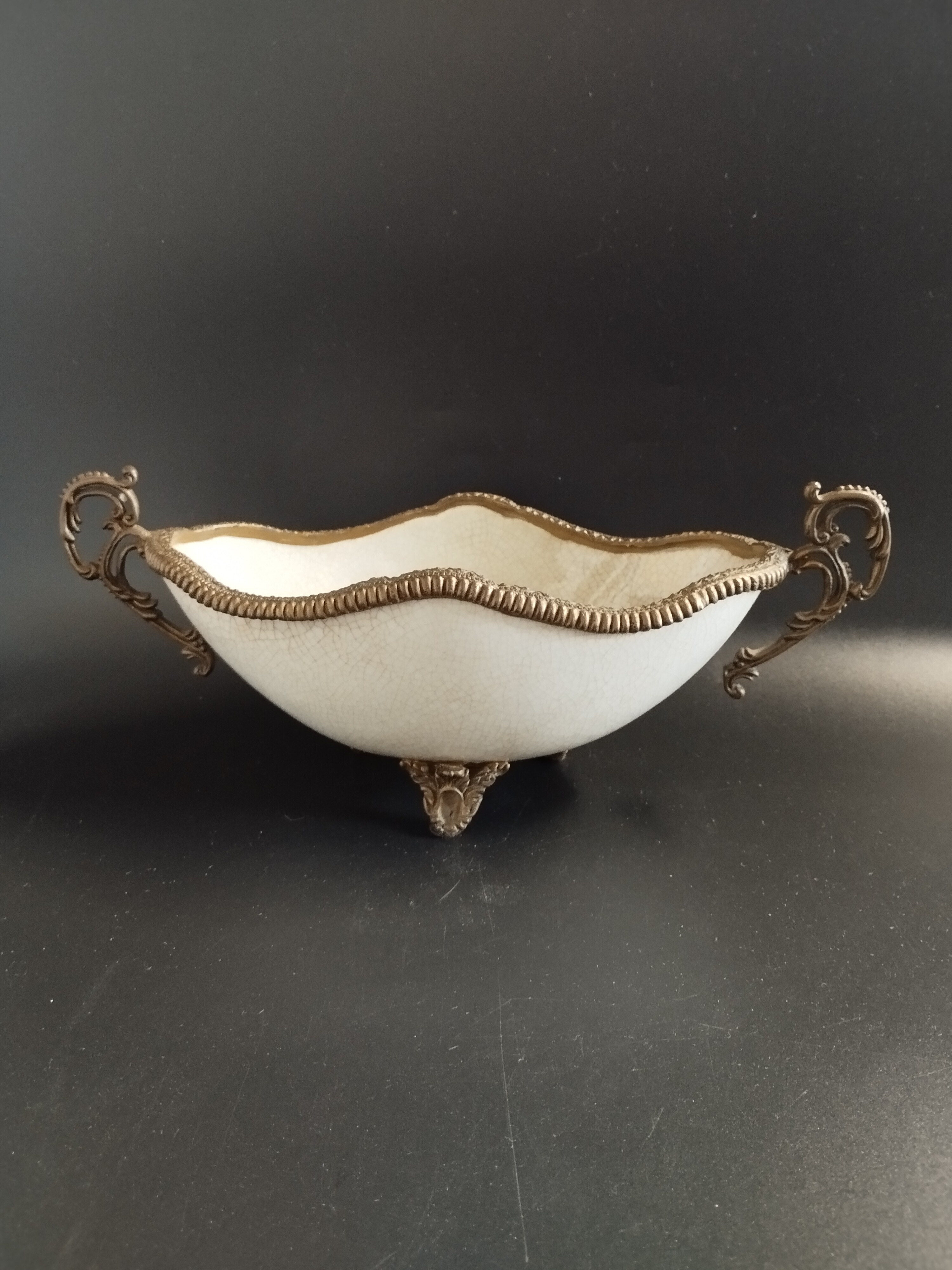 Paterka na słodycze wykonana z ceramiki spękanej i zdobiona elementami z mosiądzu.