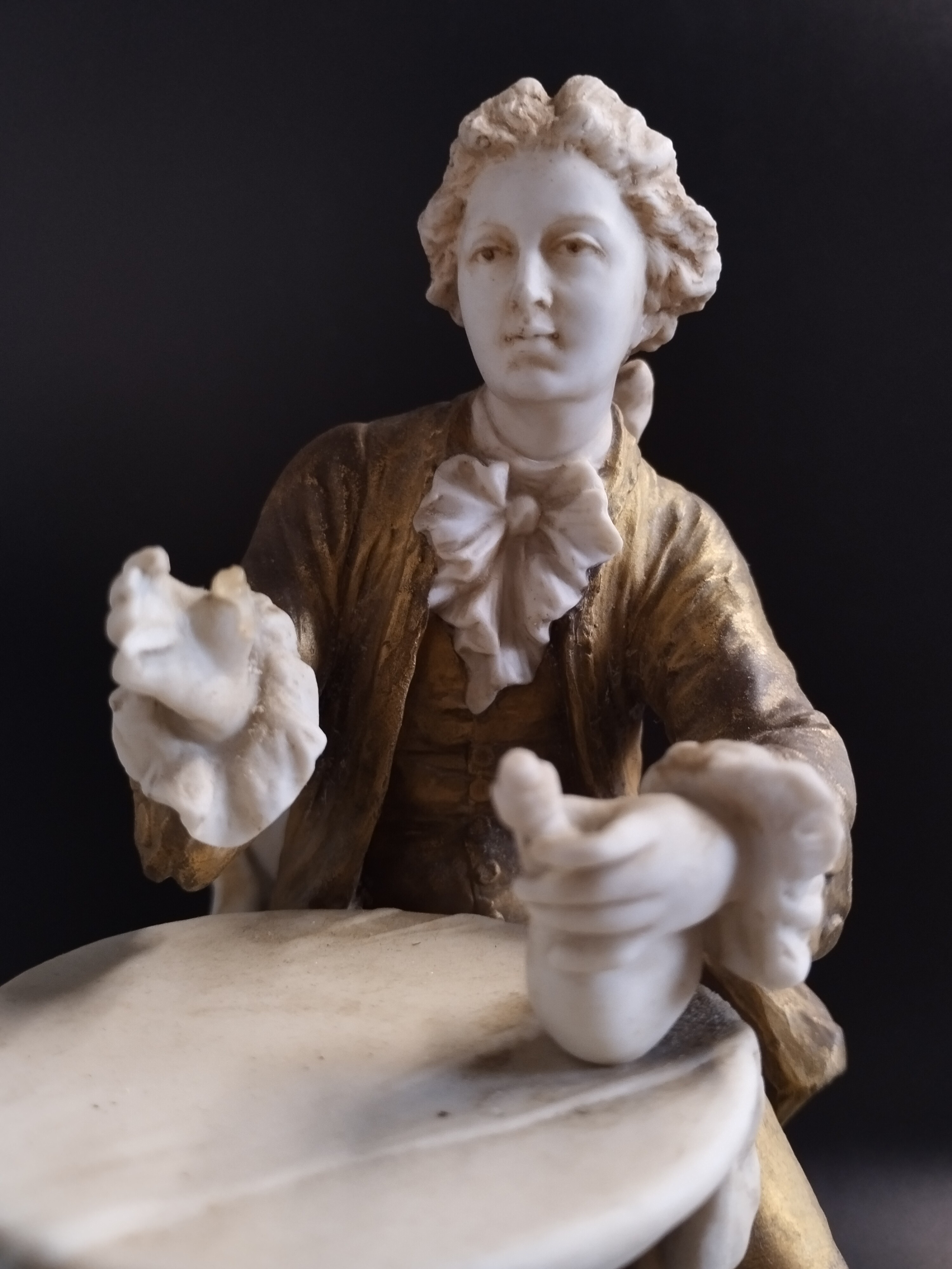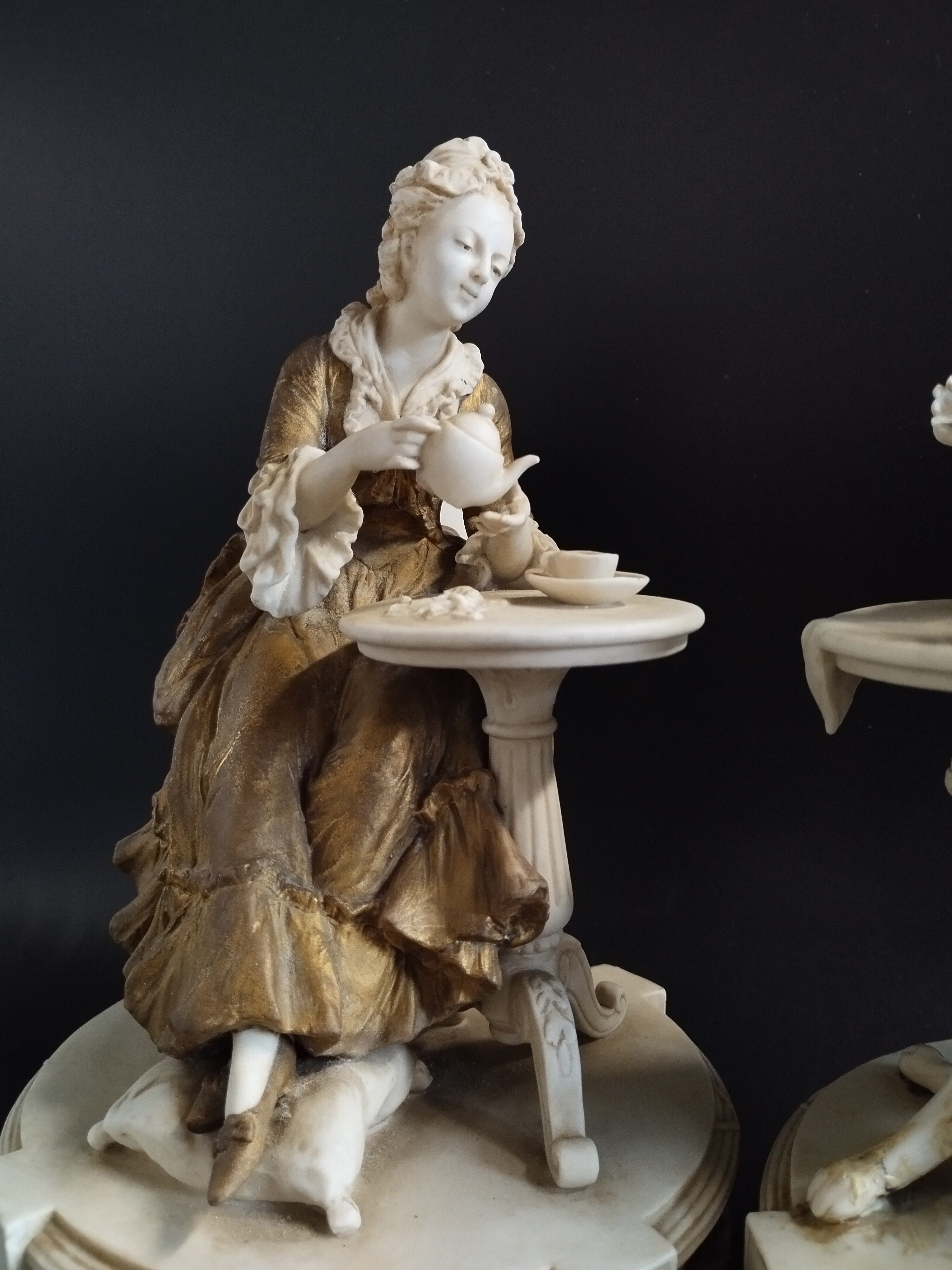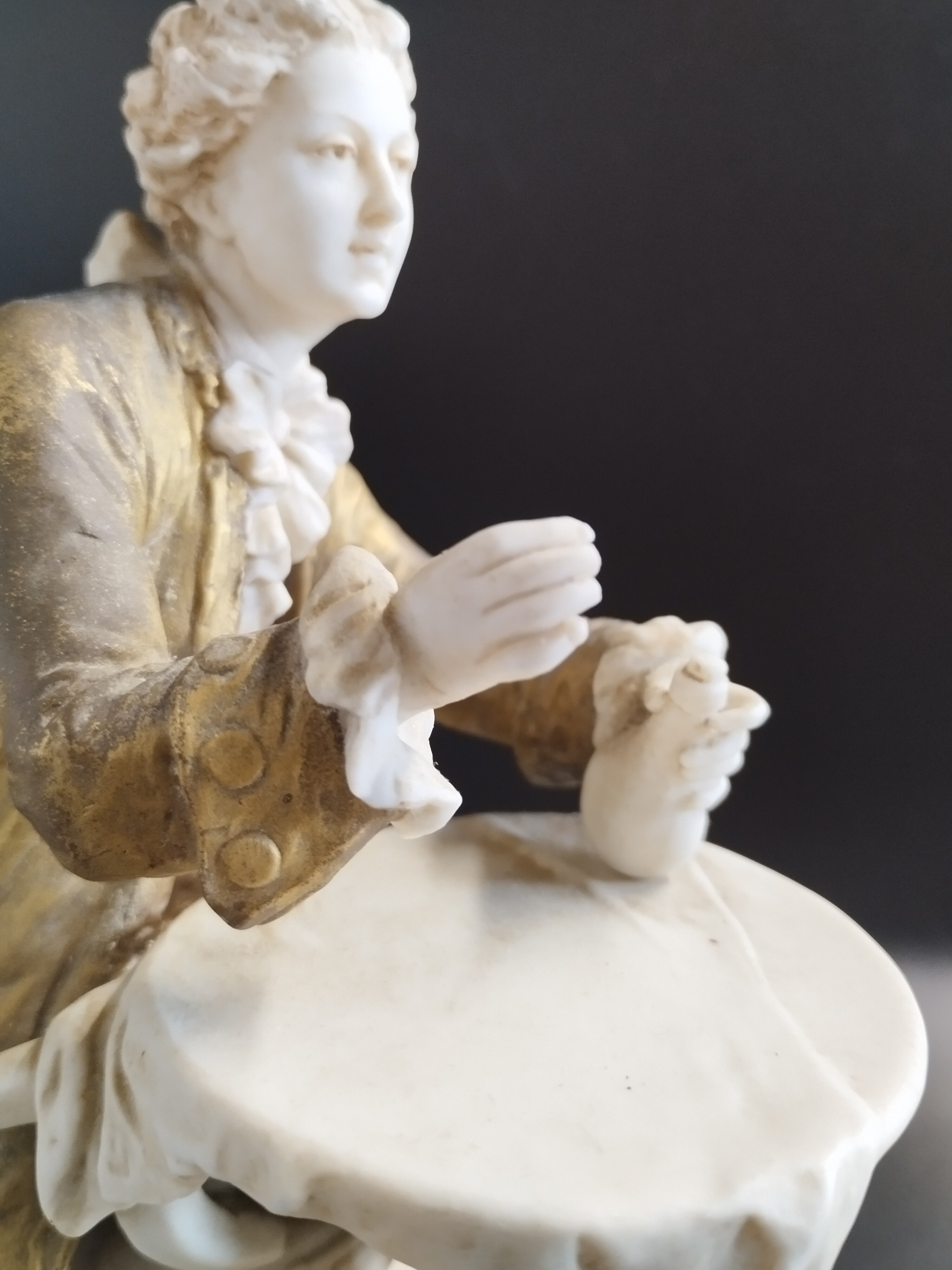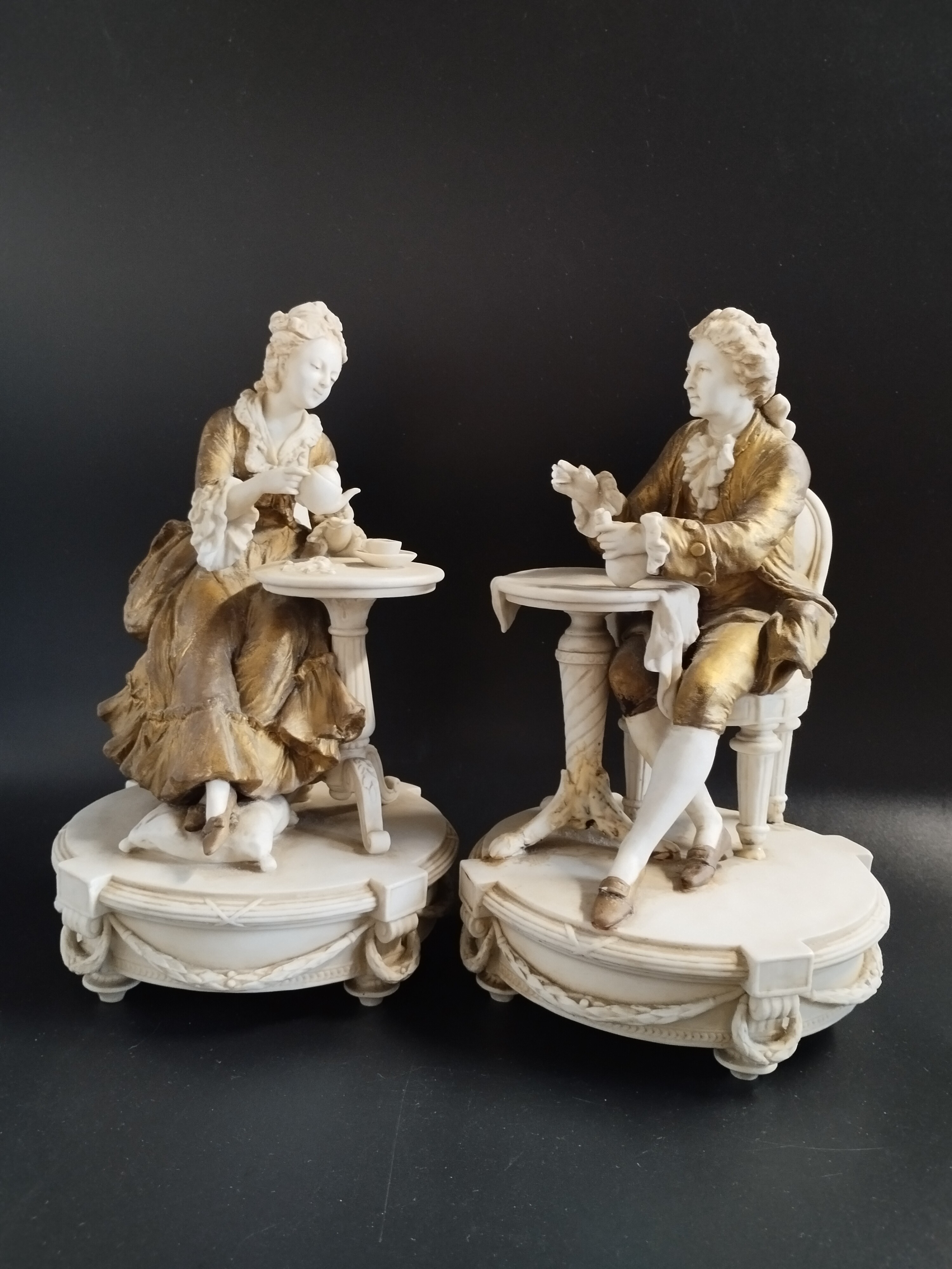 Dwie przepiękne figurki z XIX wieku wykonane z porcelany biskwitowej. Zachowane w bardzo dobrym stanie. Niewielkie mankamenty w postaci braku 1 elementu (prawdopodobnie był to kielich trzymany w dłoni młodzieńca). Dłoń również nosi ślady naprawcze.