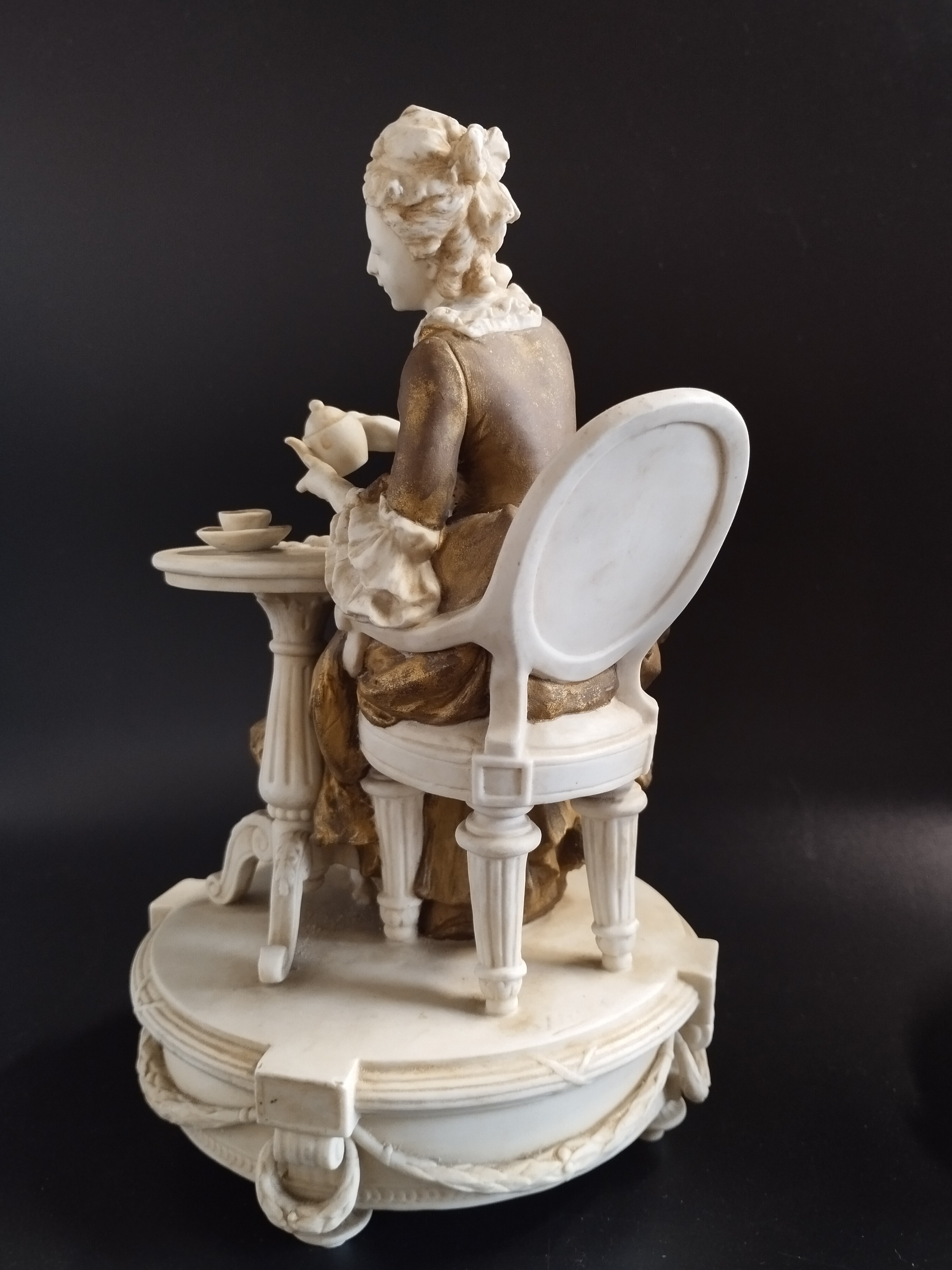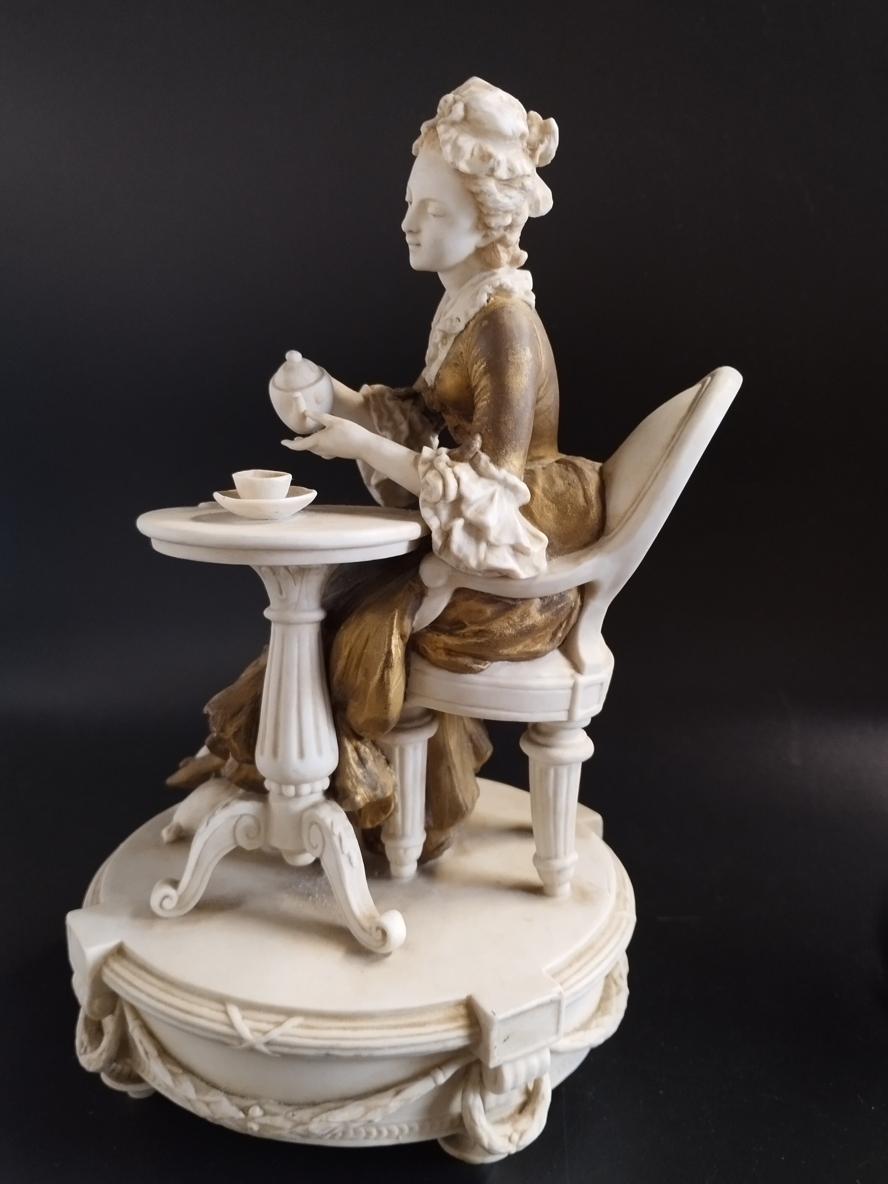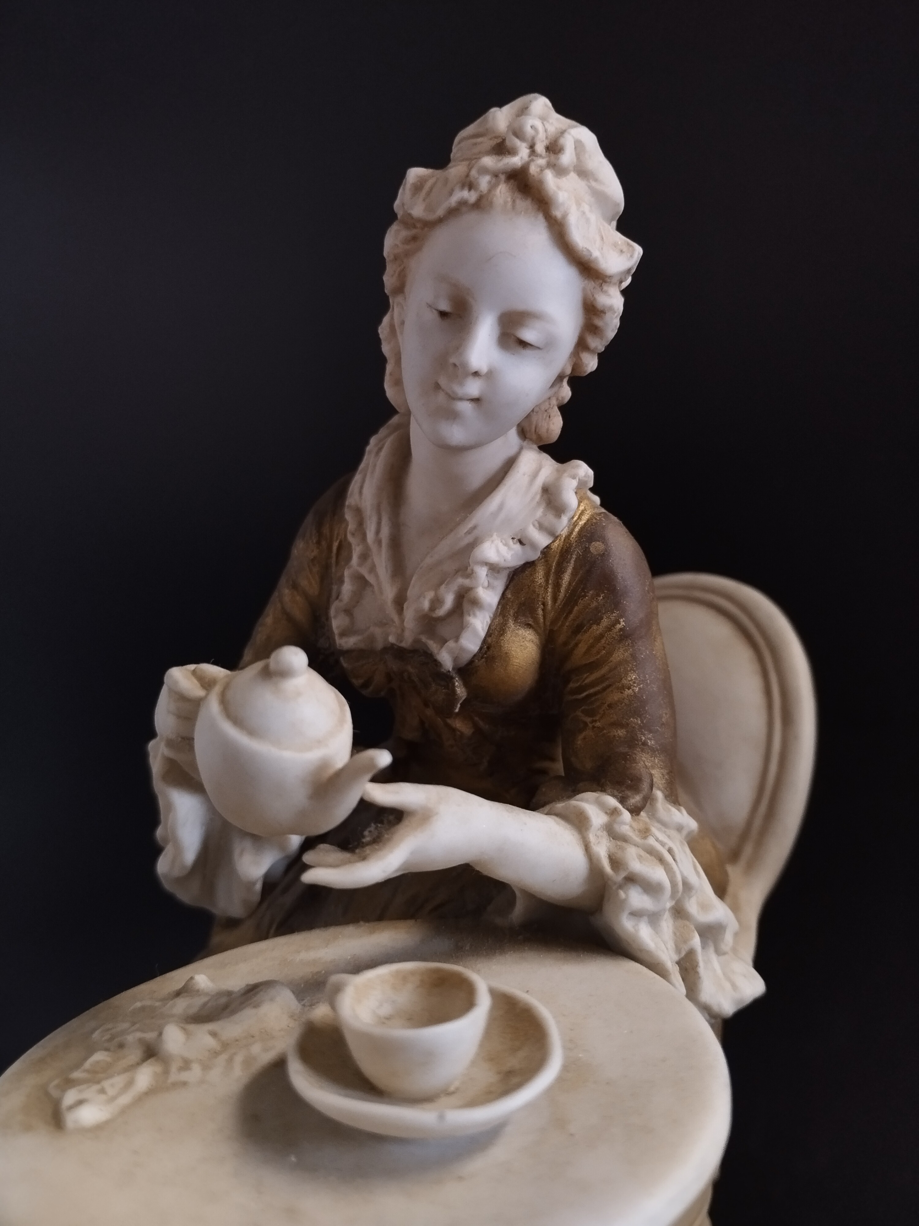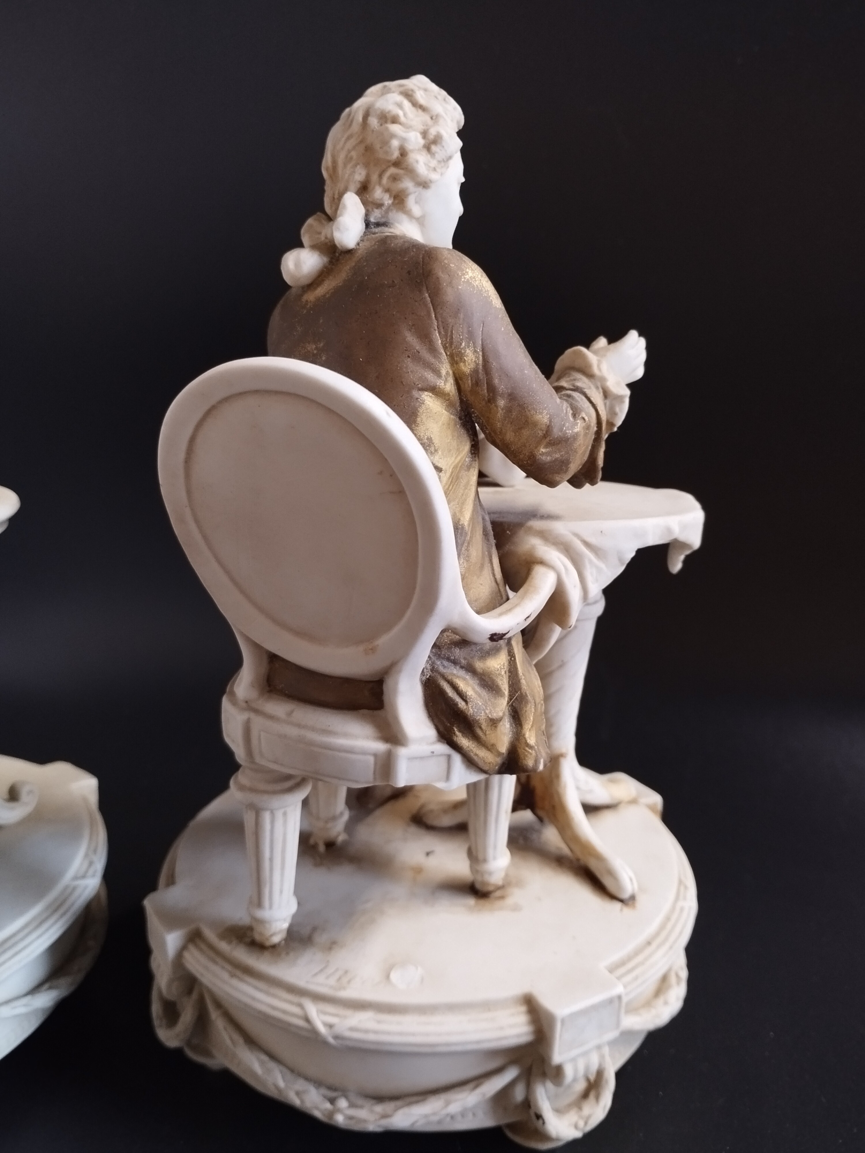 Dwie przepiękne figurki z XIX wieku wykonane z porcelany biskwitowej. Zachowane w bardzo dobrym stanie. Niewielkie mankamenty w postaci braku 1 elementu (prawdopodobnie był to kielich trzymany w dłoni młodzieńca). Dłoń również nosi ślady naprawcze.