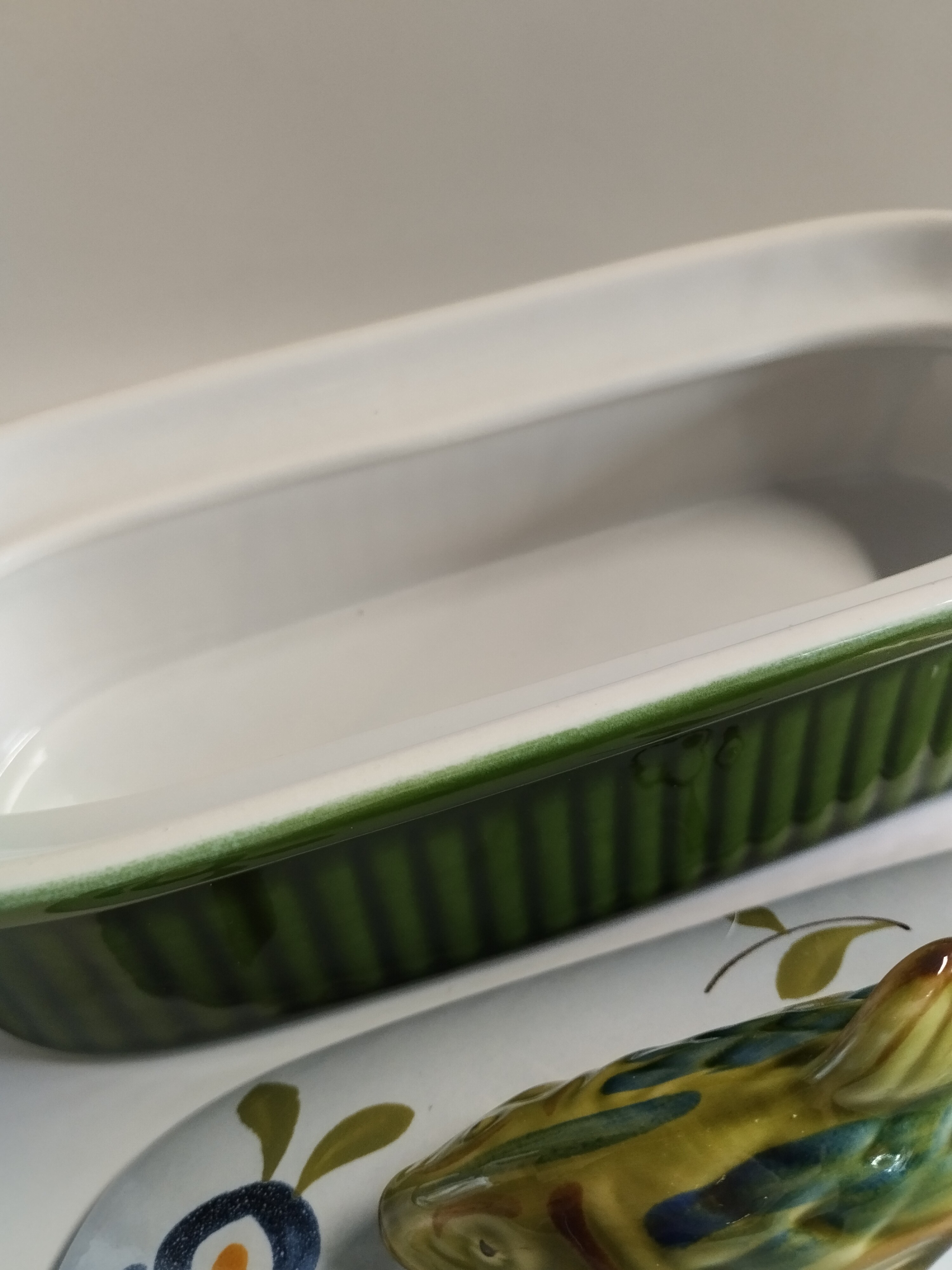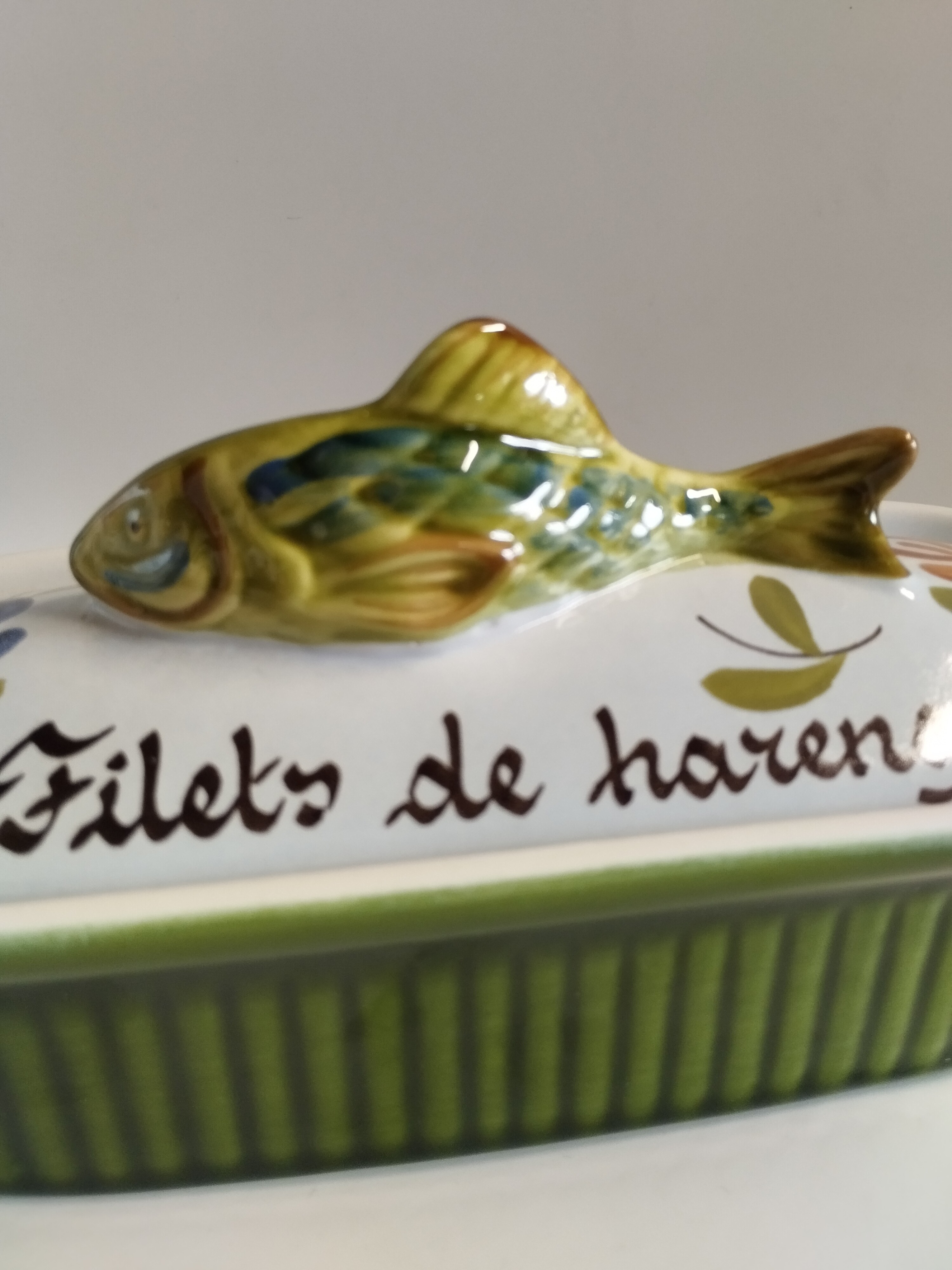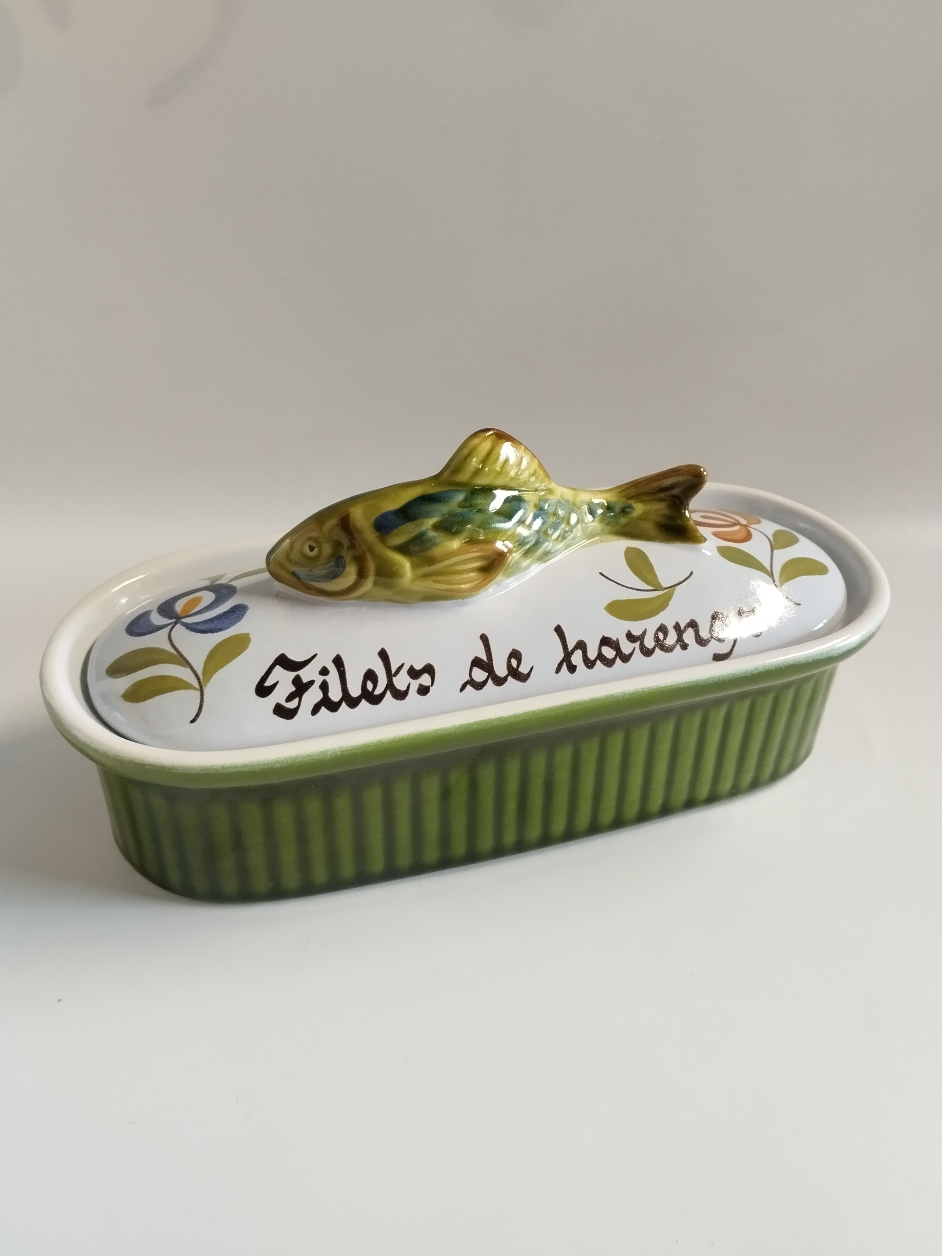 Podłużne naczynie ceramiczne z przykrywką na filety rybne.
