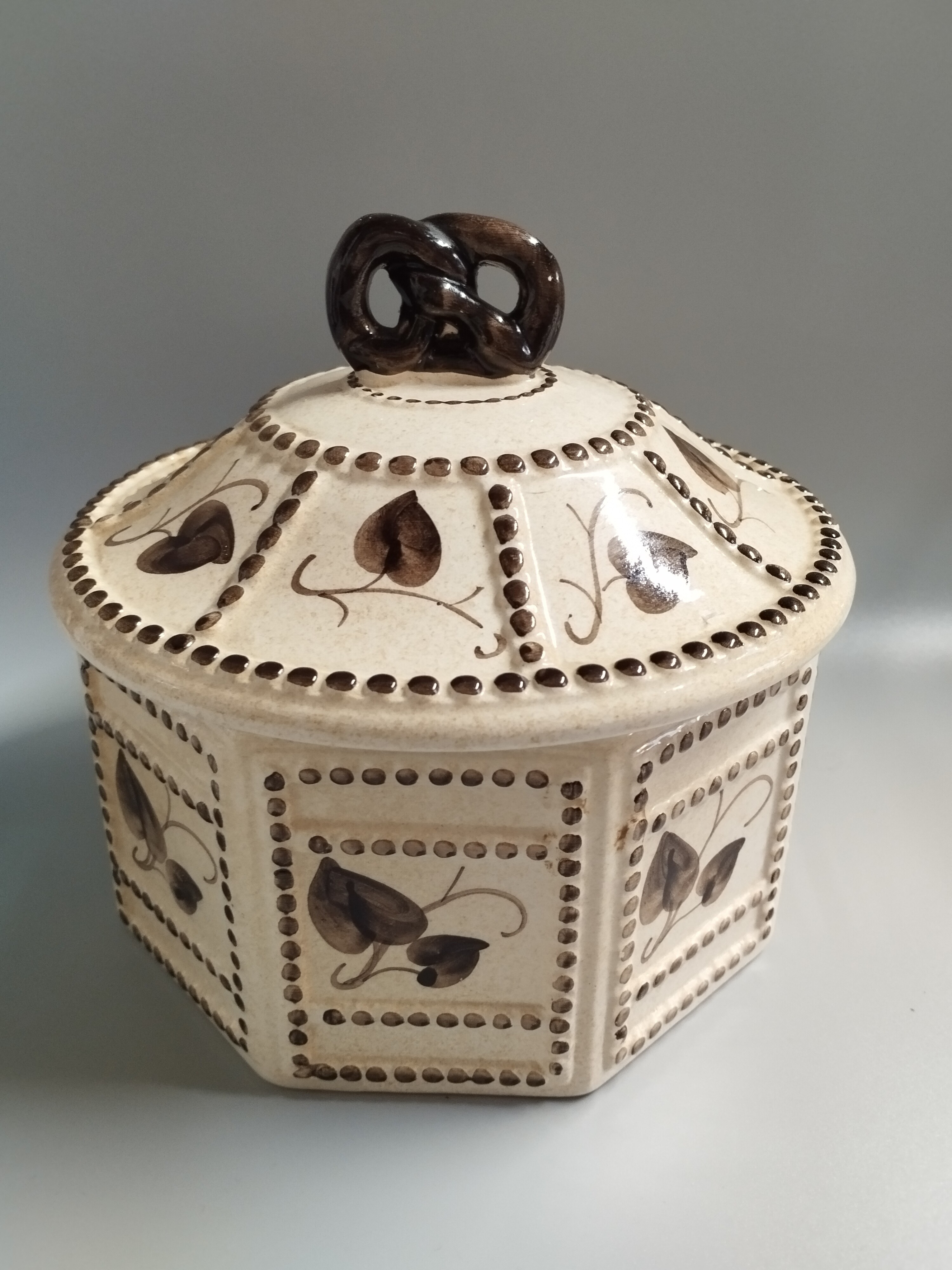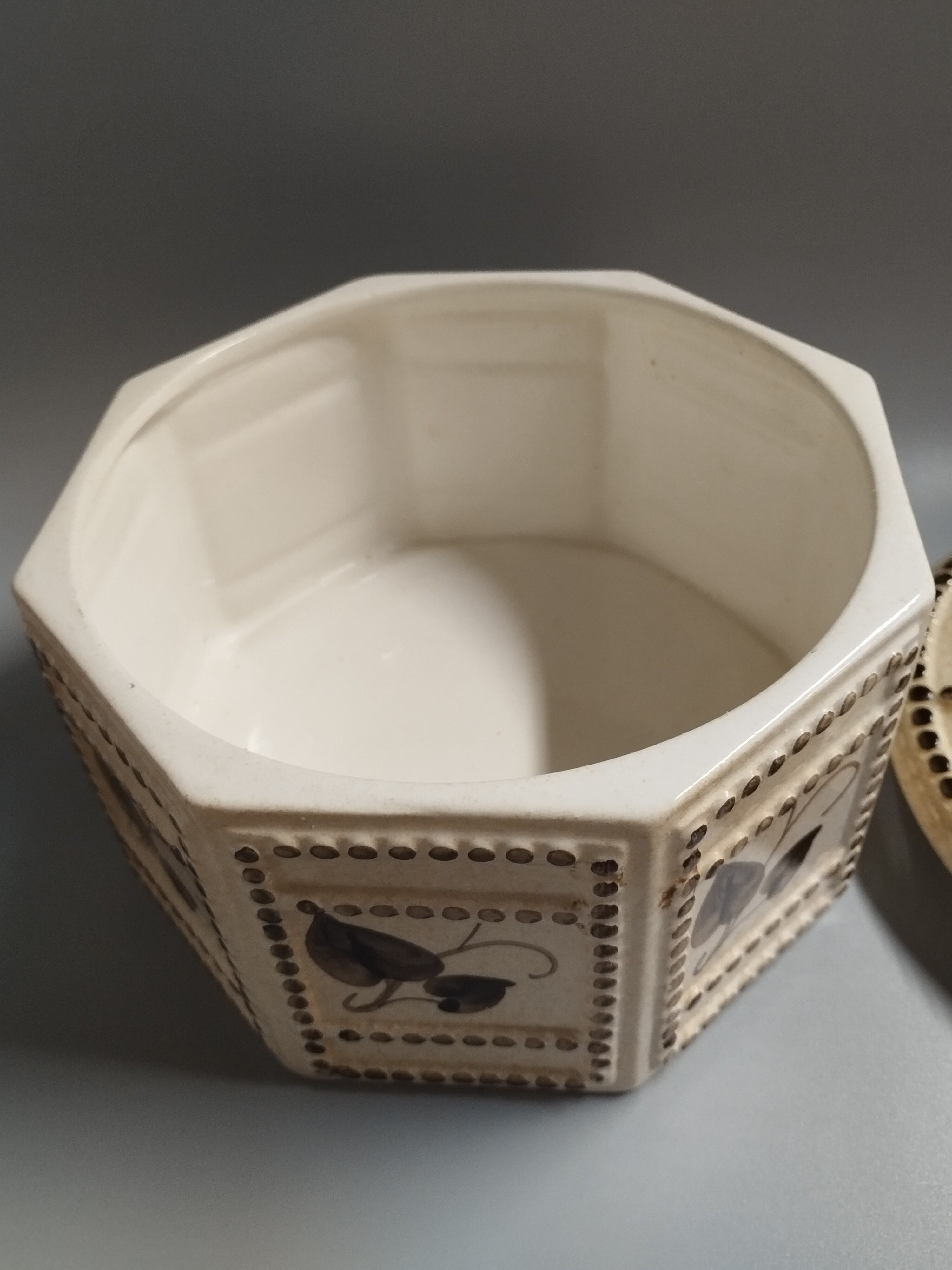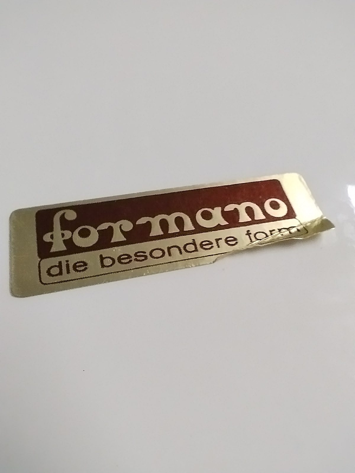 Ozdobna ceramiczna szkatułka ręcznie malowana. Marka Formano, Niemcy. Napis widoczny na naklejce, "die besondere form", oznacza "specjalną formę" lub "unikalny kształt".