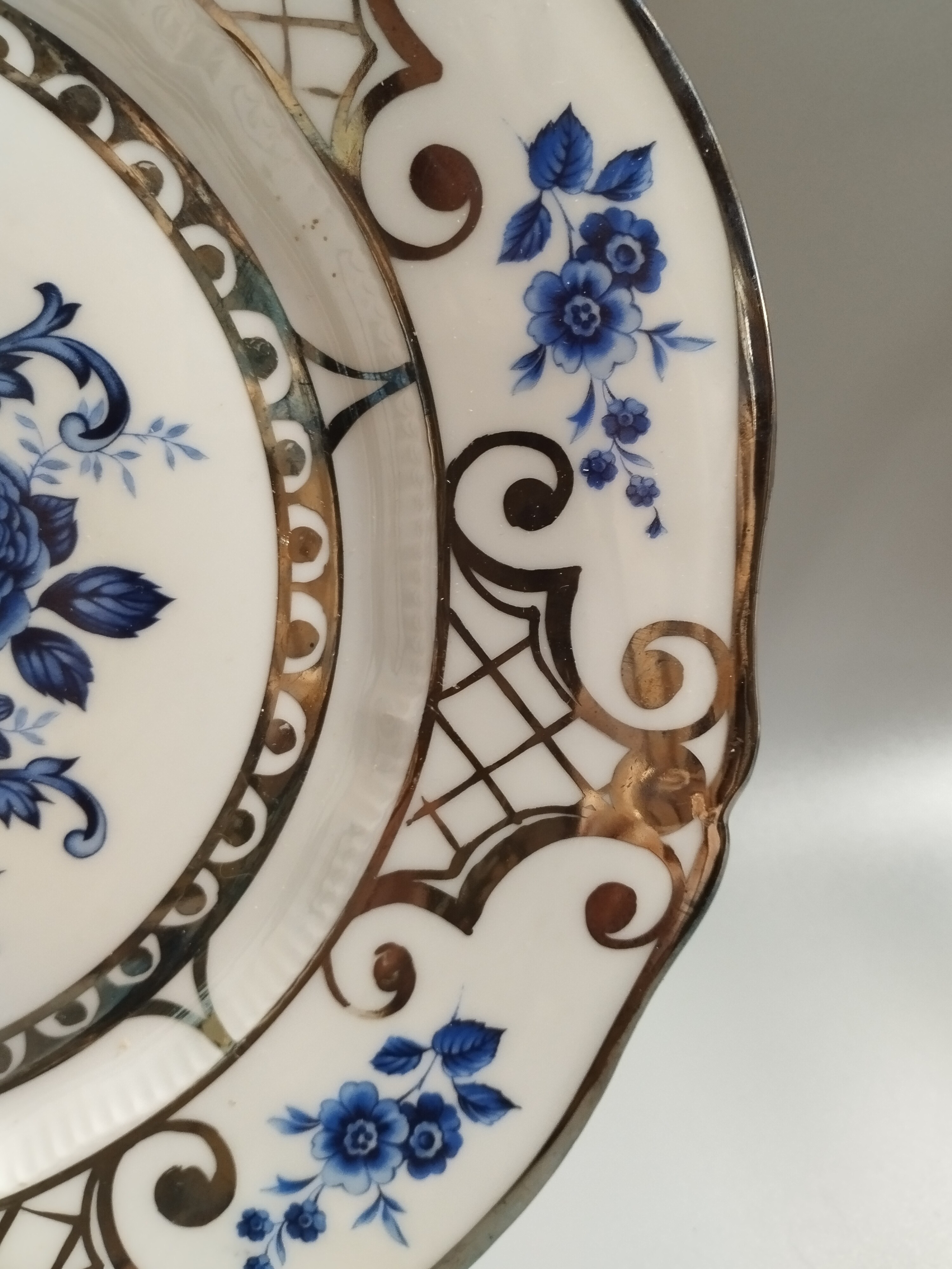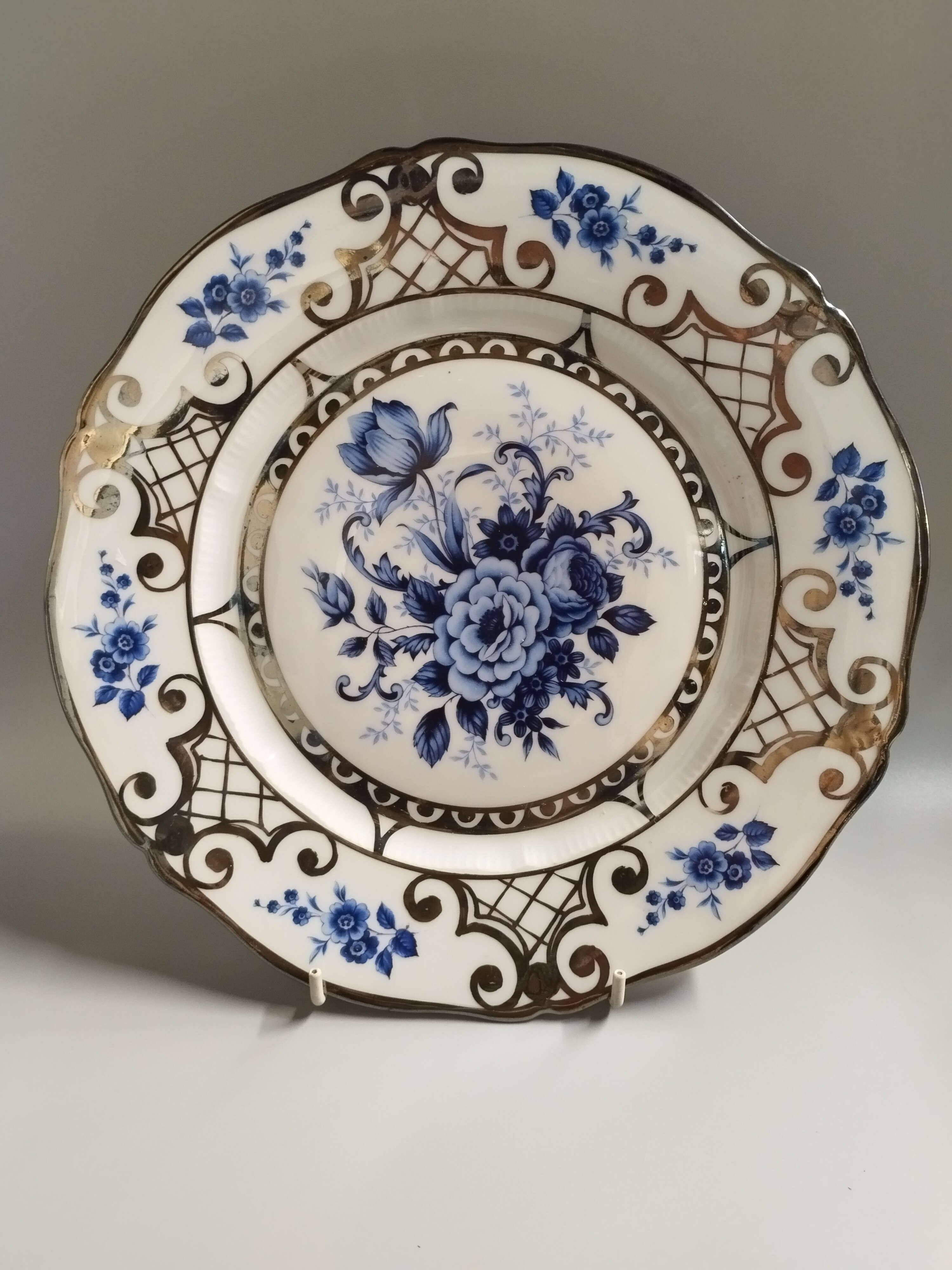 Ozdobna patera ręcznie dekorowana i platerowana srebrem. Sygnatura - Artlynsa. Posiada zaczep do powieszenia na ścianie.
