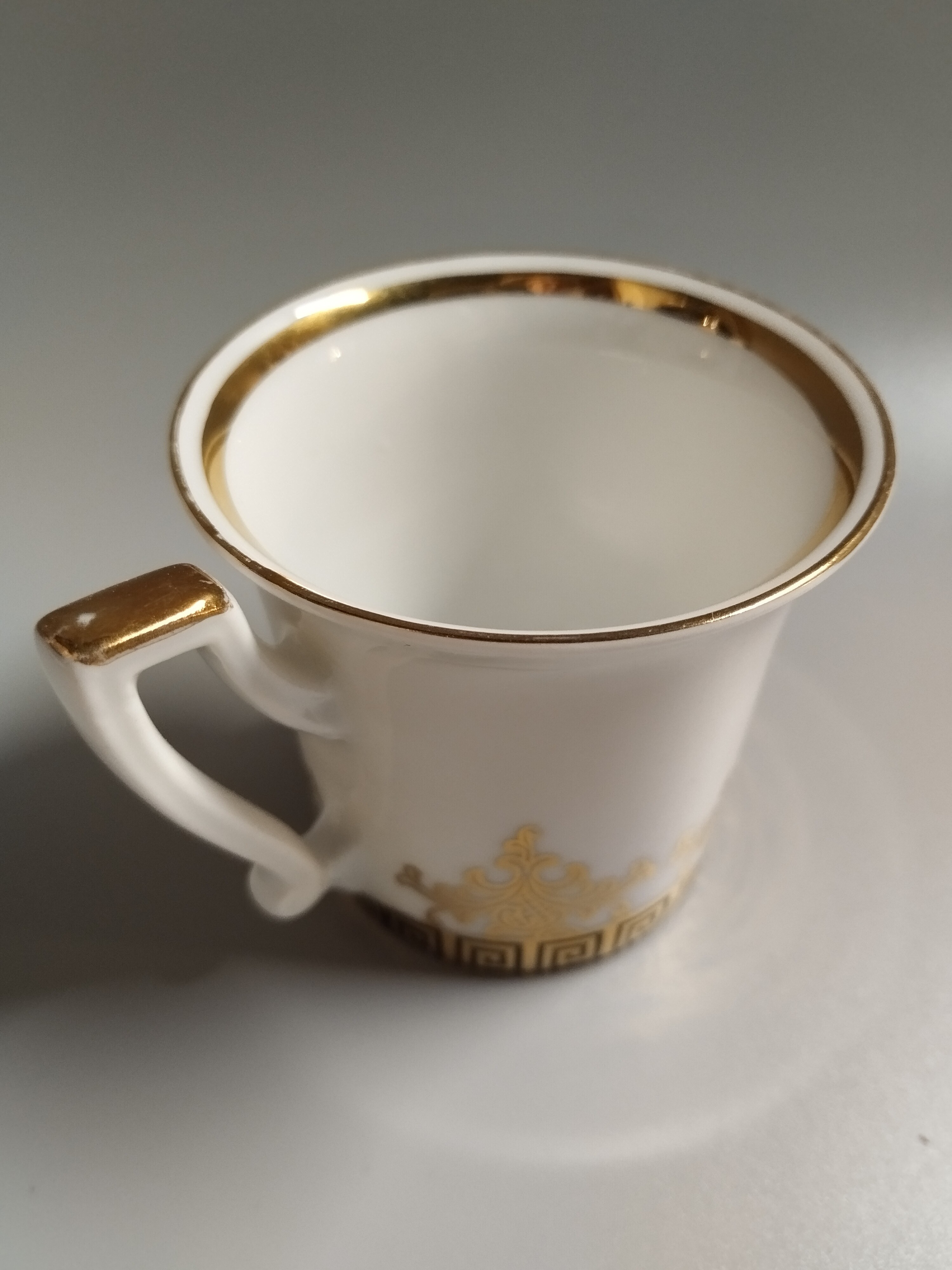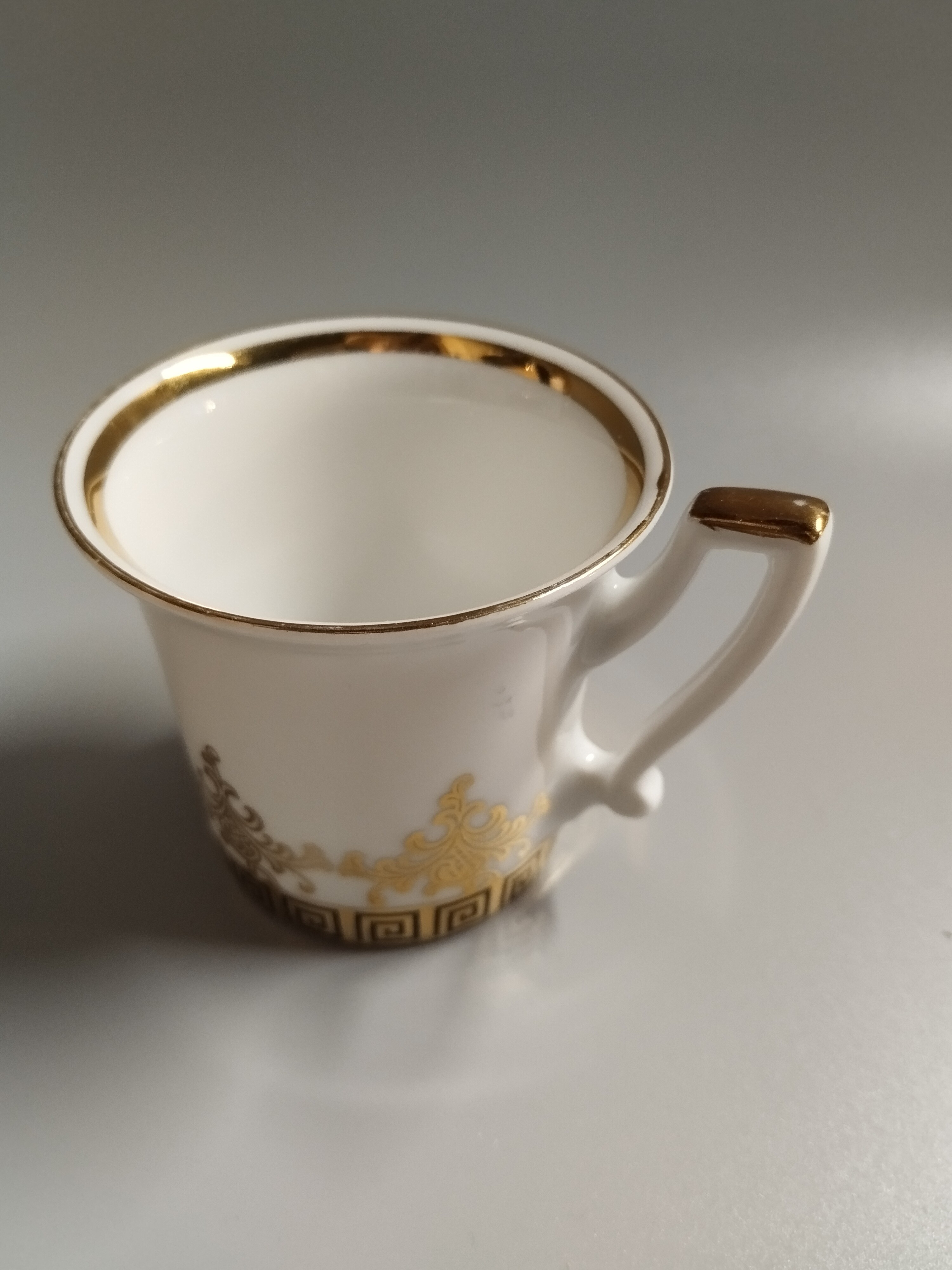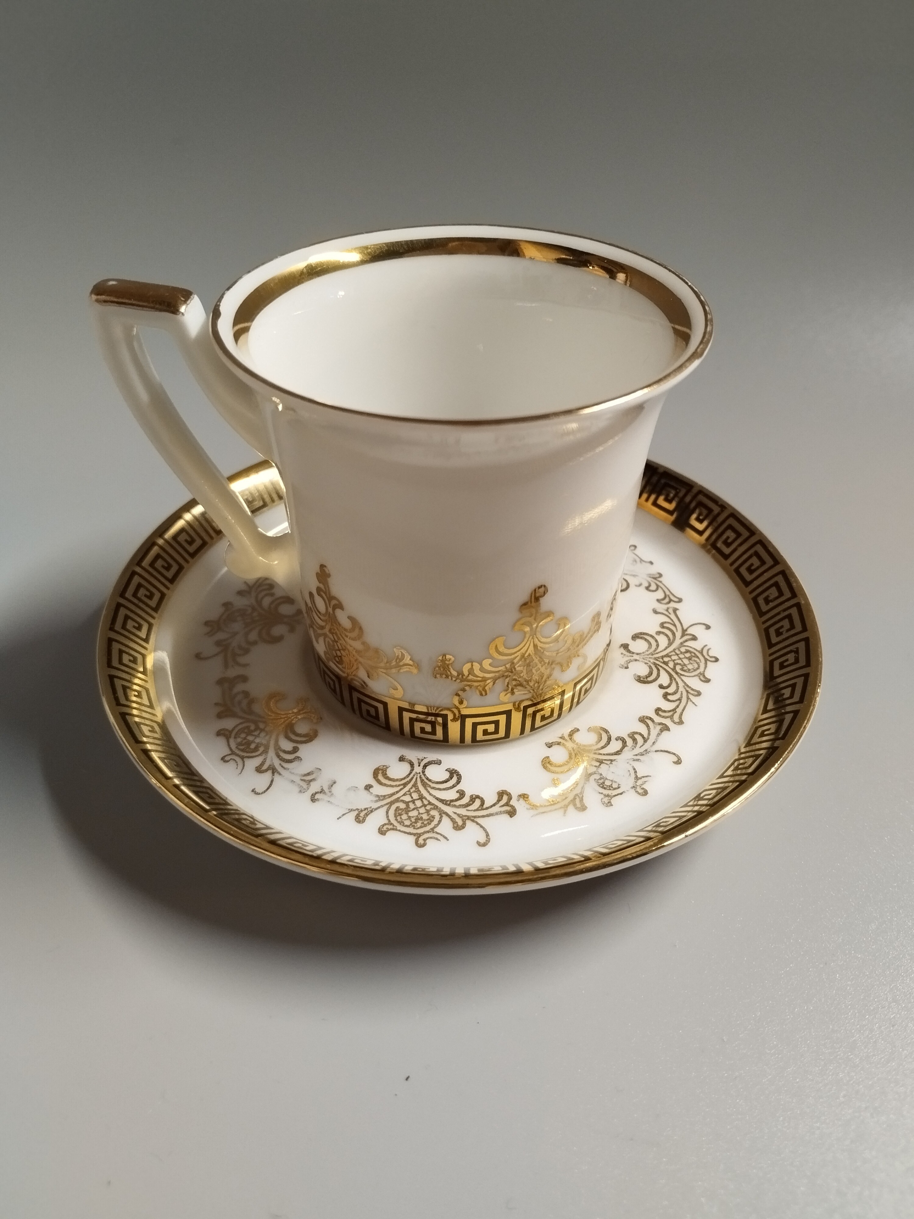 Filiżanka do espresso zdobiona złoconym motywem. Widoczne niewielkie przetarcia na spodeczku. Rheinpfalz Hartporzellan Germany. "Hartporzellan" oznacza "twardą porcelanę", co jest typem porcelany o wysokiej wytrzymałości.