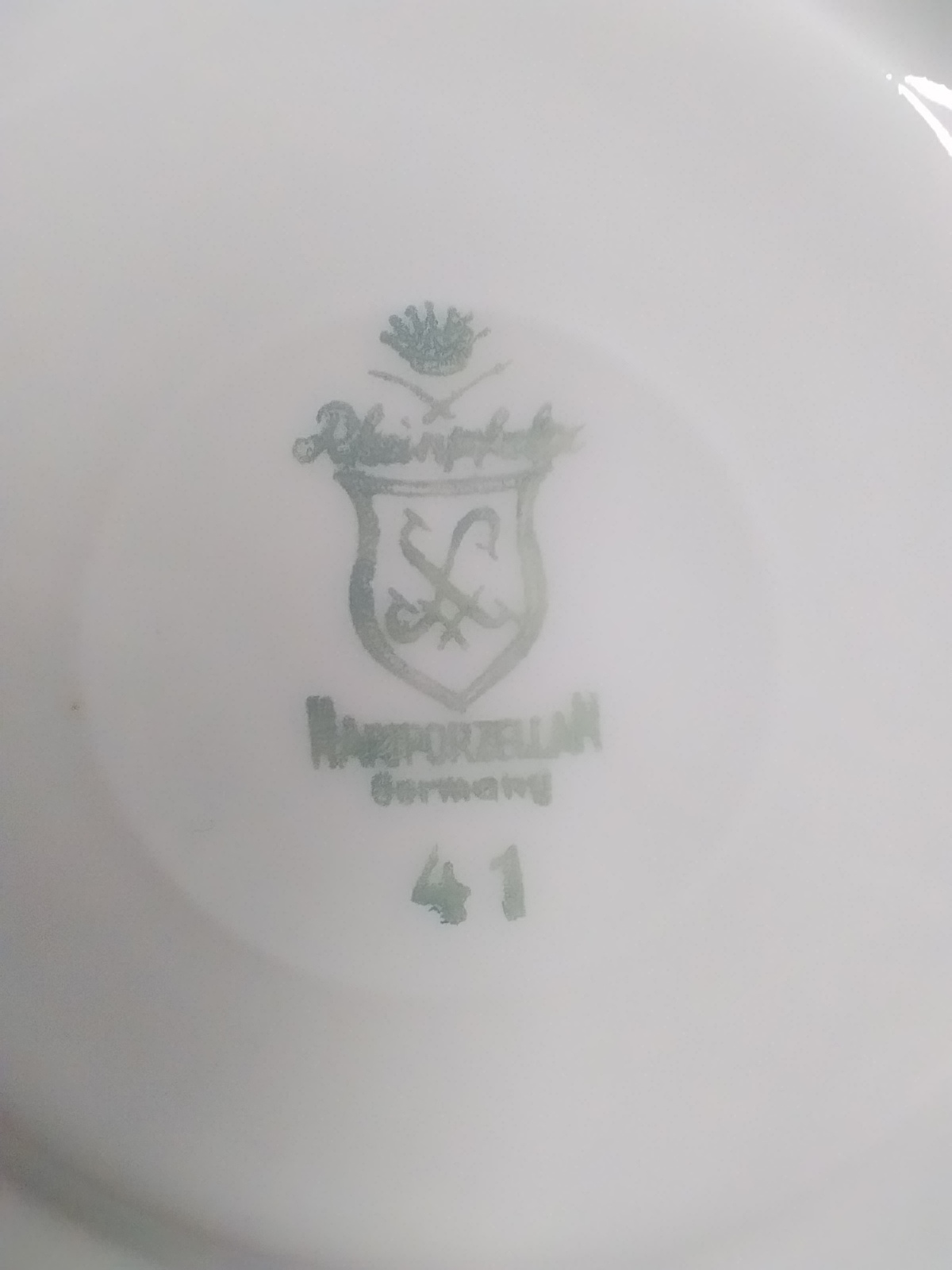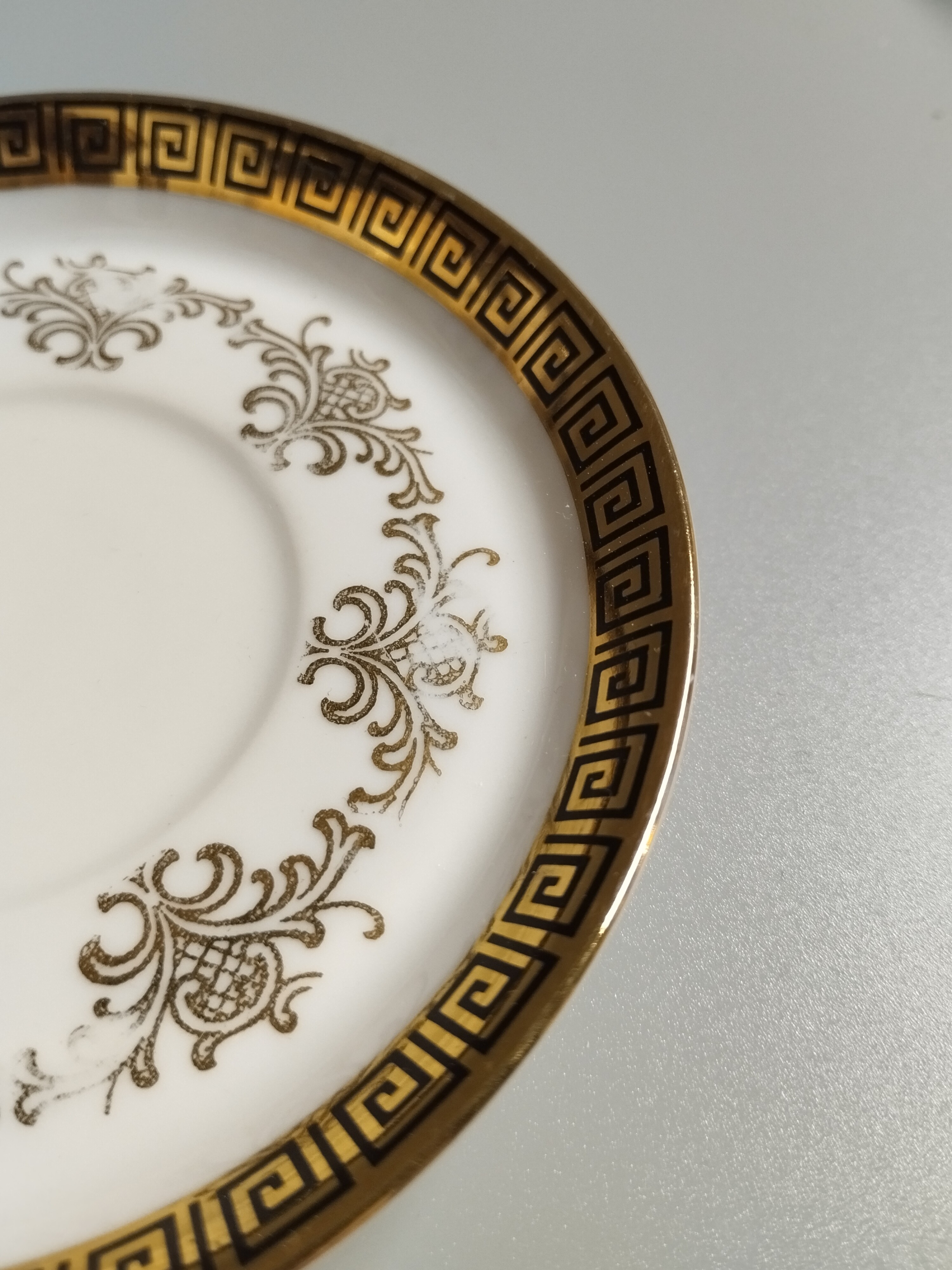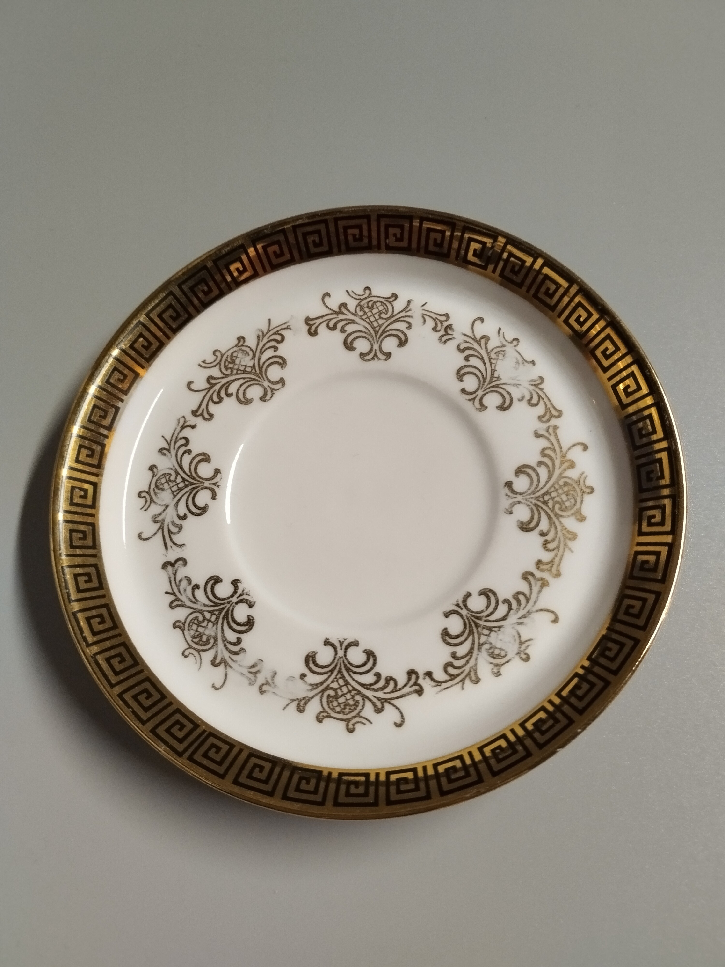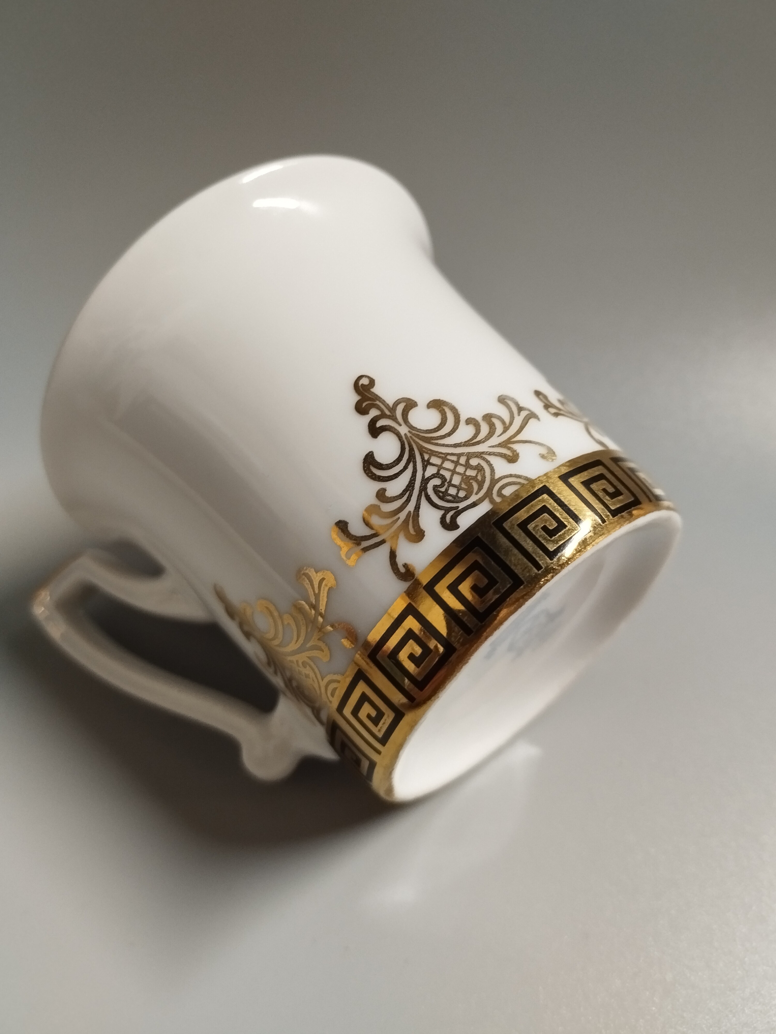 Filiżanka do espresso zdobiona złoconym motywem. Widoczne niewielkie przetarcia na spodeczku. Rheinpfalz Hartporzellan Germany. "Hartporzellan" oznacza "twardą porcelanę", co jest typem porcelany o wysokiej wytrzymałości.