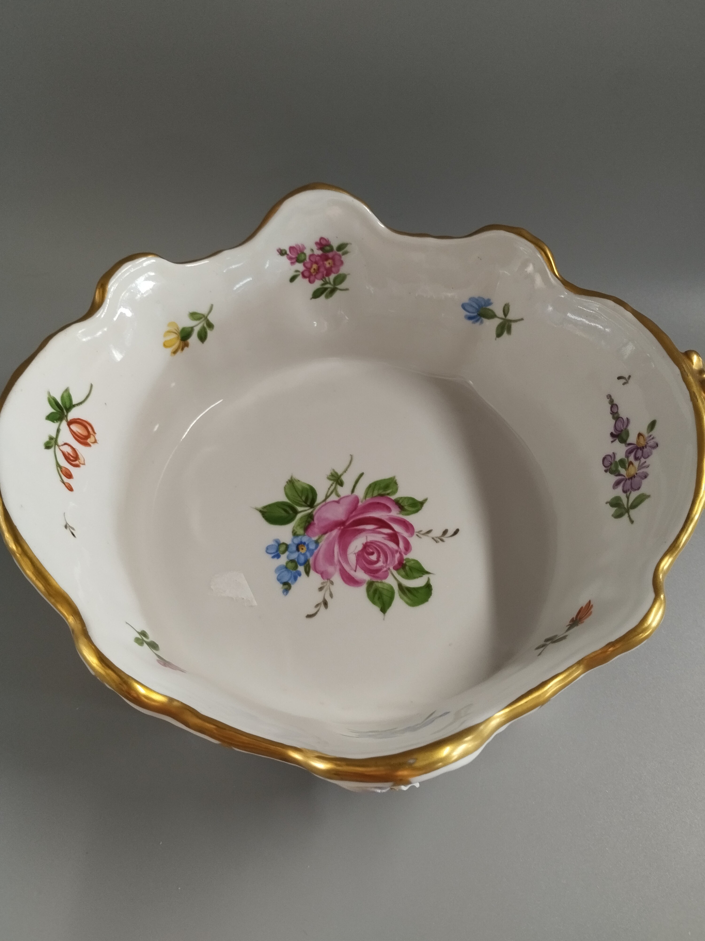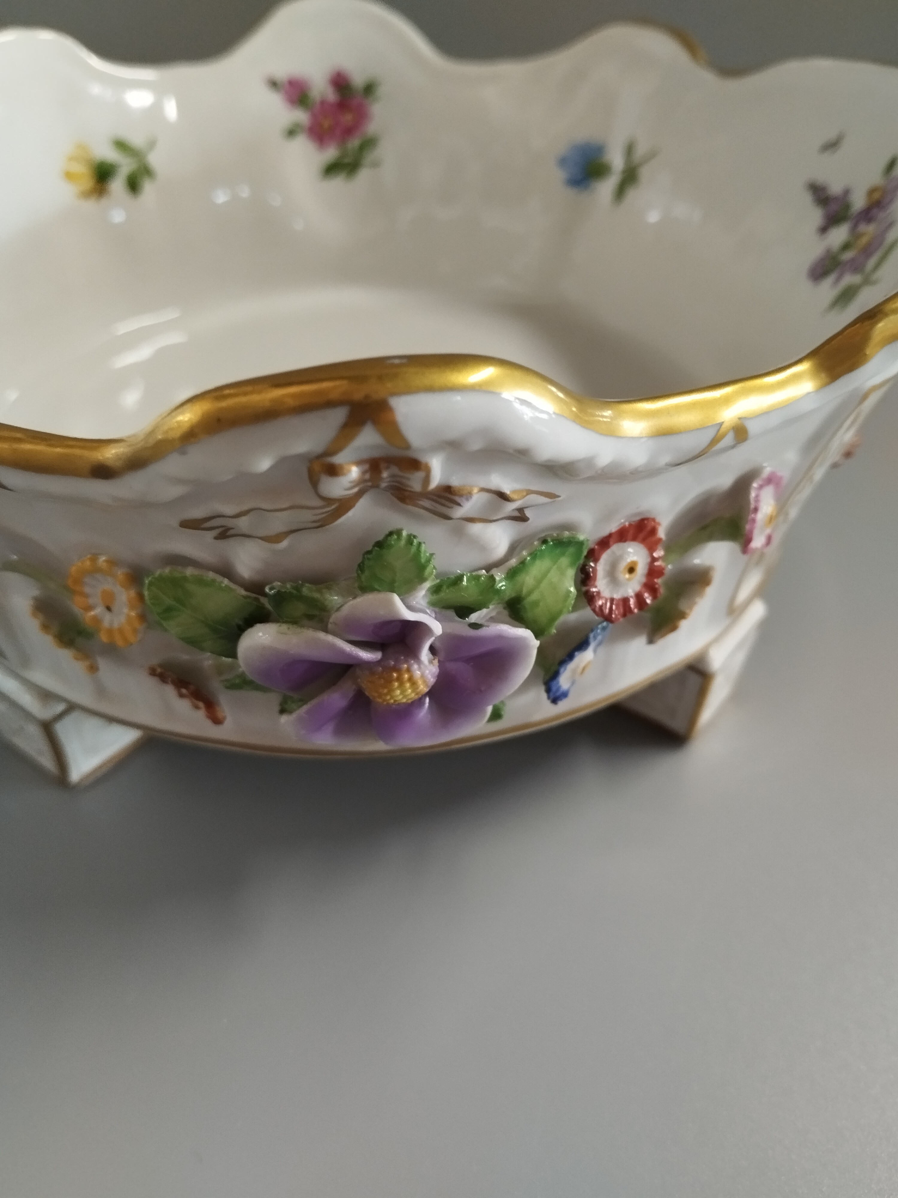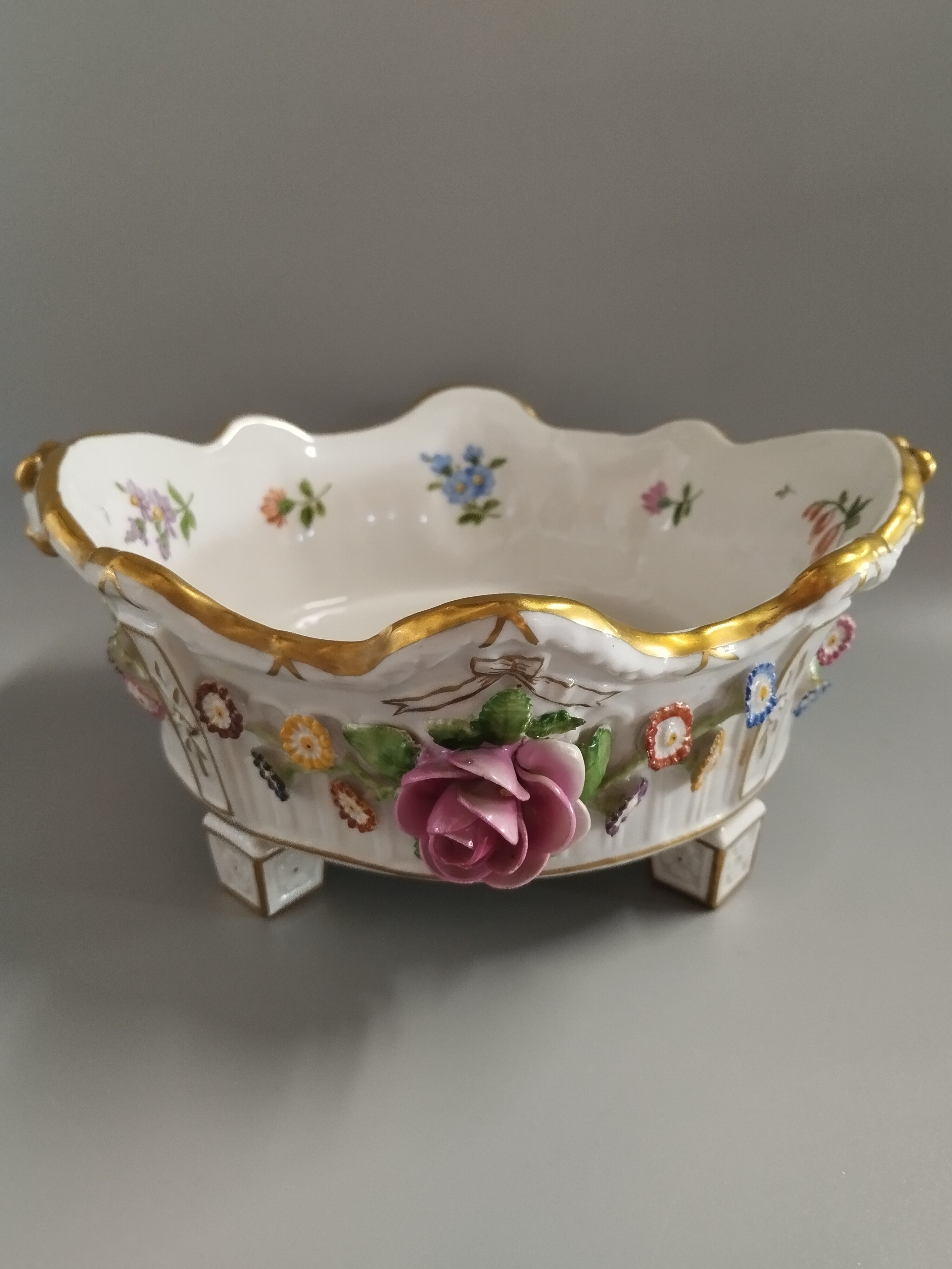 Porcelanowa żardiniera marki Von Schierholz, ręcznie malowana i ozdobiona trójwymiarowymi kwiatami. Posiada niewielkie uszkodzenie w postaci braku fragmentu płatka (fioletowy kwiatek). Ze względu na wyjątkową kruchość przedmiotu zakup możliwy tylko poprzez odbiór osobisty.