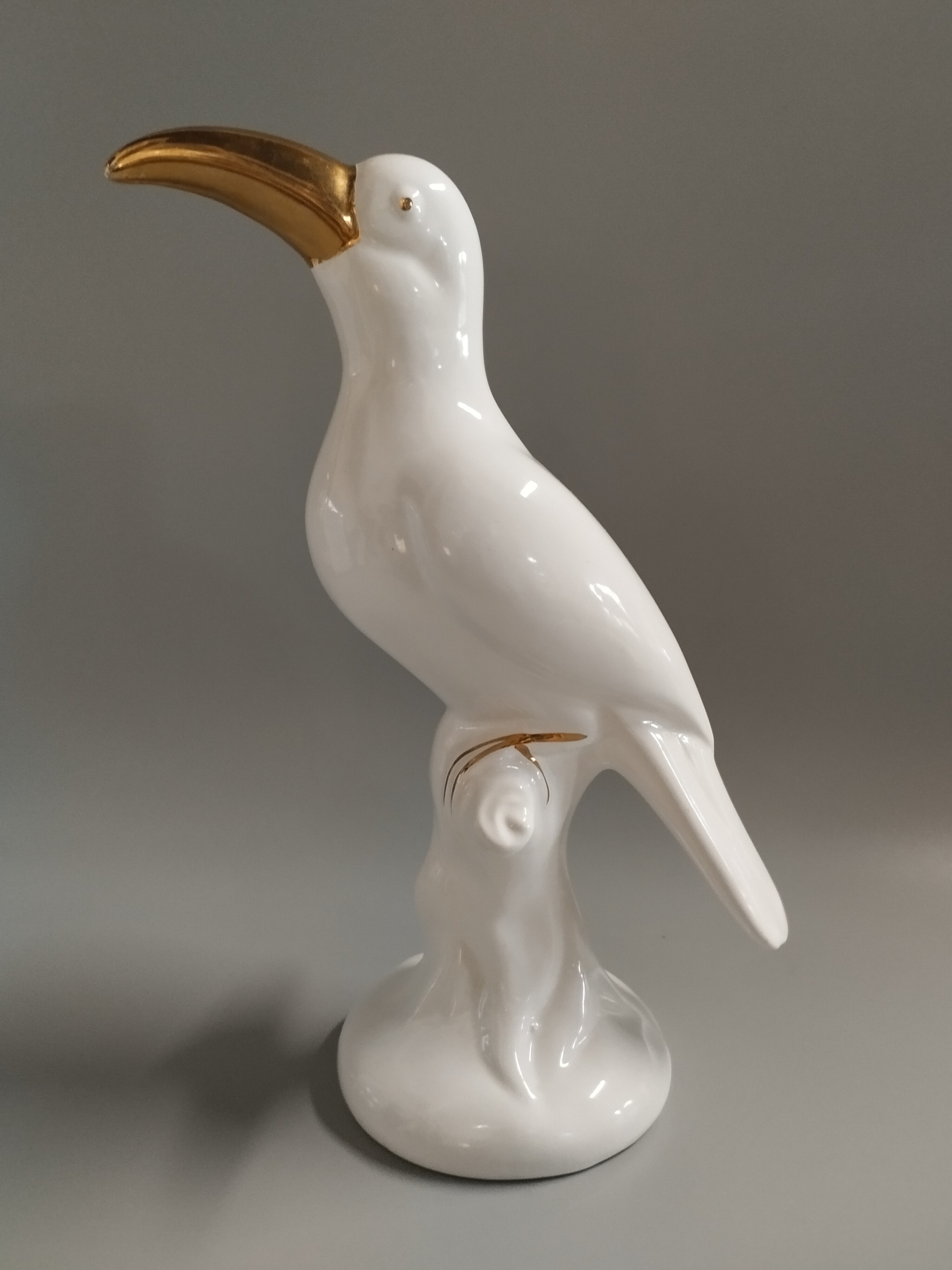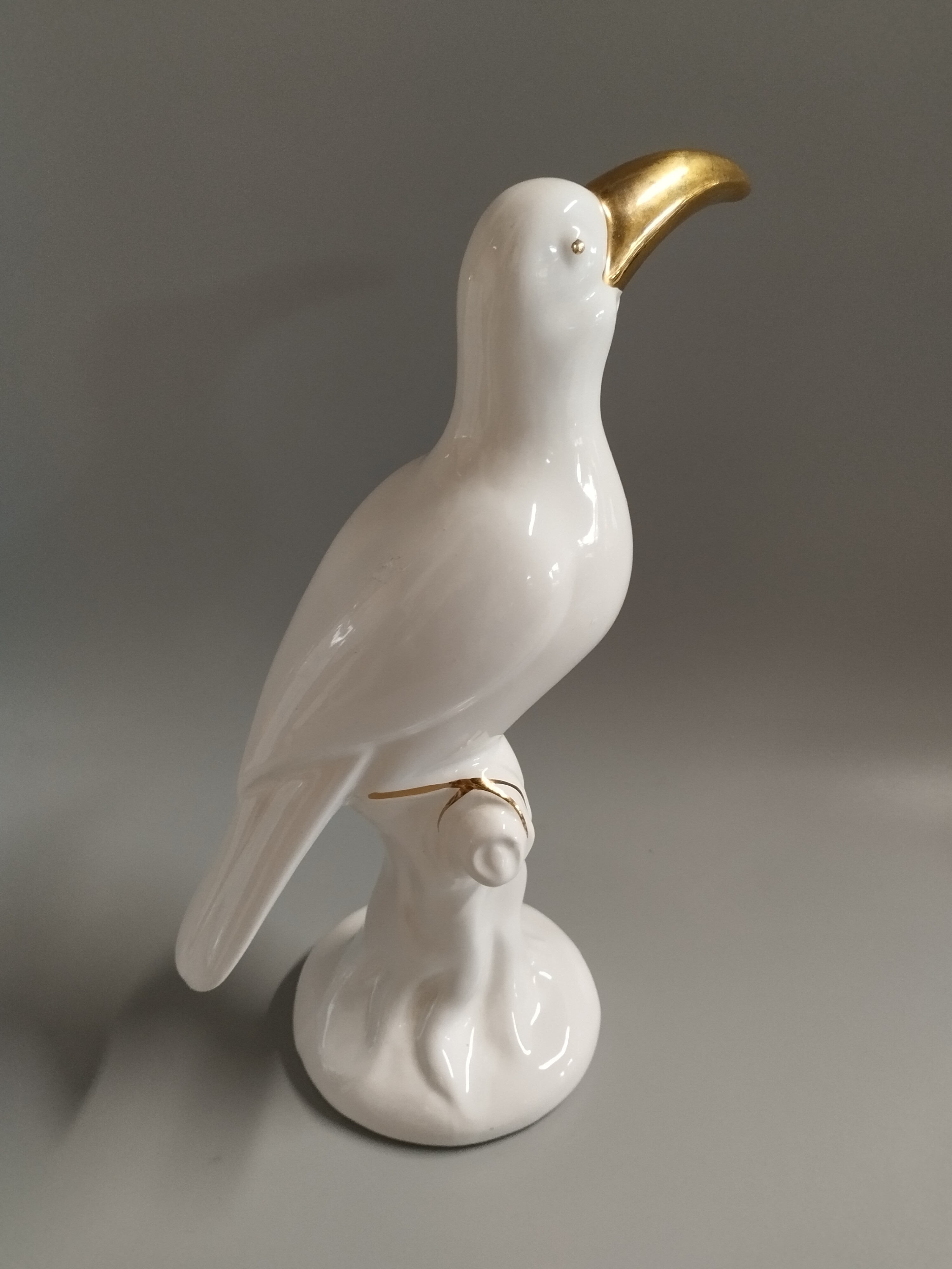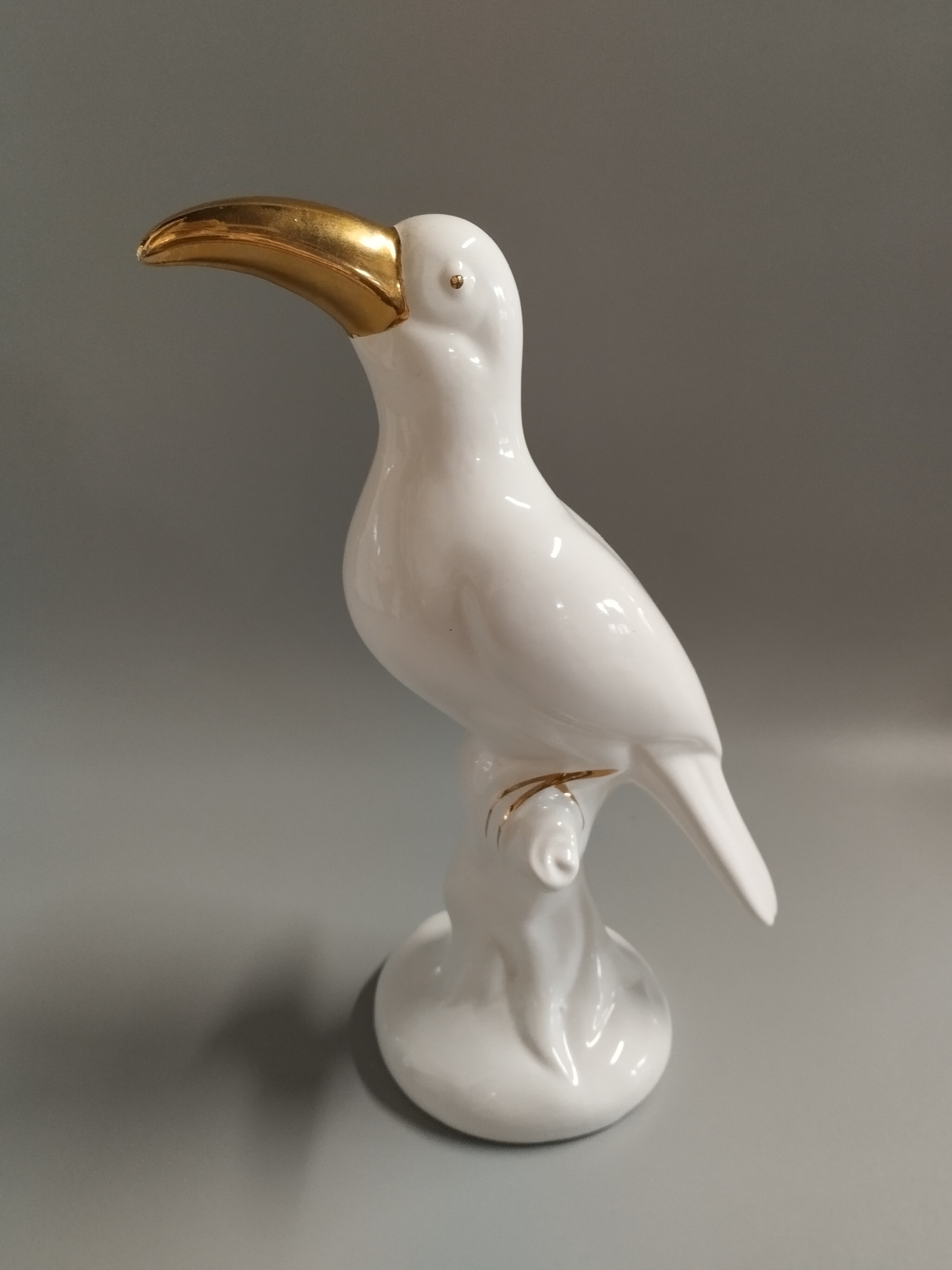 Tukan z białej porcelany zdobiony złoconymi elementami. Figurka niesygnowana.