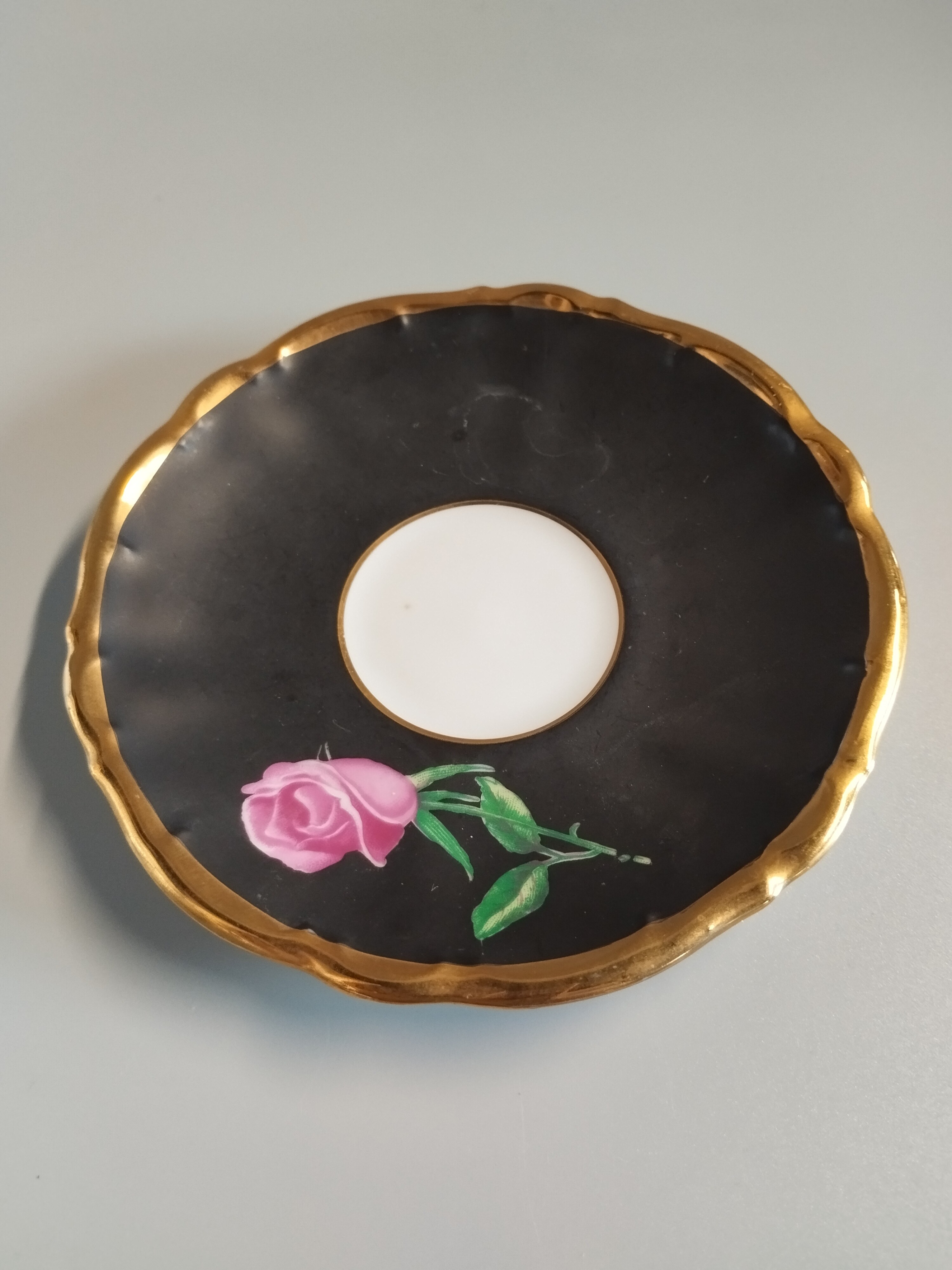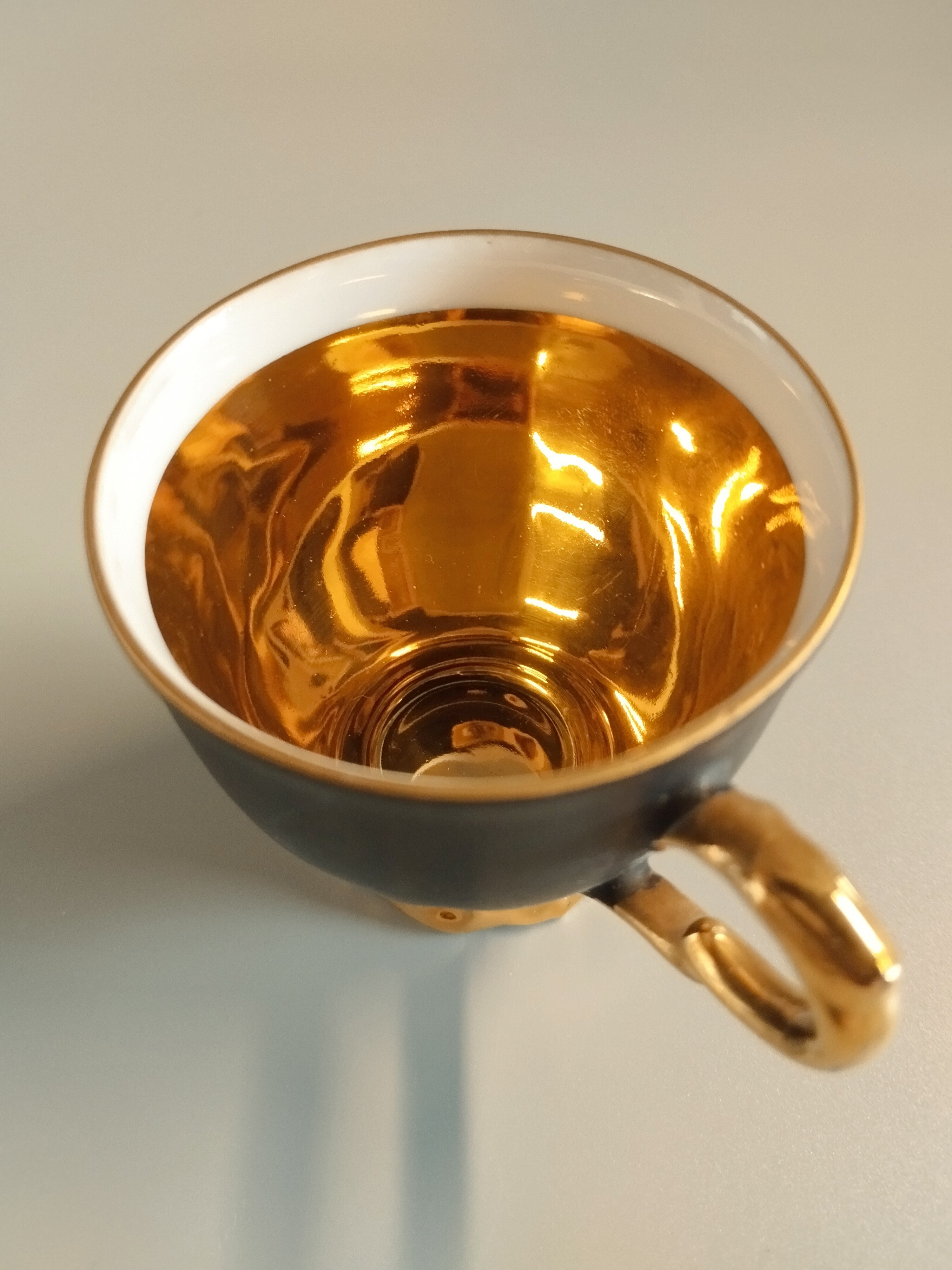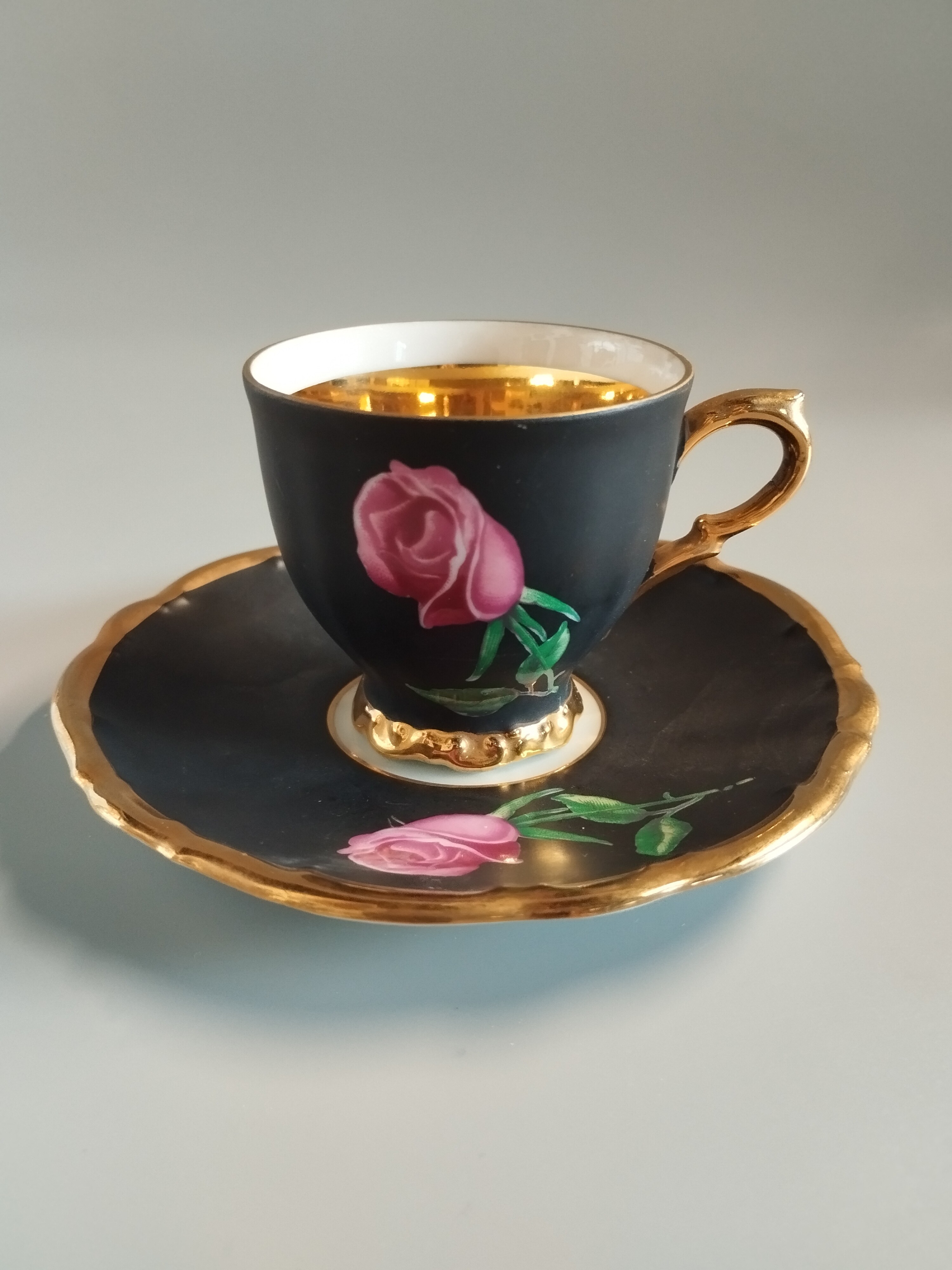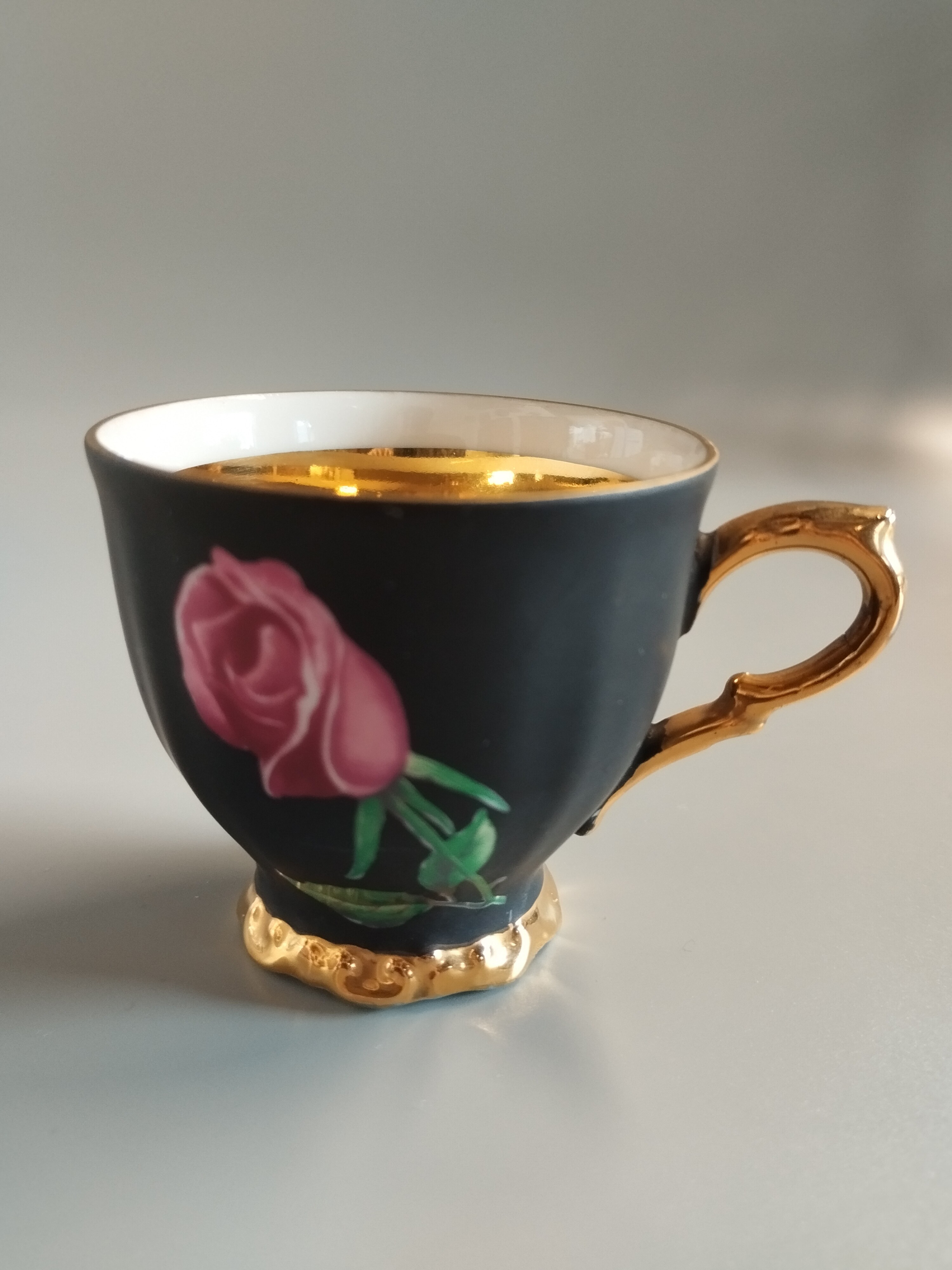 Czarna matowa filiżanka do espresso z motywem róży. Środek i zewnętrzne elementy pokryte 24 karatowym złotem.