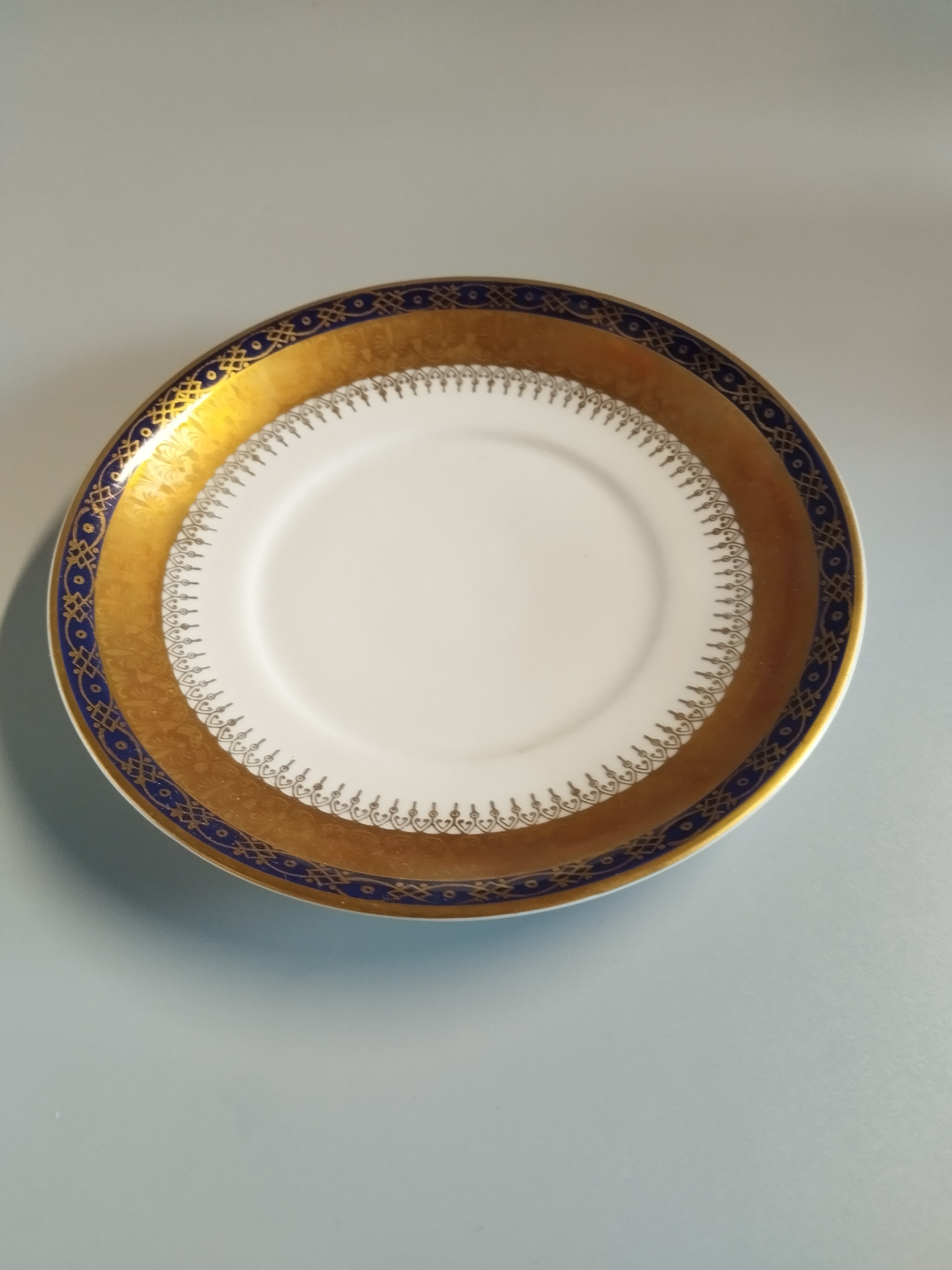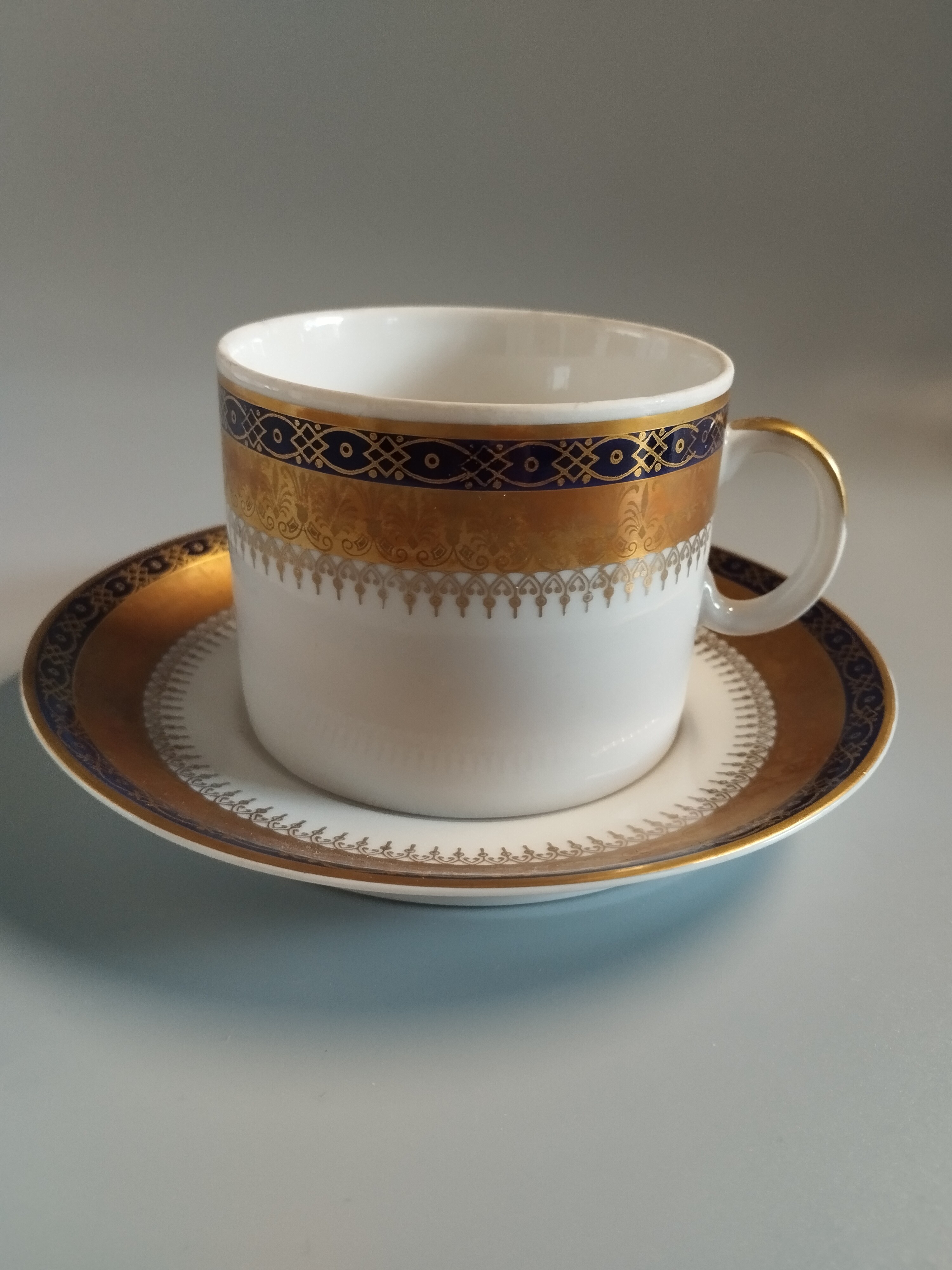 Duża filiżanka do kawy zdobiona kobaltowym i złotym pasem. Zakłady Porcelany Stołowej "Karolina" w Jaworzynie Śląskiej.