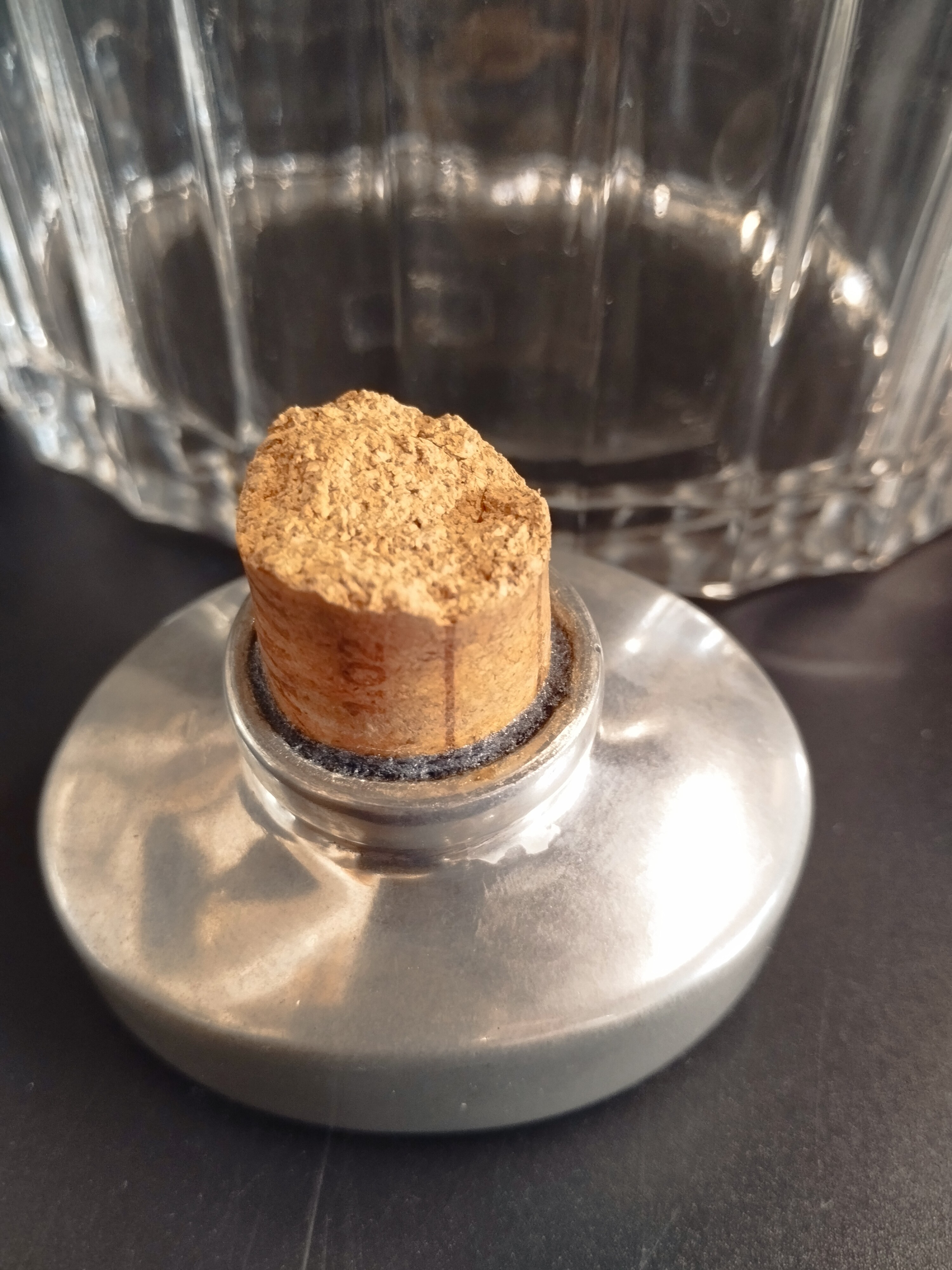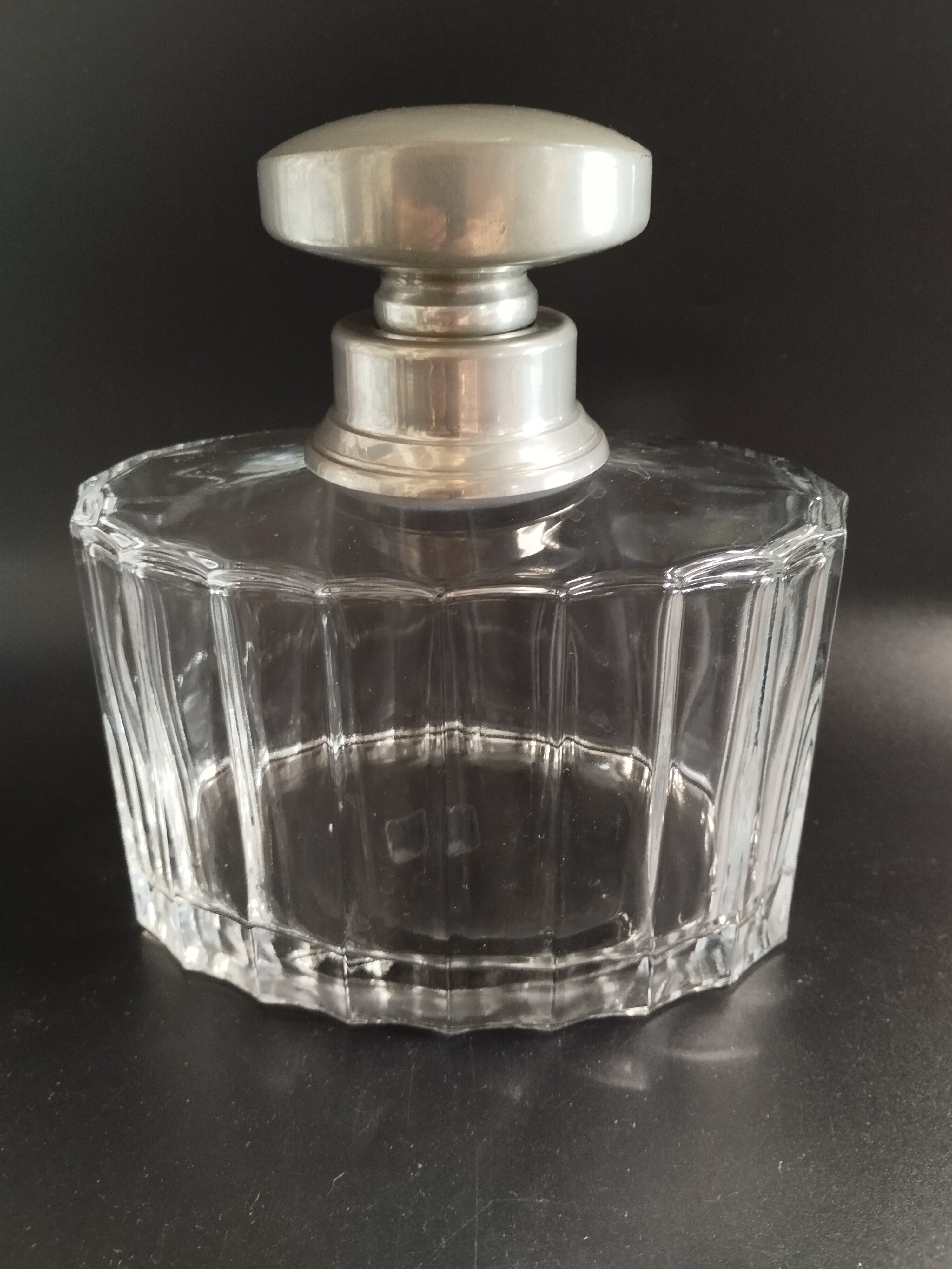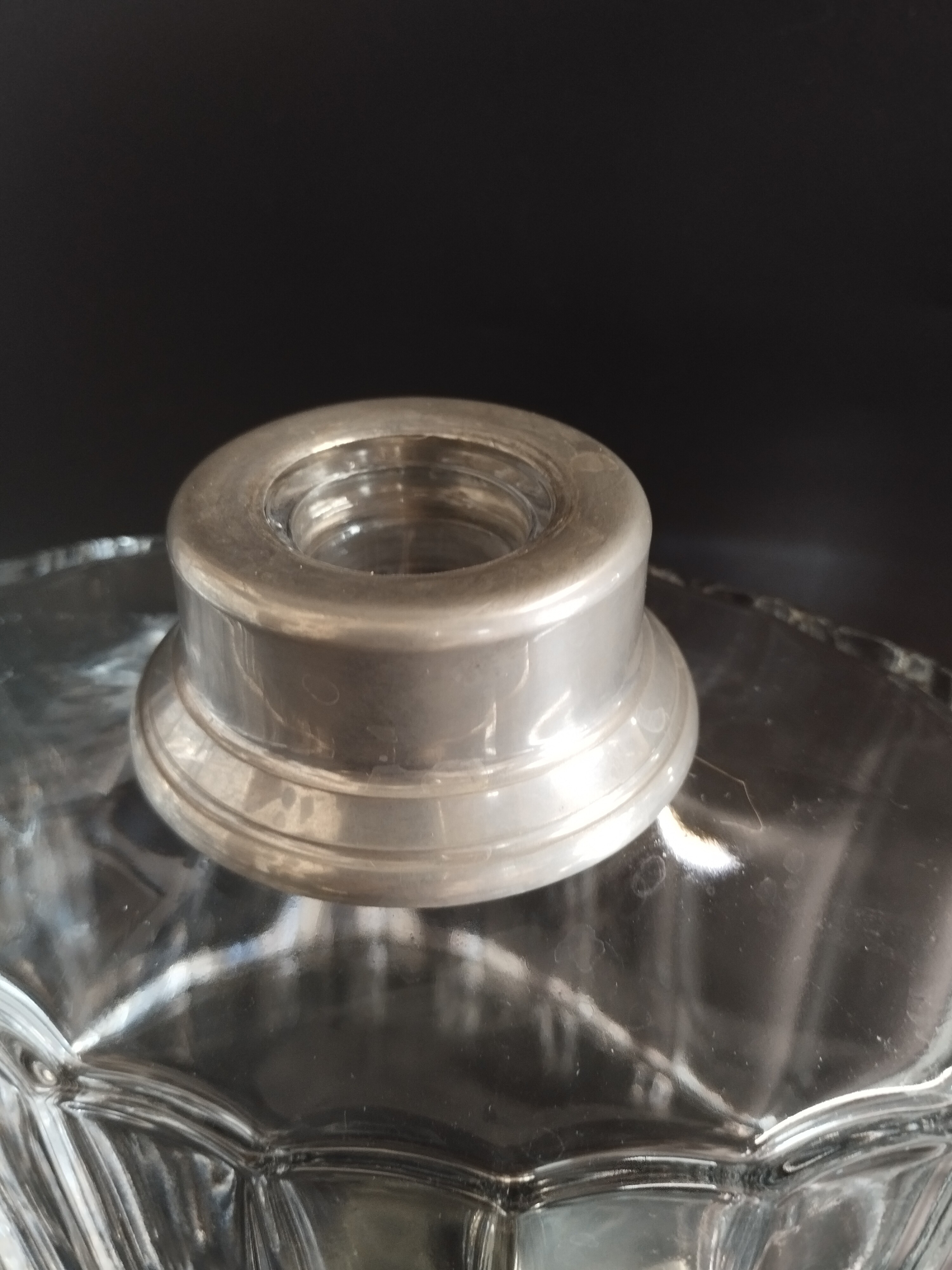 Karafka kryształowa z posrebrzanymi elementami. Zachowana w bardzo dobrym stanie, oprócz ukruszonego korka w zatyczce.
