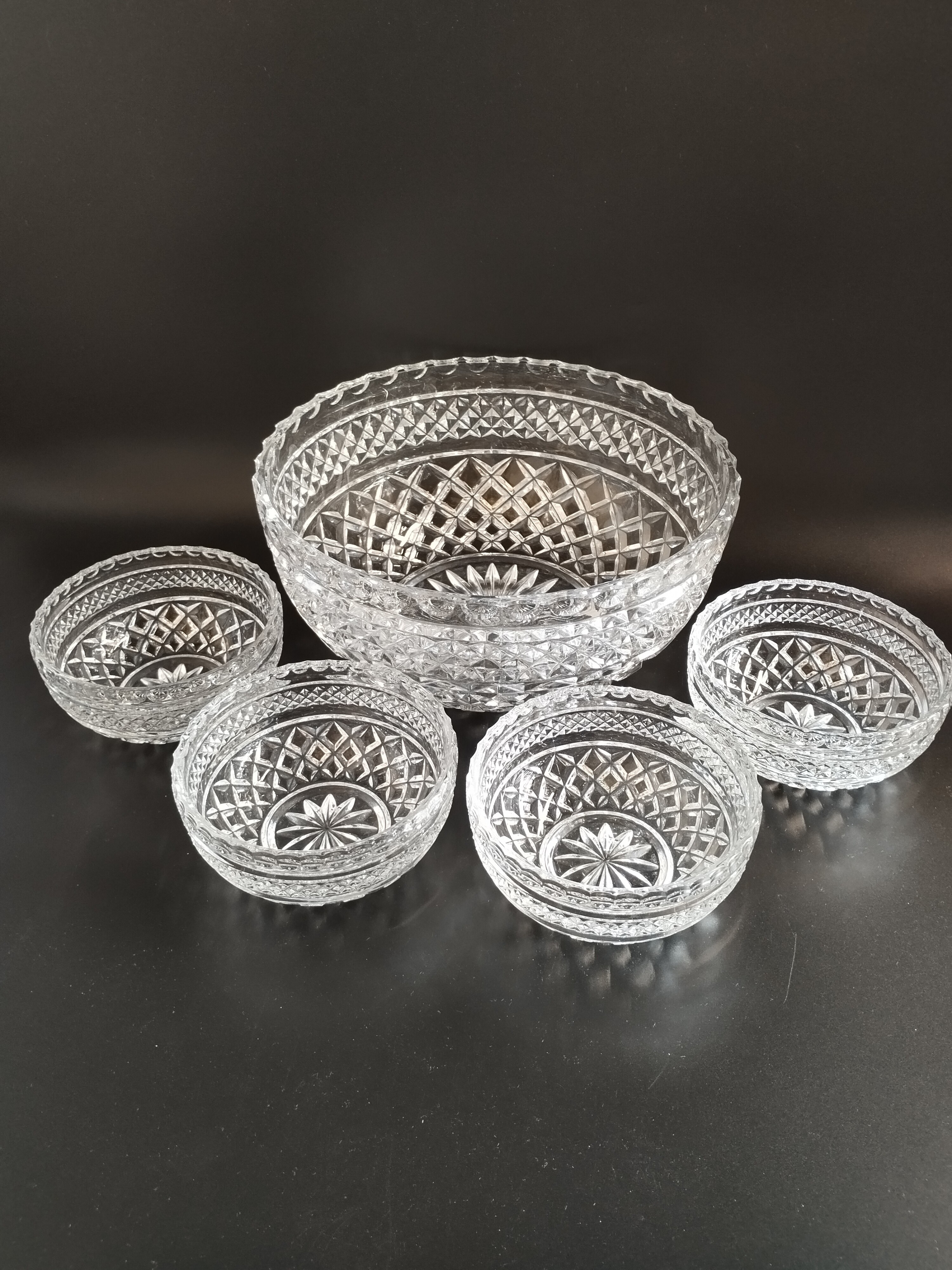 Zestaw kryształowy do deserów. W komplecie: 1 duża salaterka i 4 małe miseczki.