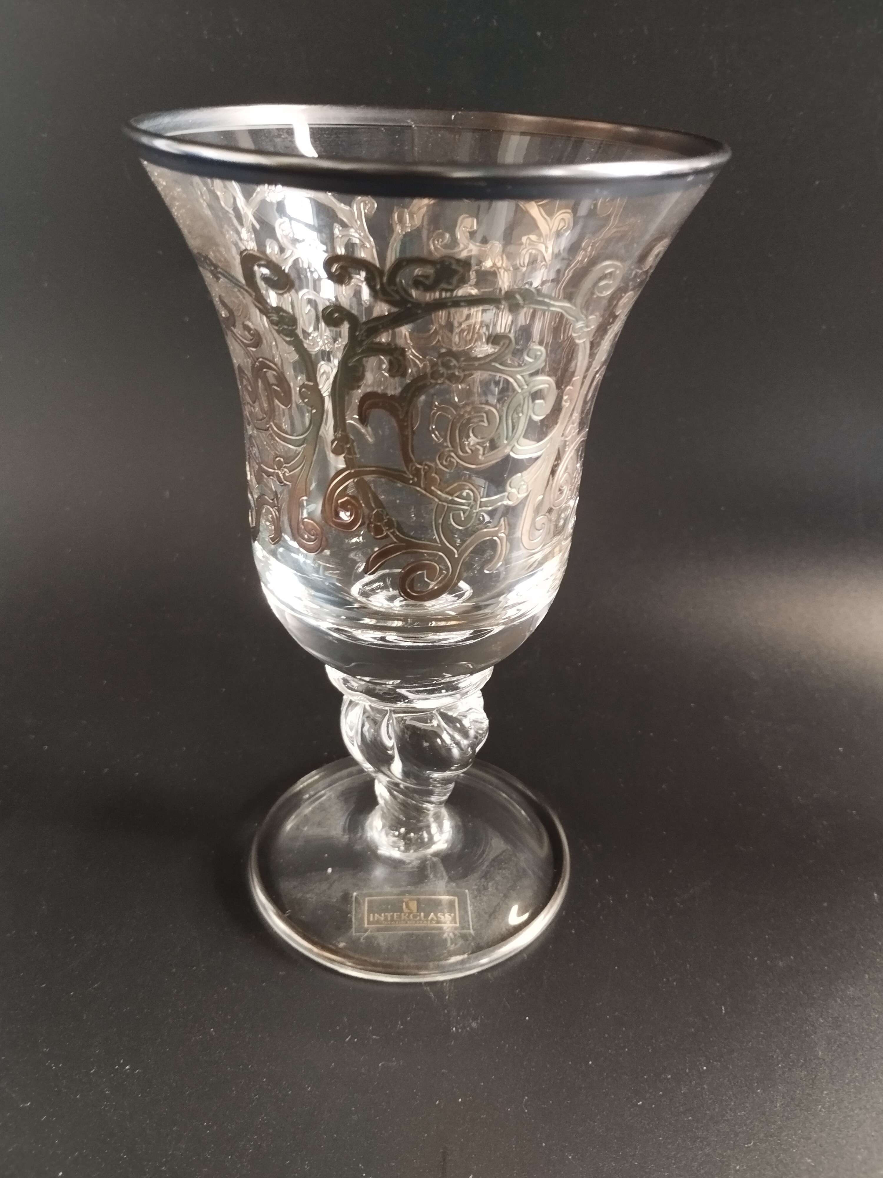 Kieliszki dekorowane ornamentem ze srebra. Firma Interglass, Włochy. Cena za 1 sztukę. Posiadamy 6 szt.
