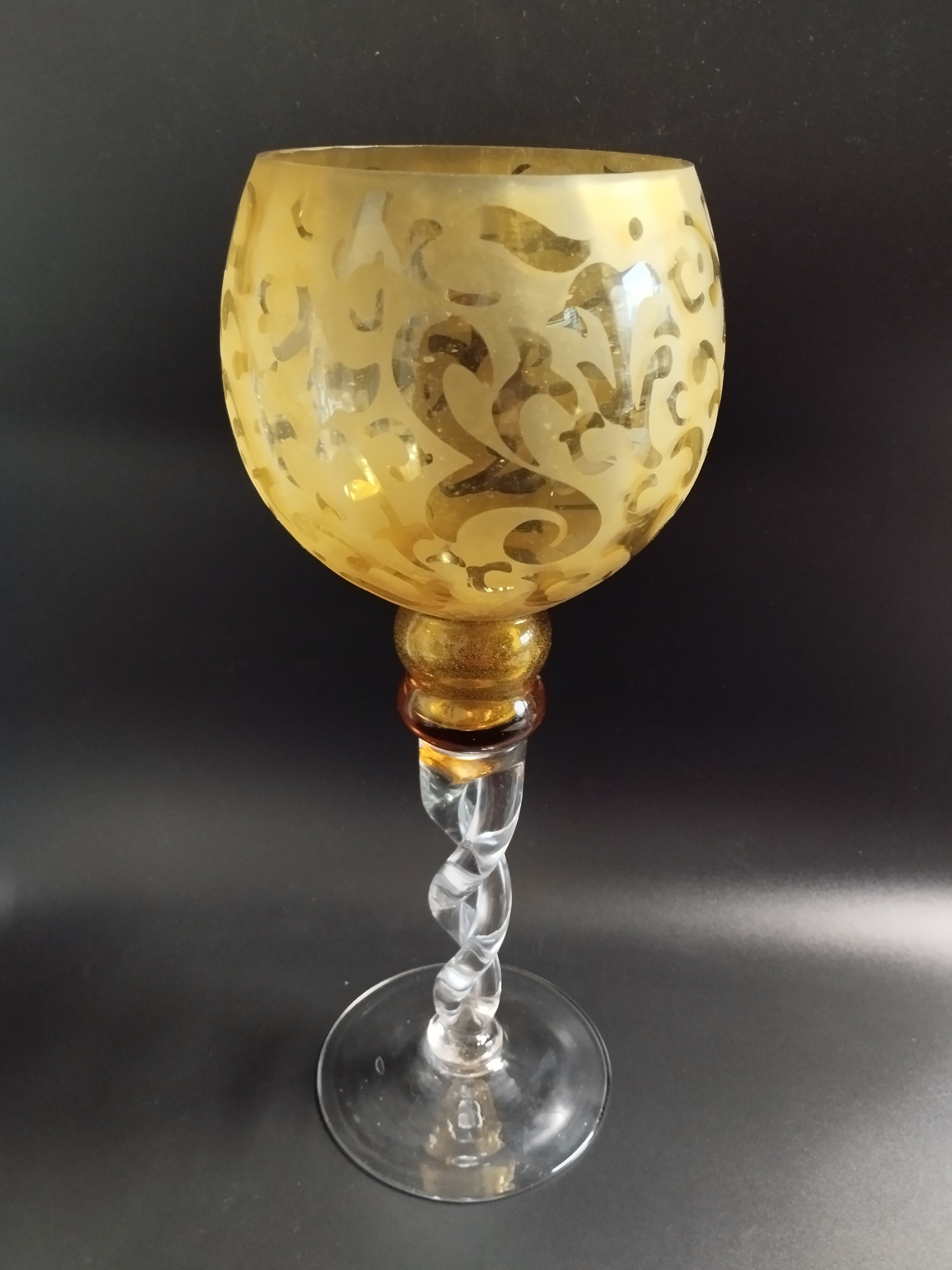 Wysoki ozdobny kielich szklany w miodowym odcieniu.