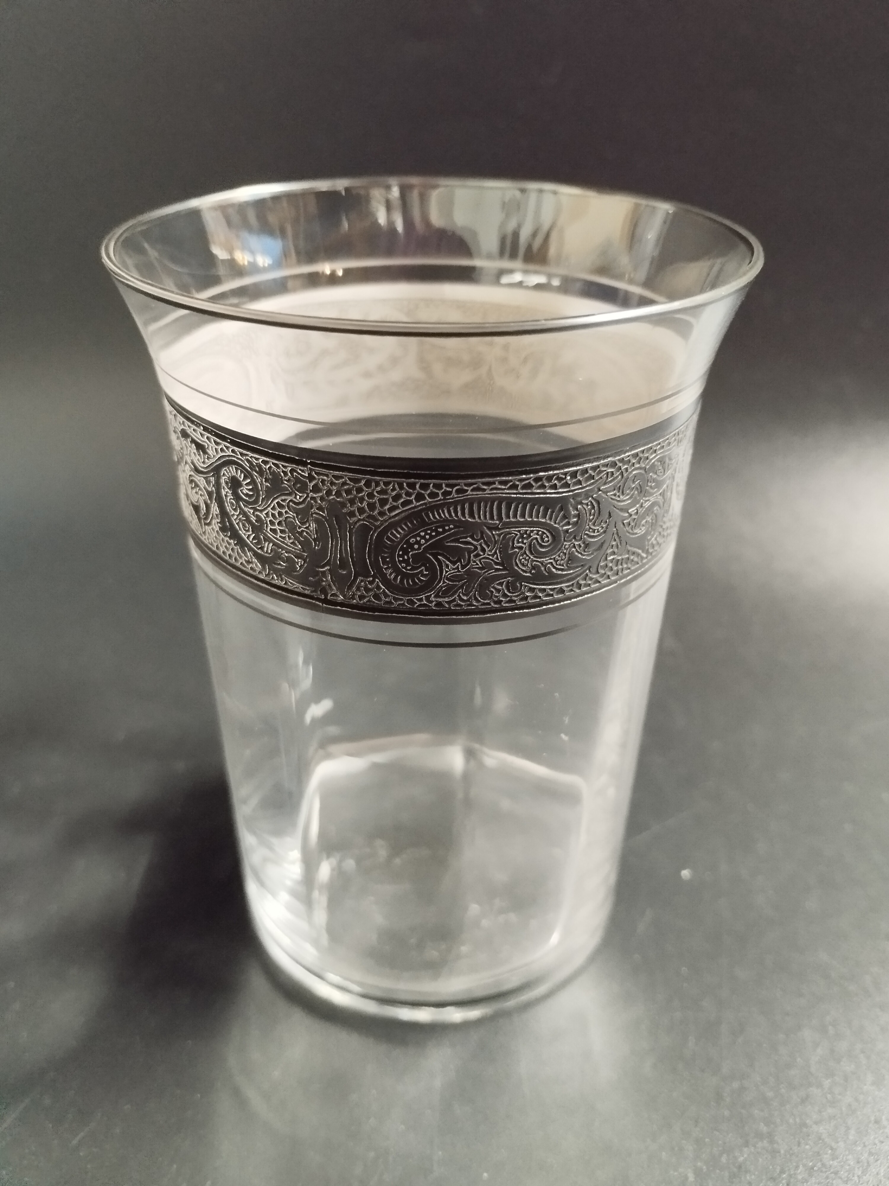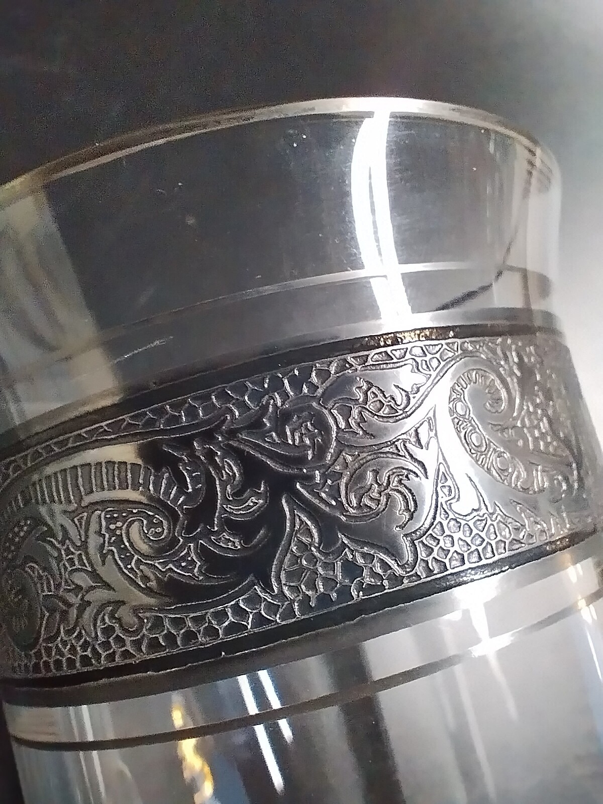 Zestaw ośmiu szklanek zdobionych srebrnym ornamentem.