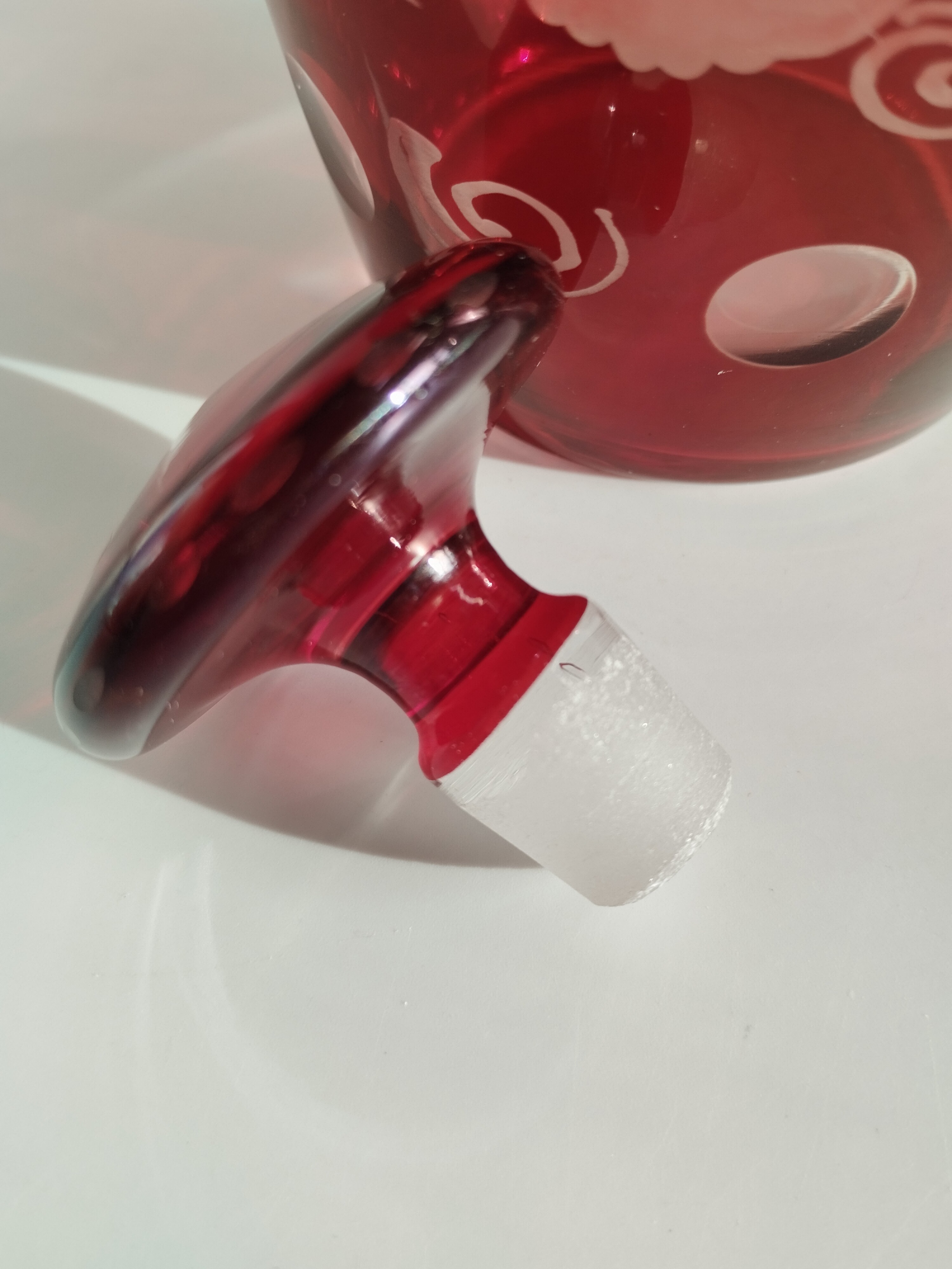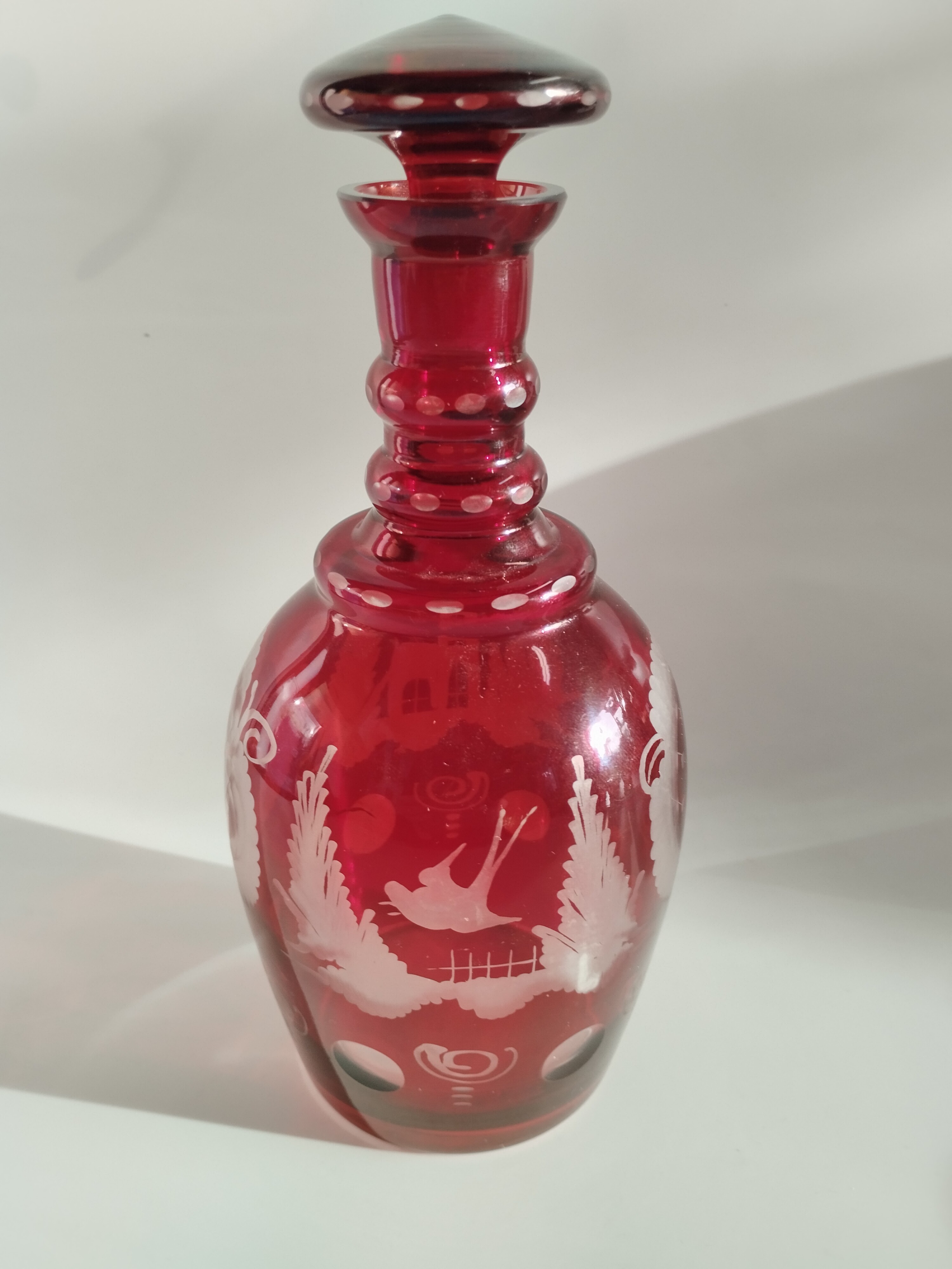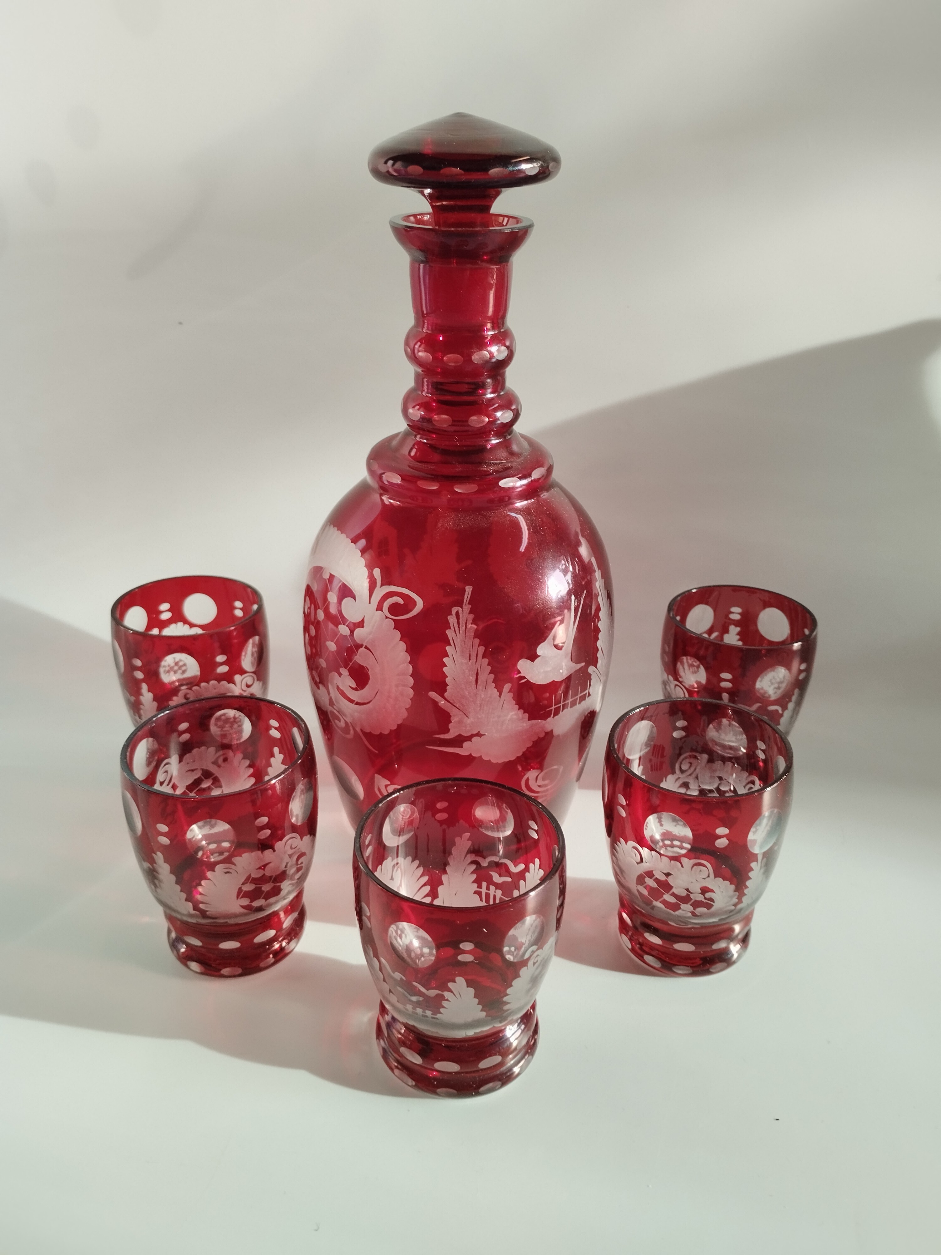 Zestaw składa się z kryształowej karafki i pięciu kieliszków w kolorze rubinowym.
