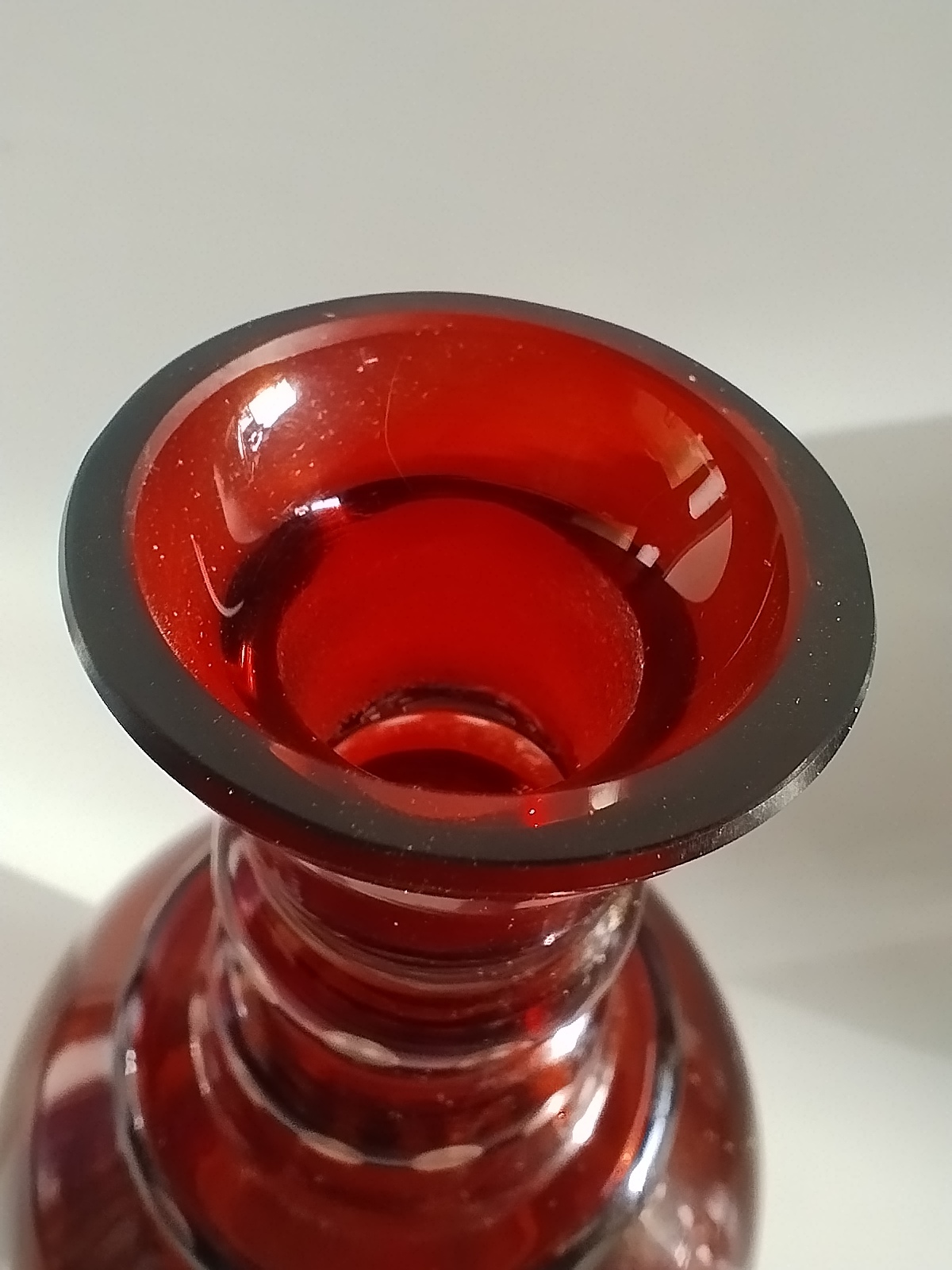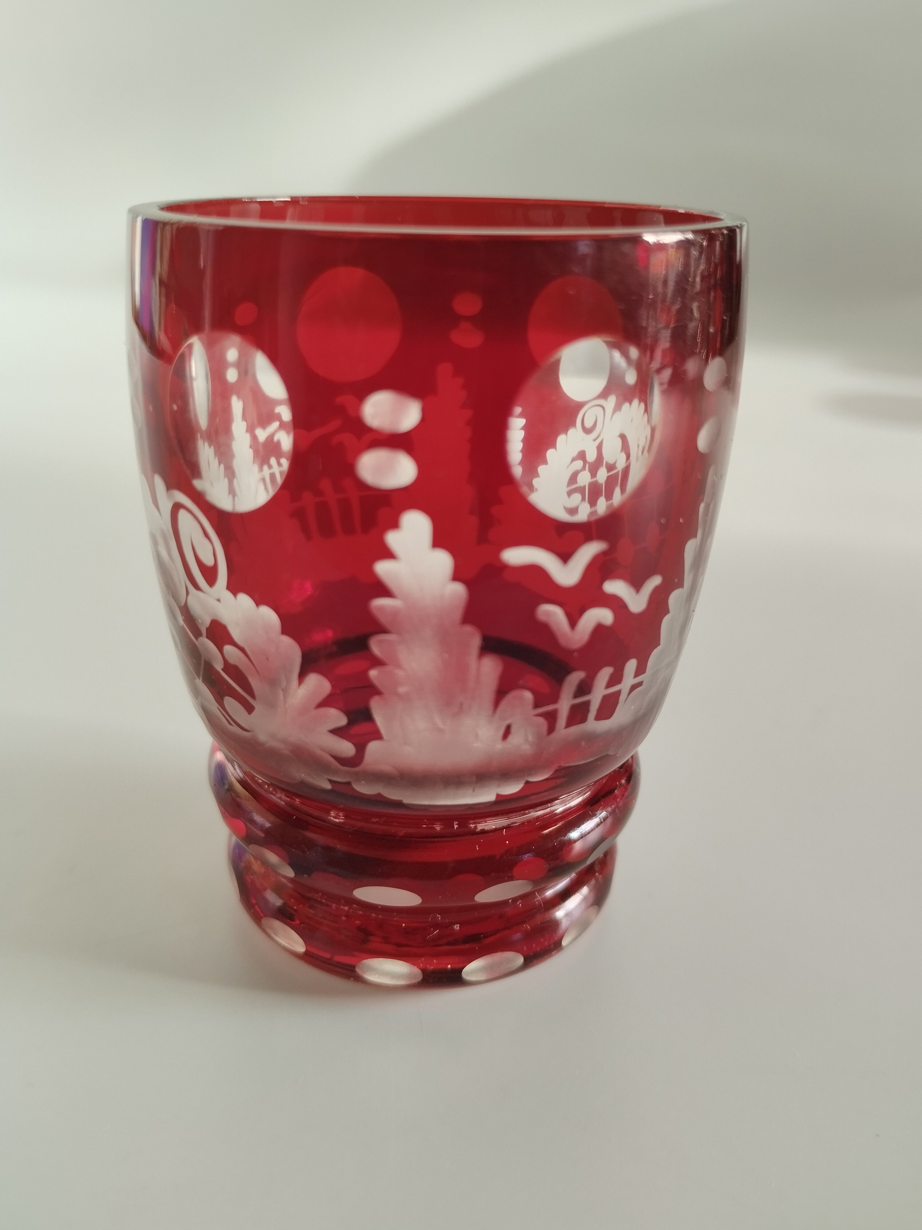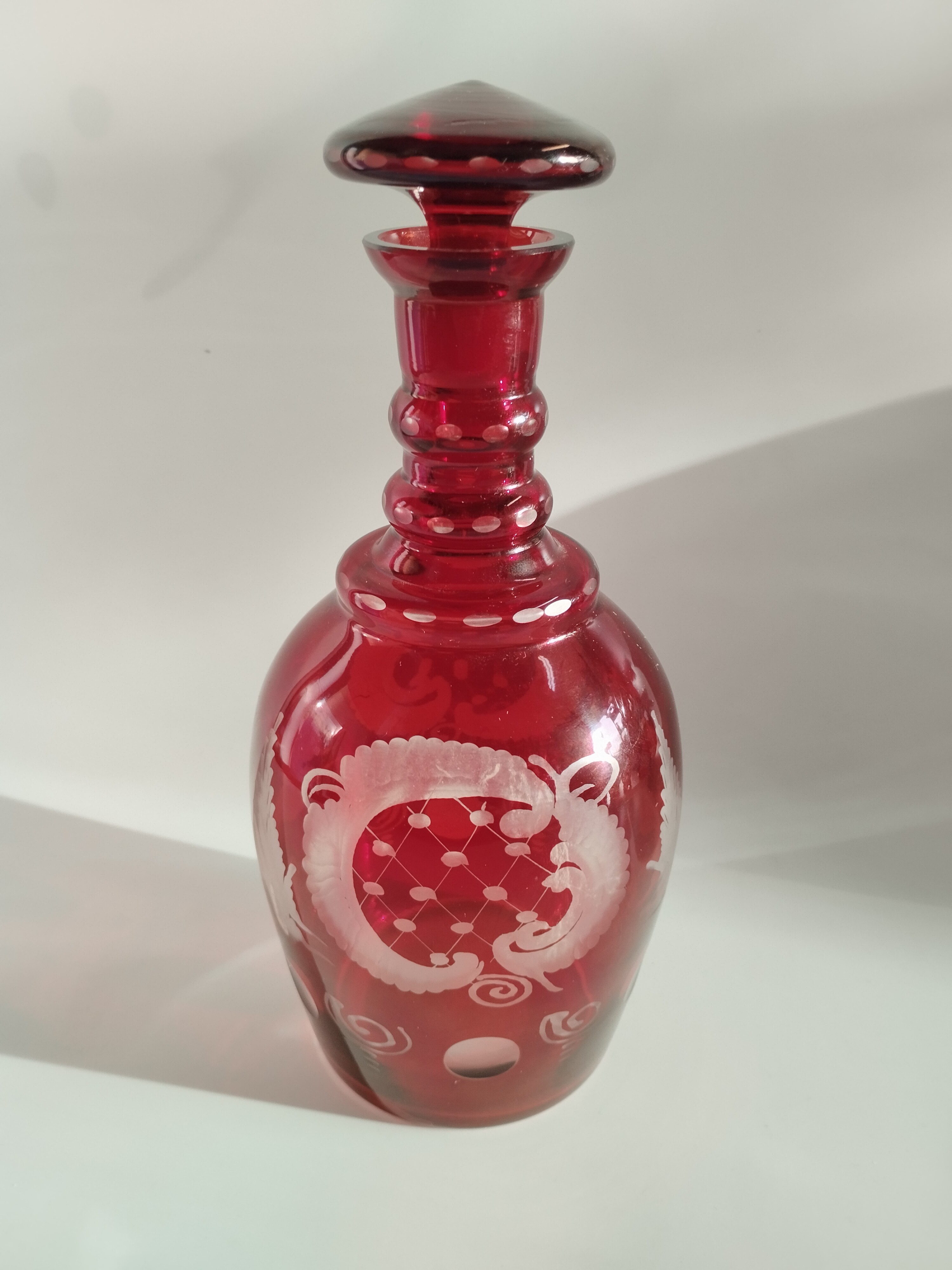 Zestaw składa się z kryształowej karafki i pięciu kieliszków w kolorze rubinowym.