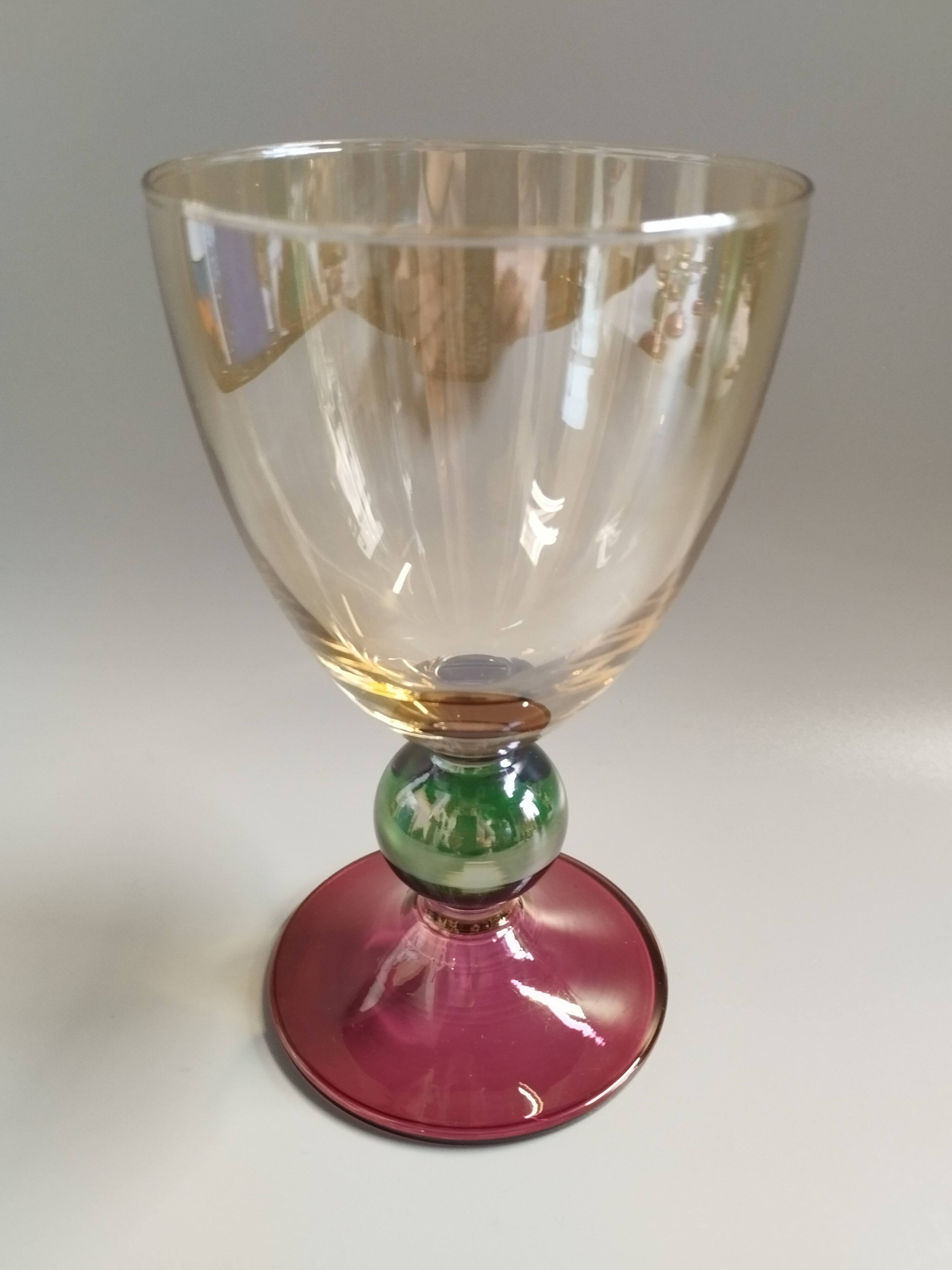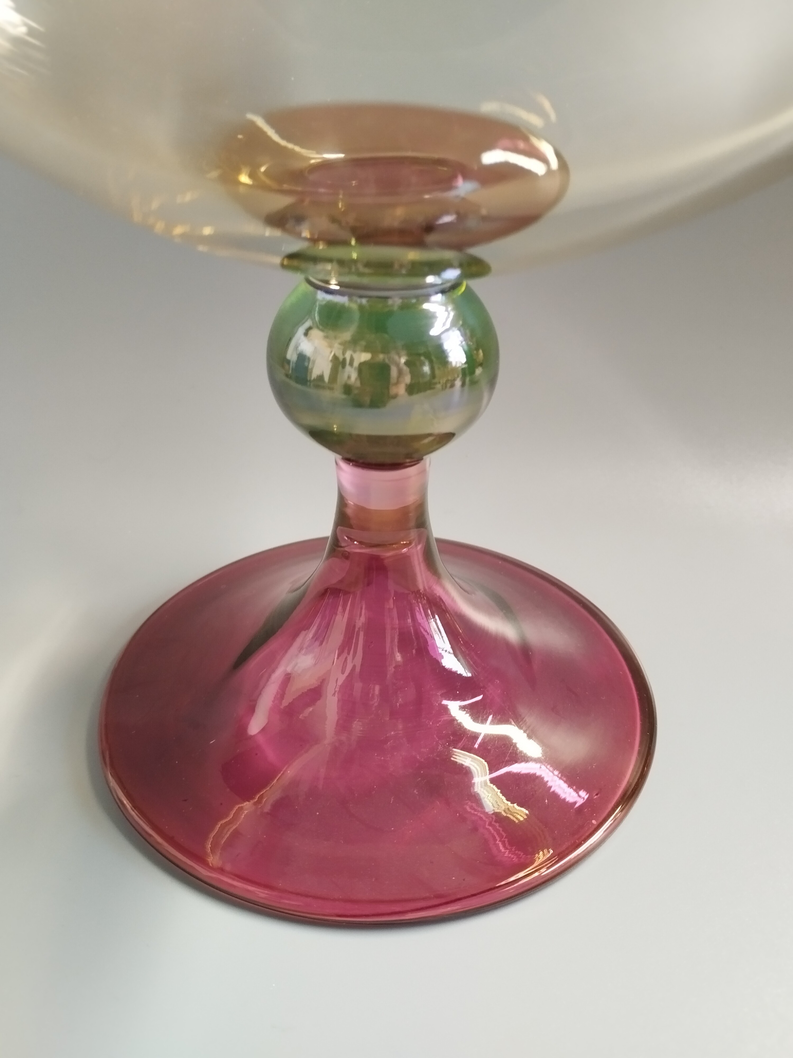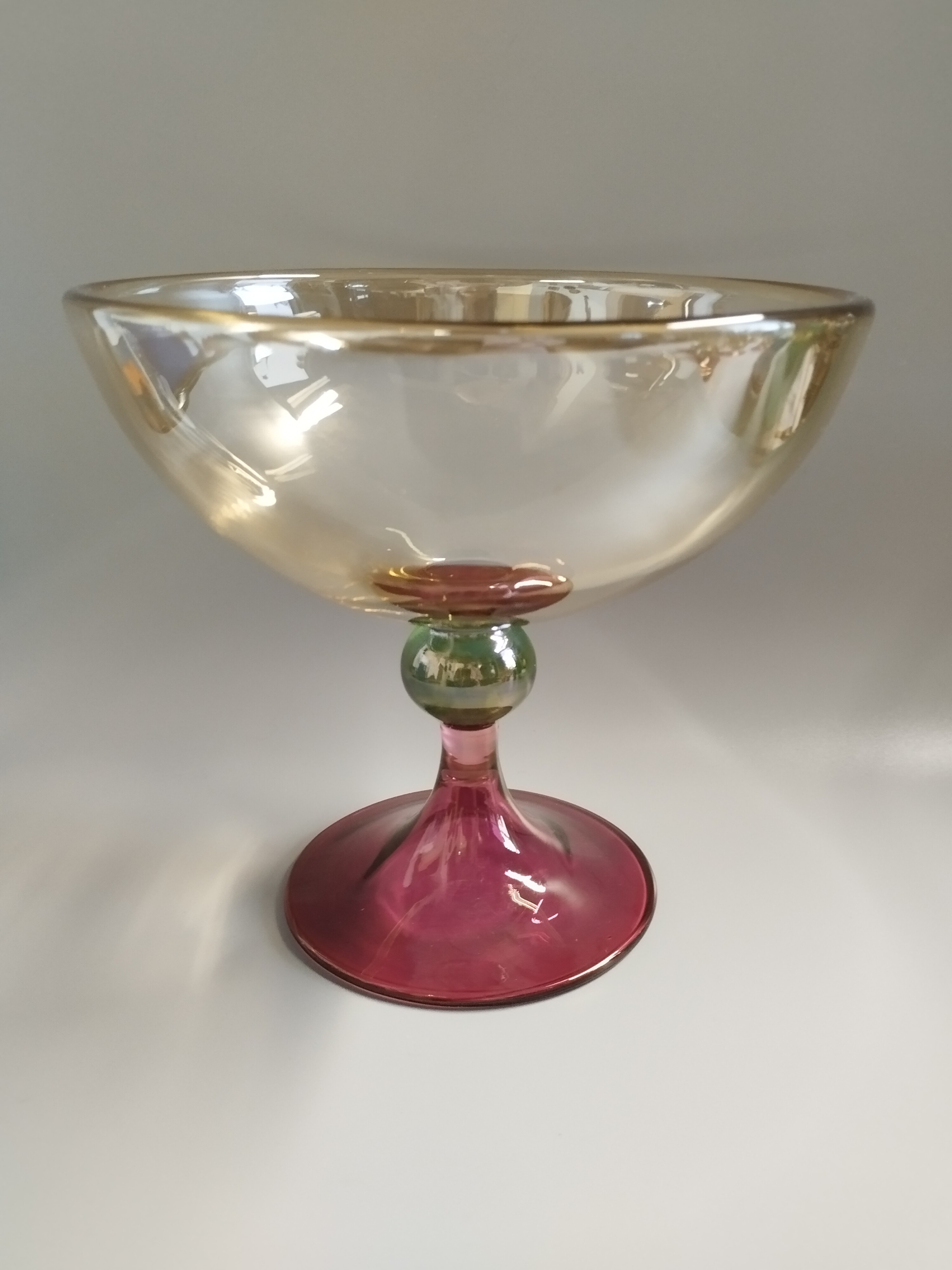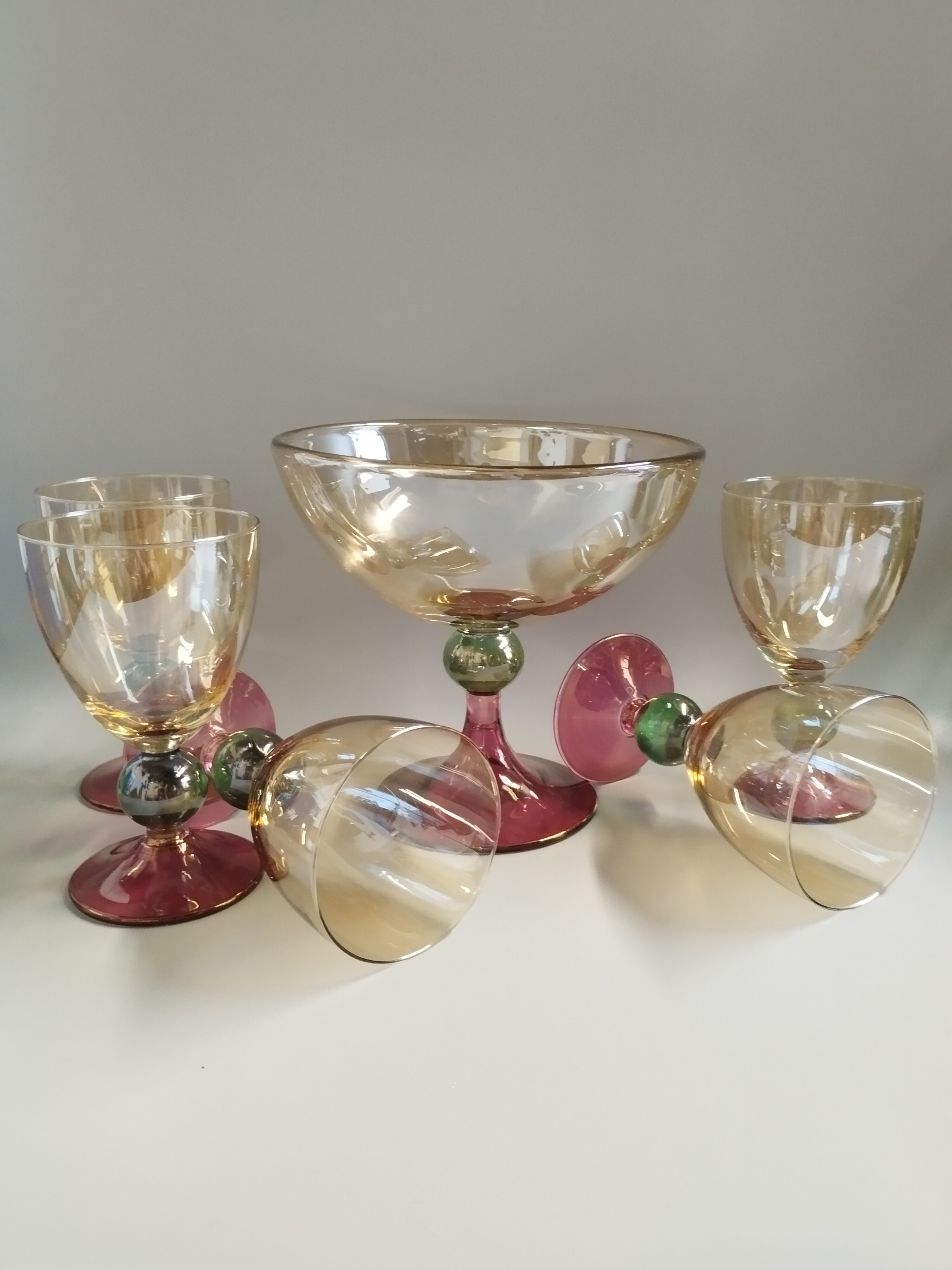 Komplet kieliszków (5 sztuk) w pięknej kolorystyce. Do kompletu dołączona jest misa na owoce. Huta Szkła Krosno, lata 70-te XX wieku.