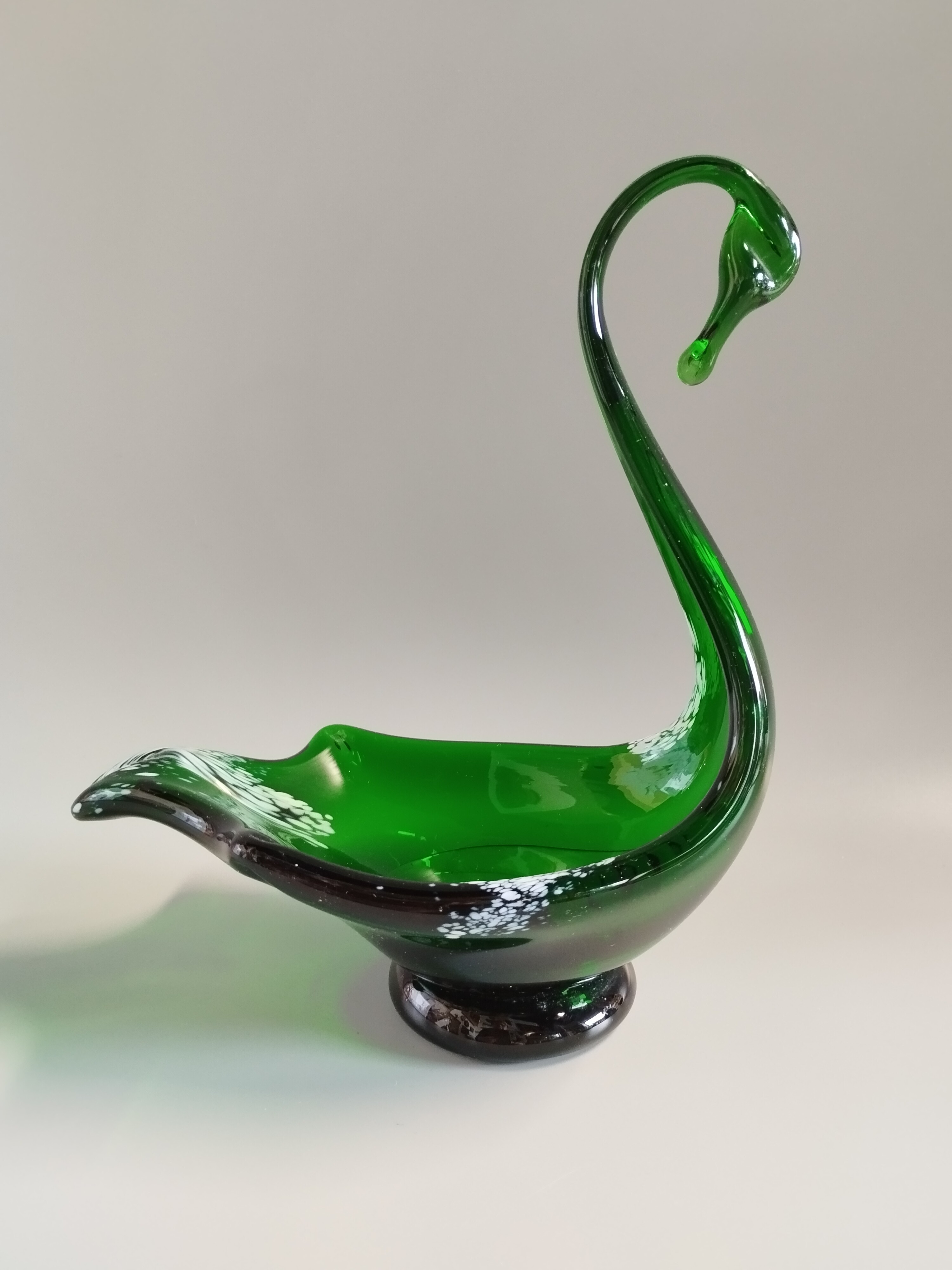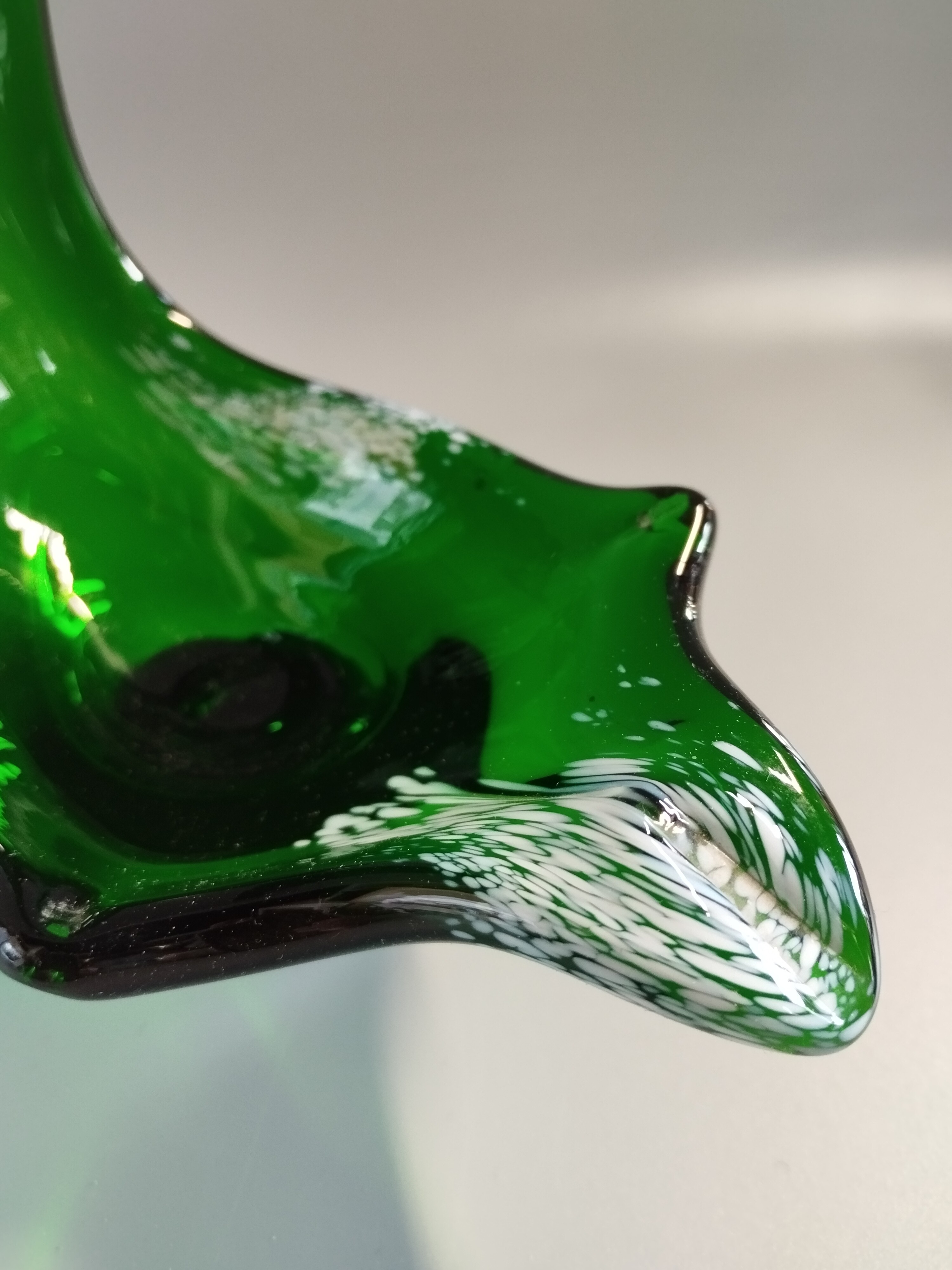 Szklana figurka w kolorze zielonym z białymi zdobieniami. Szkło barwione w masie. Prawdopodobnie HS Ząbkowice. Lata 70-te XX wieku.