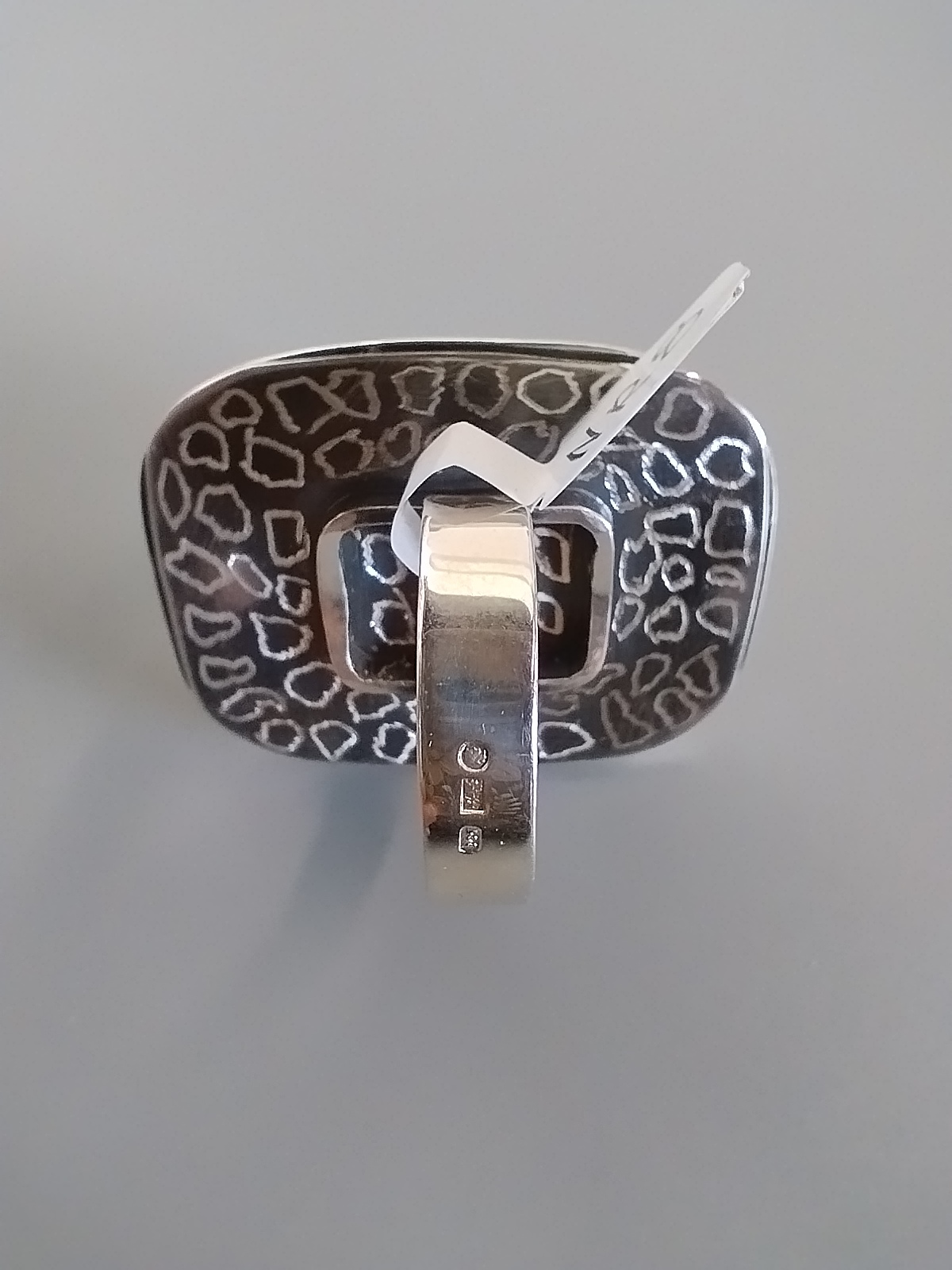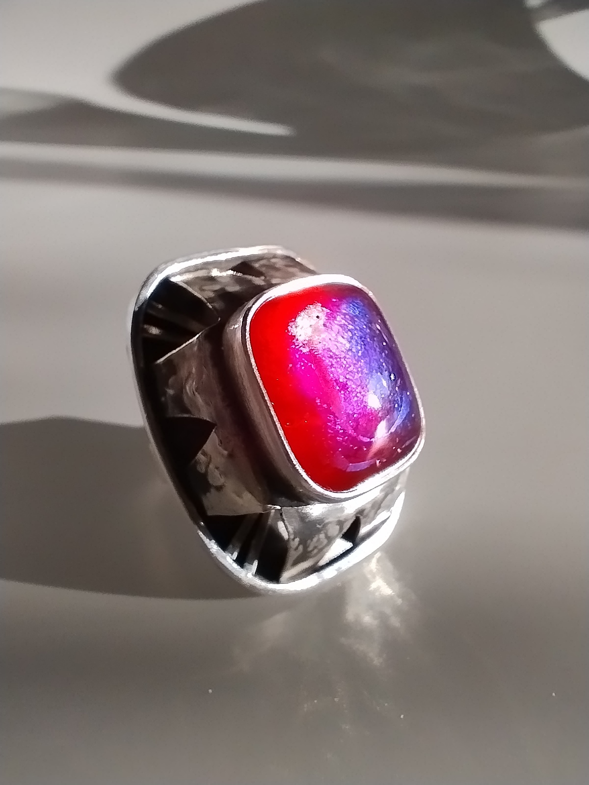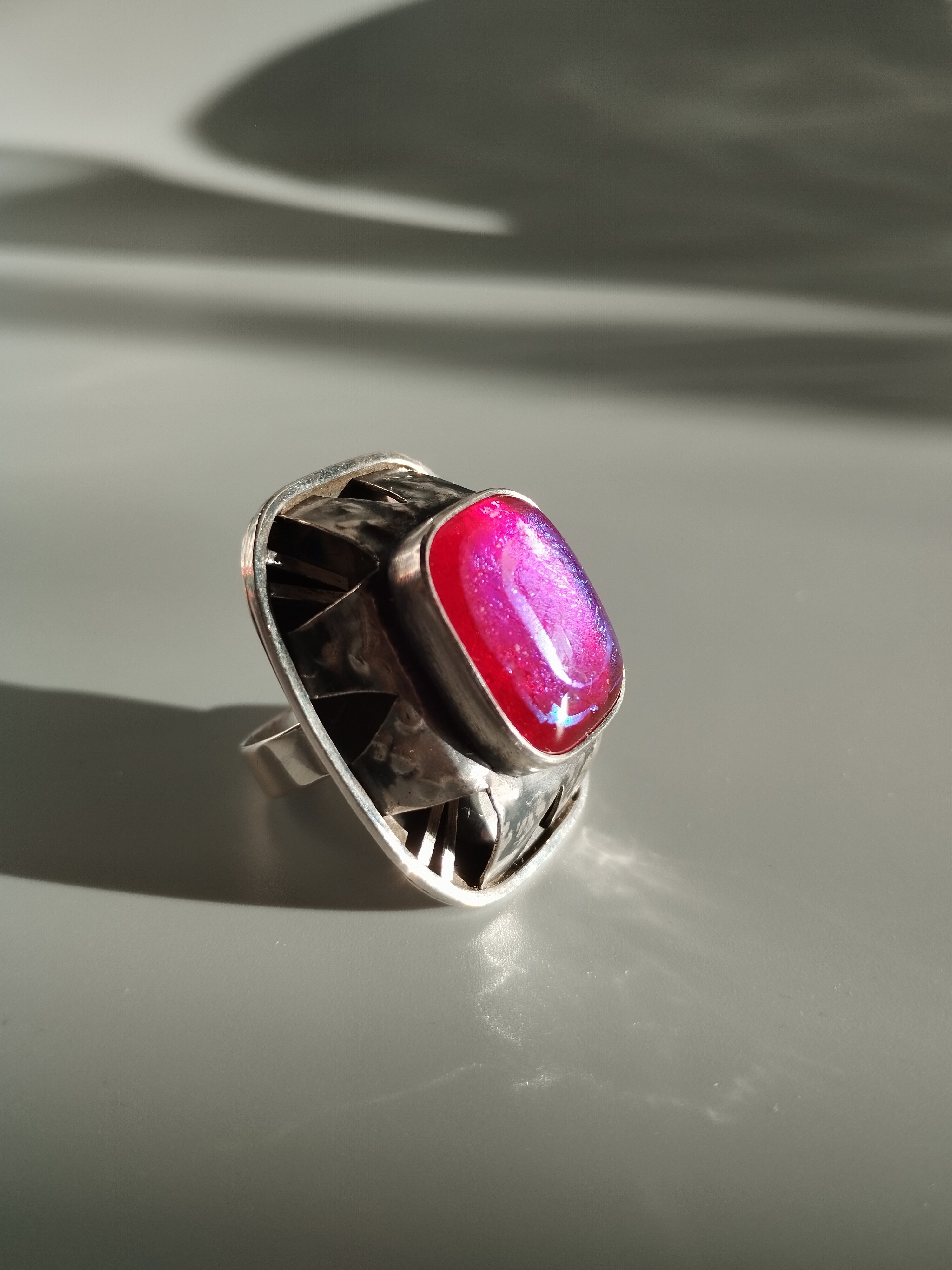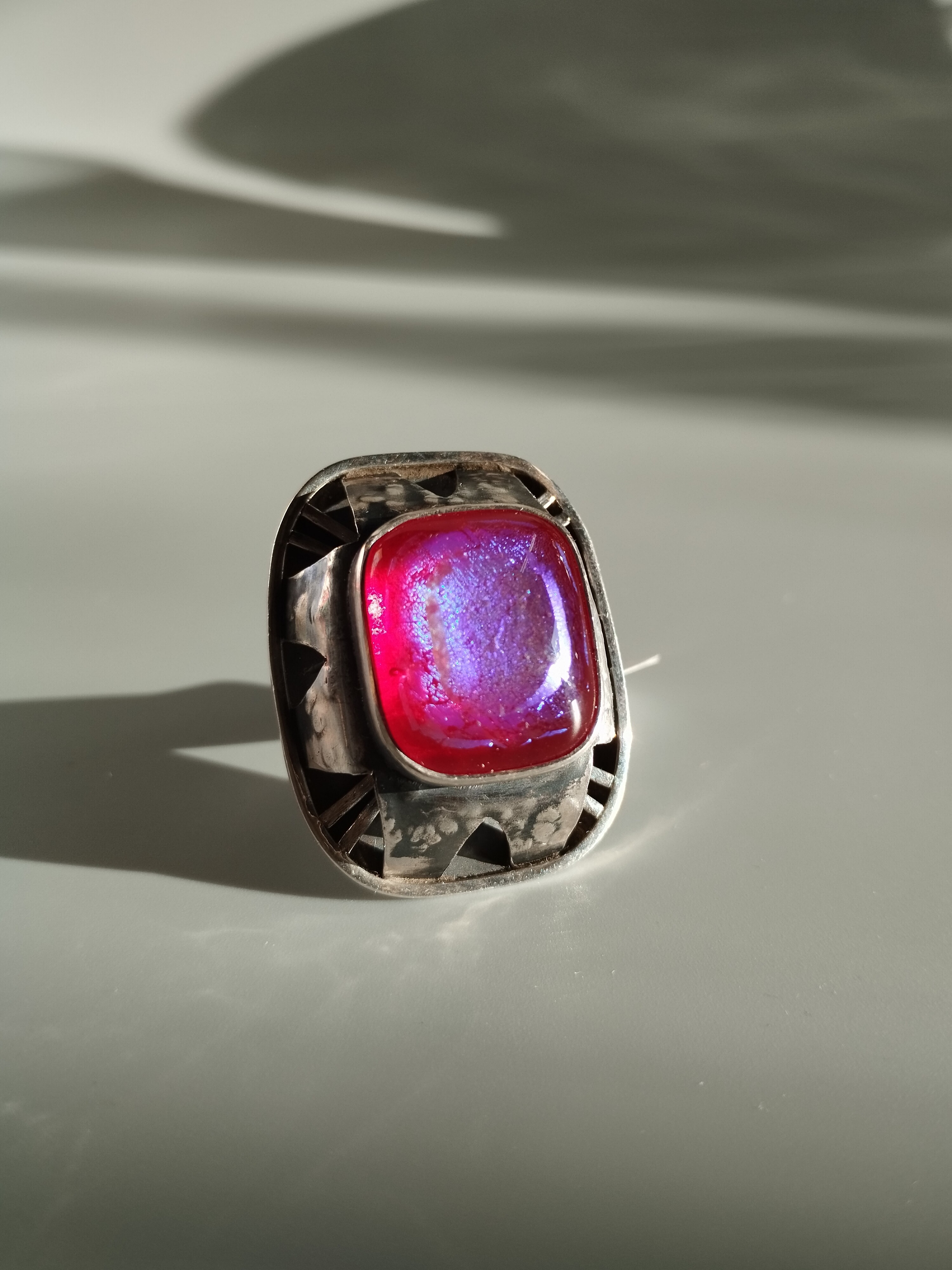 Przepiękny duży pierścień wykonany ze szkła stapianego warstwowo (typ Murano) opalizującego w odcieniach intensywnego różu i błękitu. Oprawa ze srebra oksydowanego najwyższej jakości. Projekt autorski.