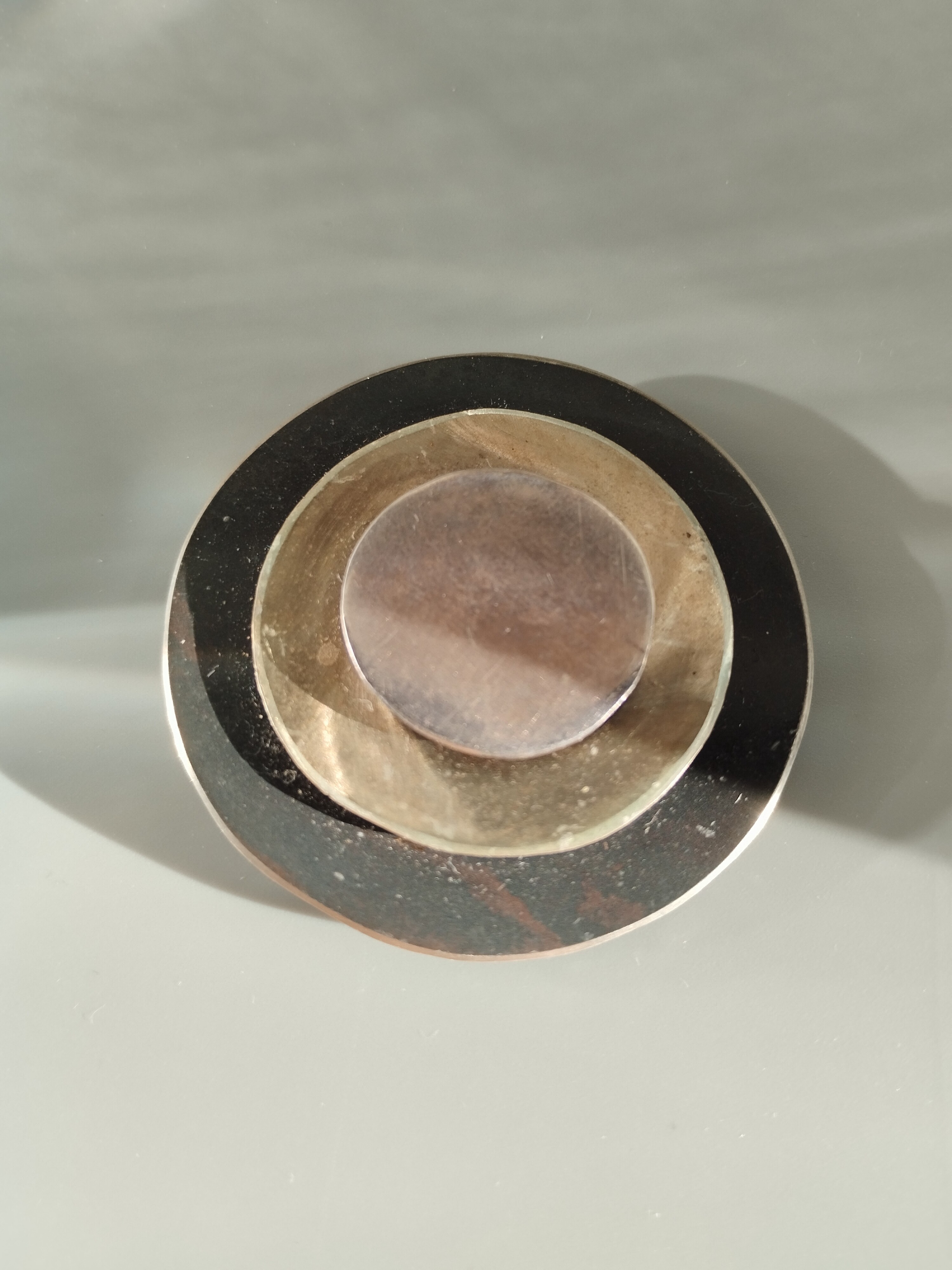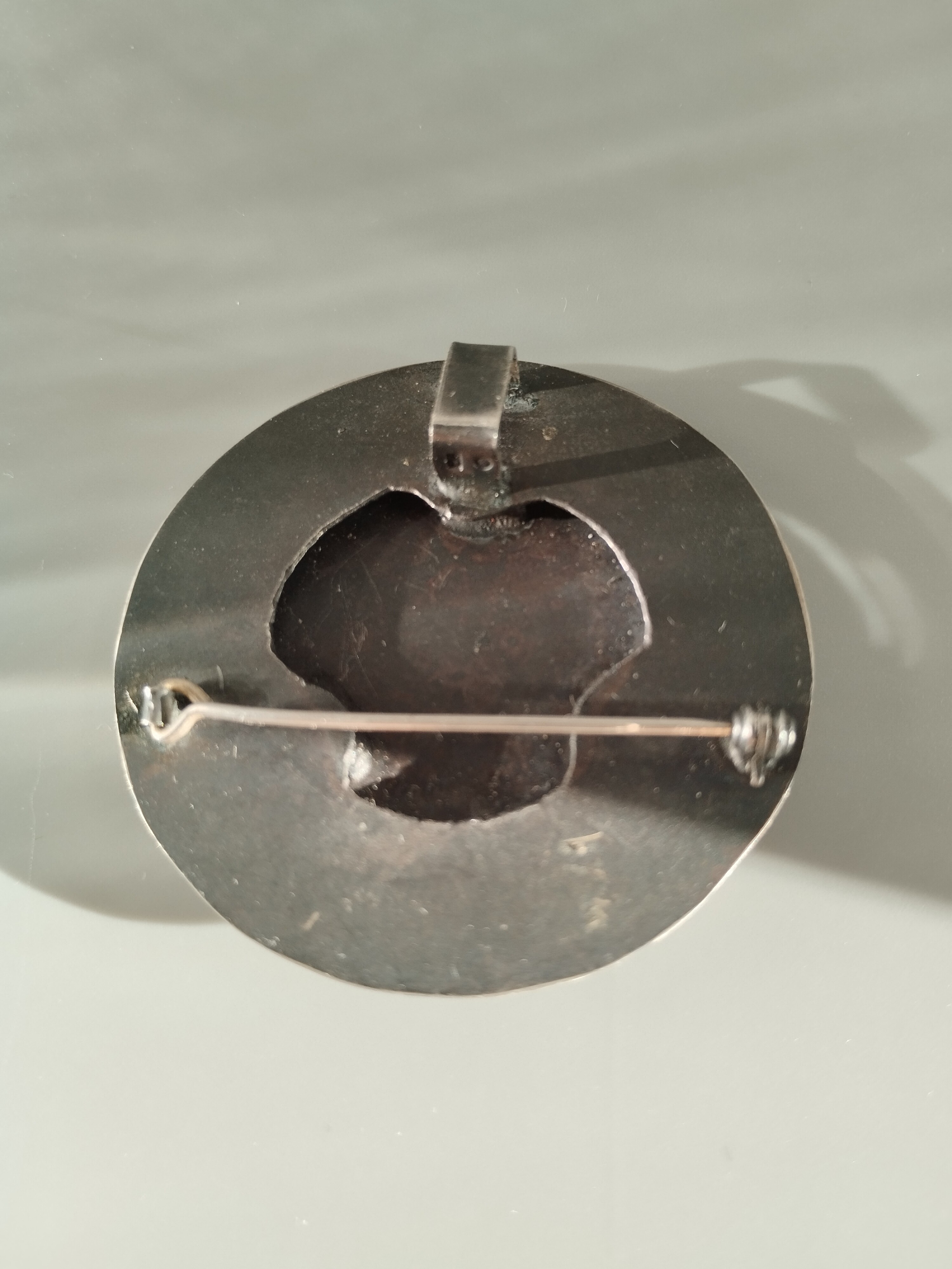 Trójkolorowy broszko-wisiorek wykonany ze srebra oksydowanego i pozłacanego. Próba 925.