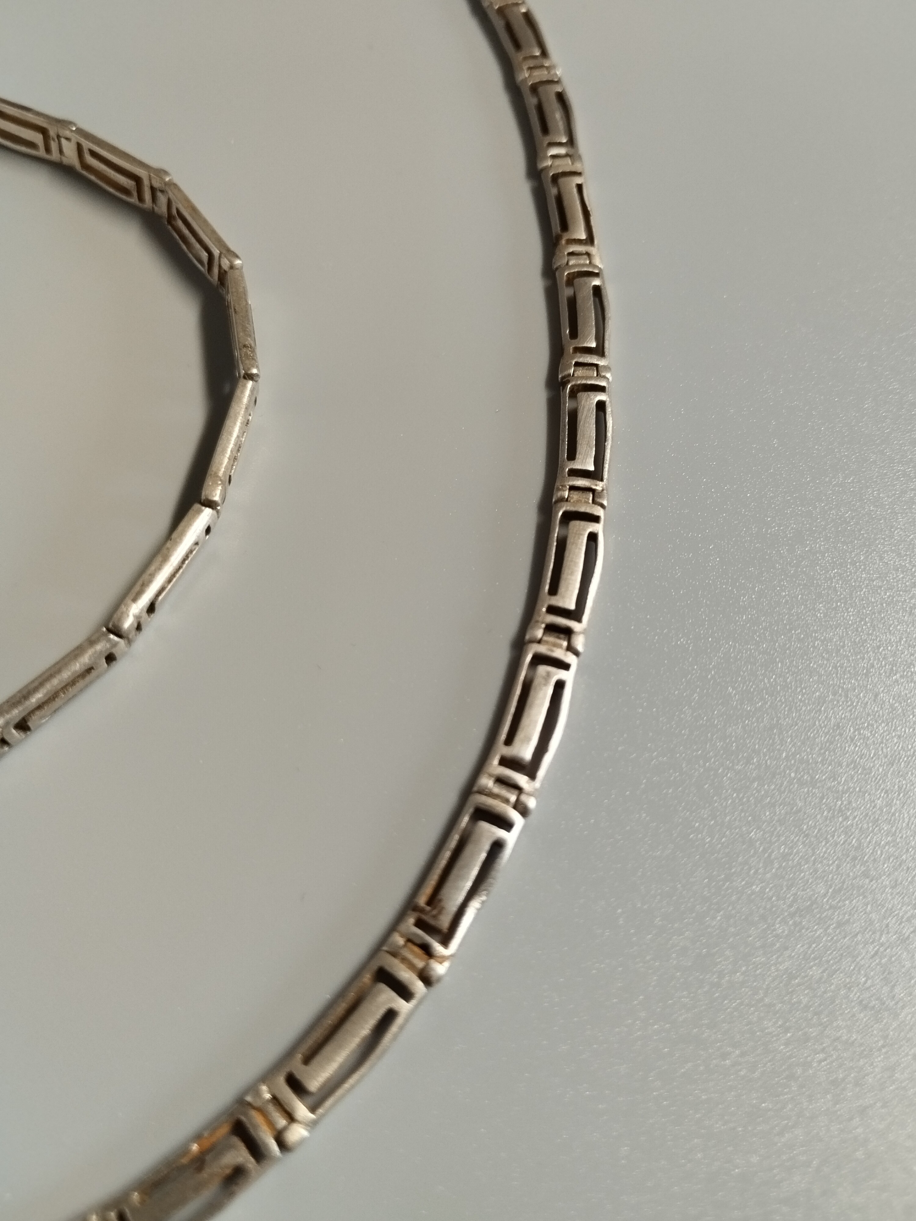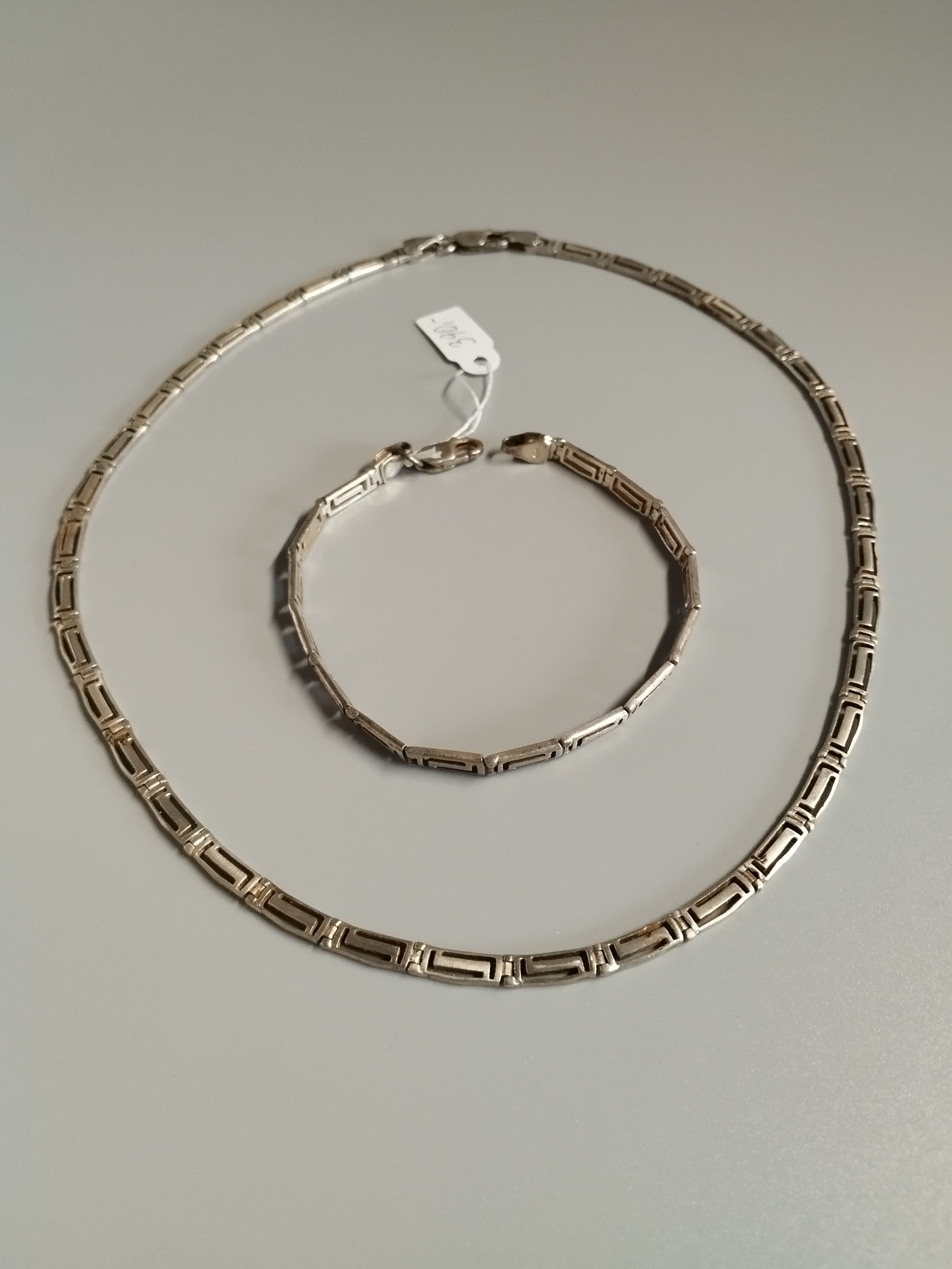 Komplet składa się z naszyjnika i bransoletki wykonanych ze srebra próby 925.