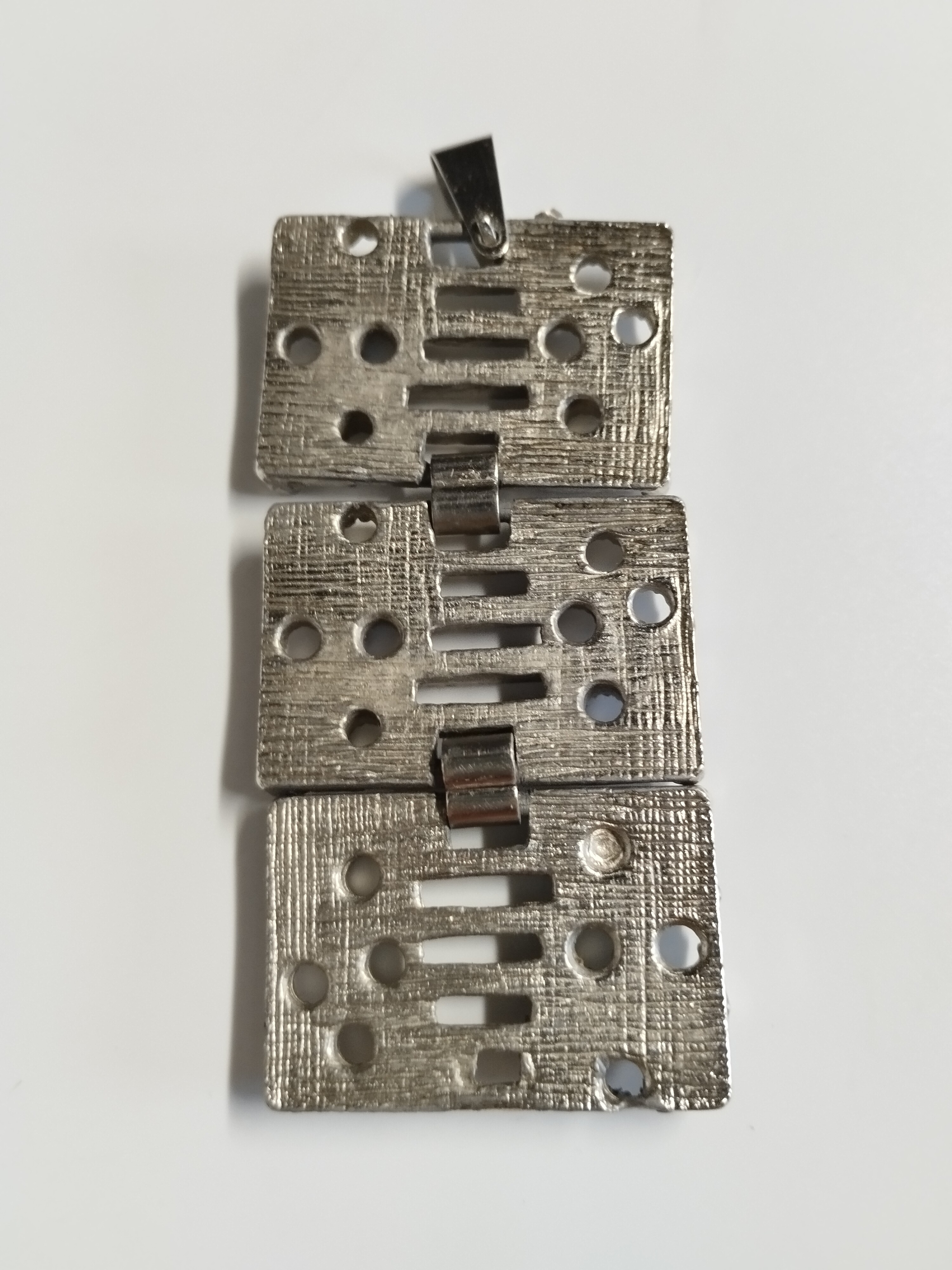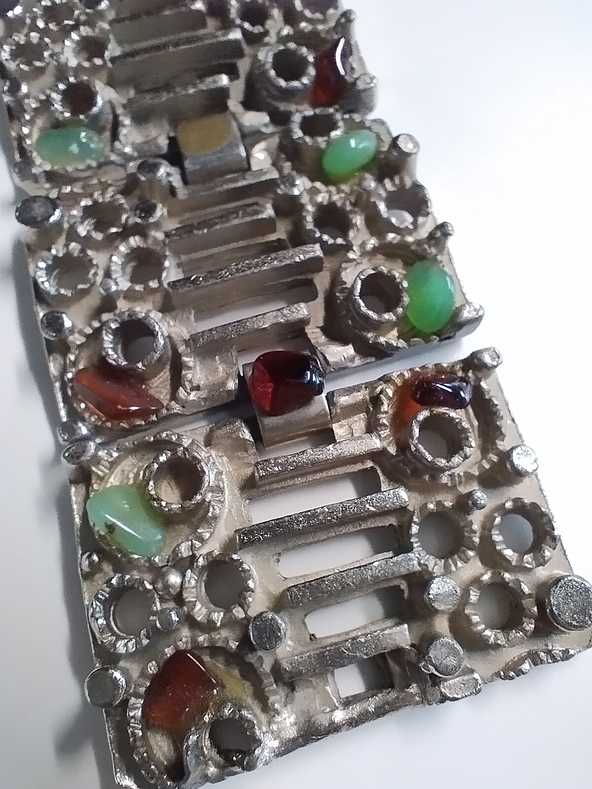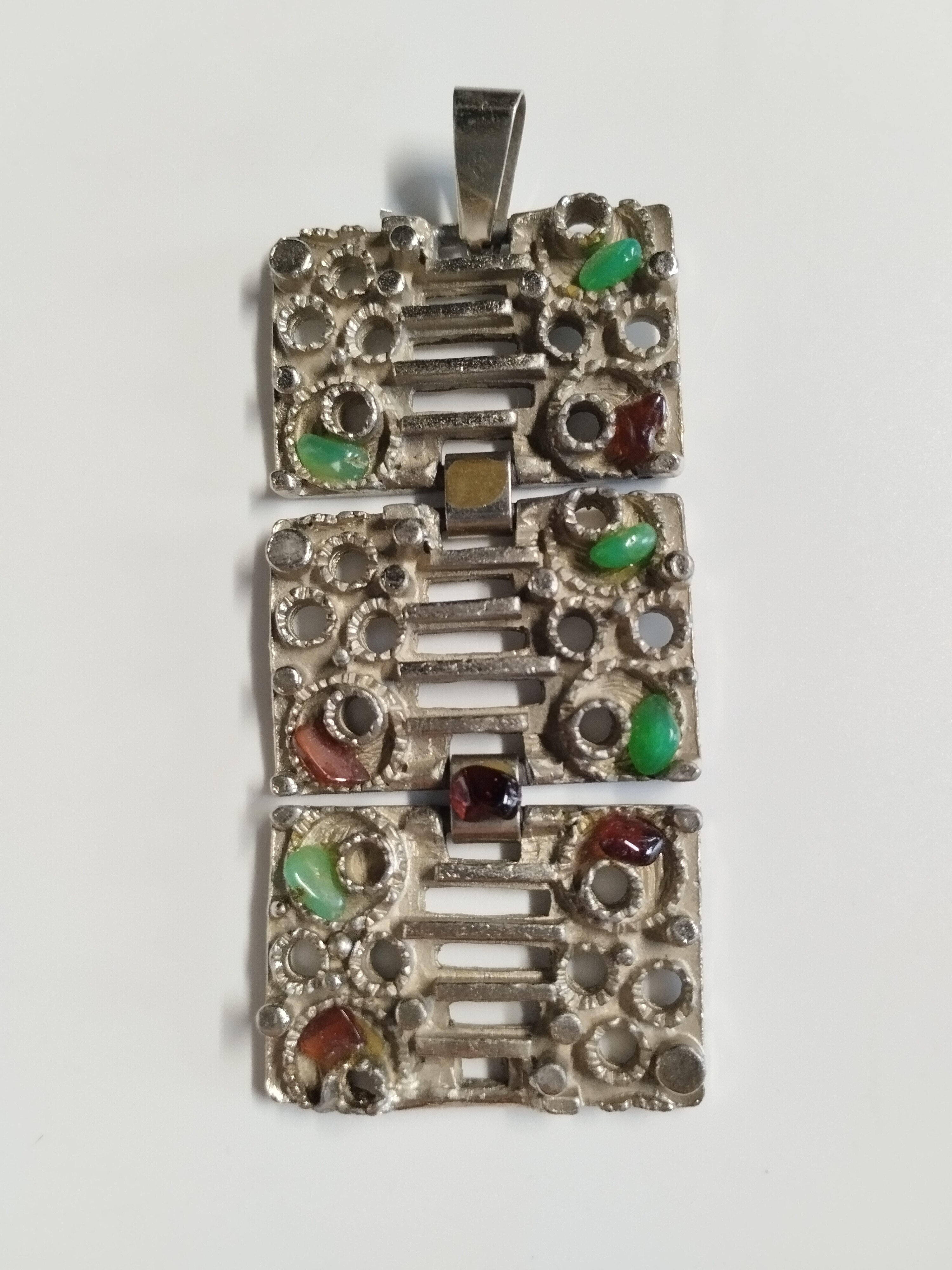 Wisior metalowy zdobiony kamieniami naturalnymi. Sztuczna biżuteria z lat 70-tych XX wieku.