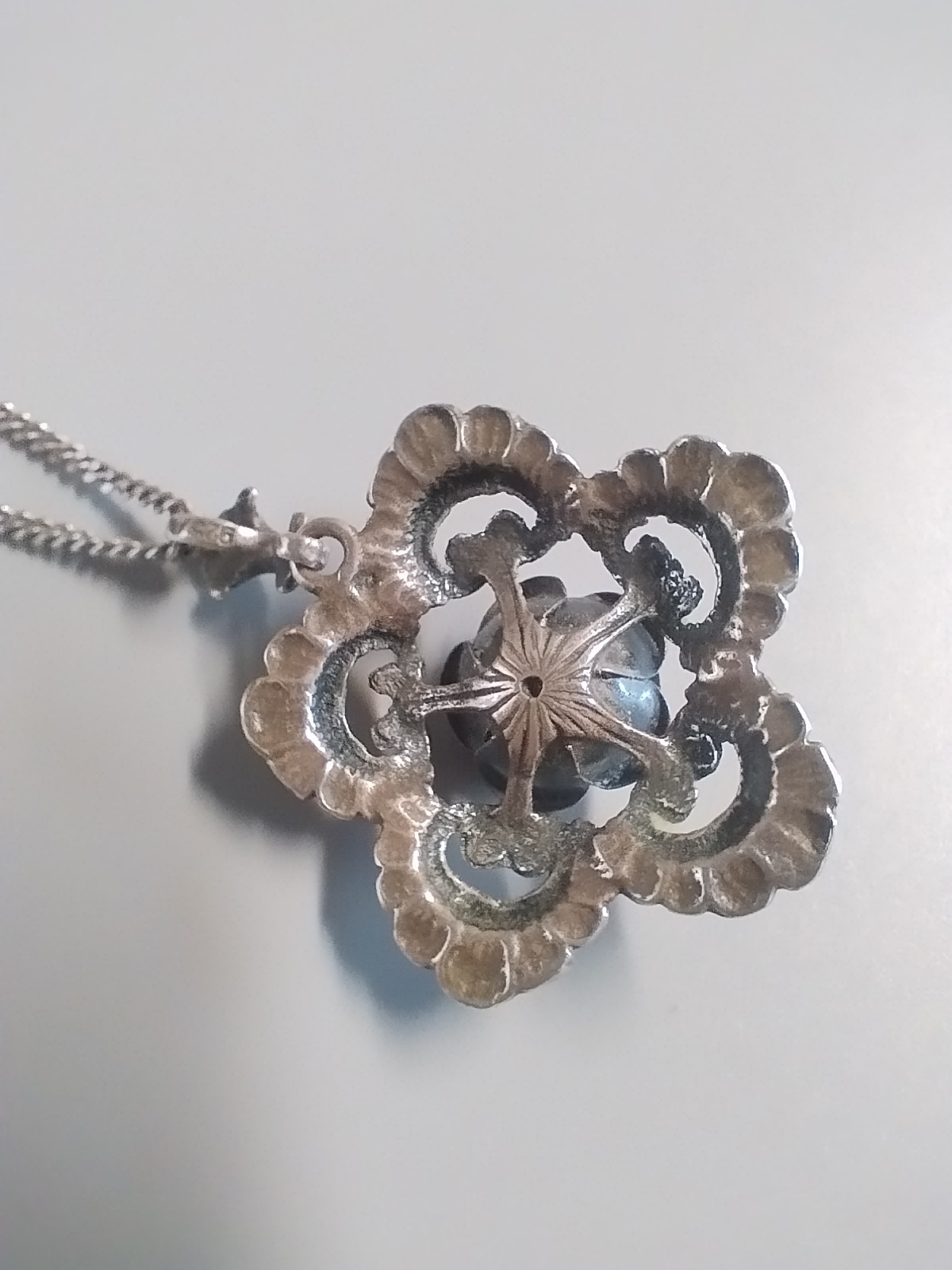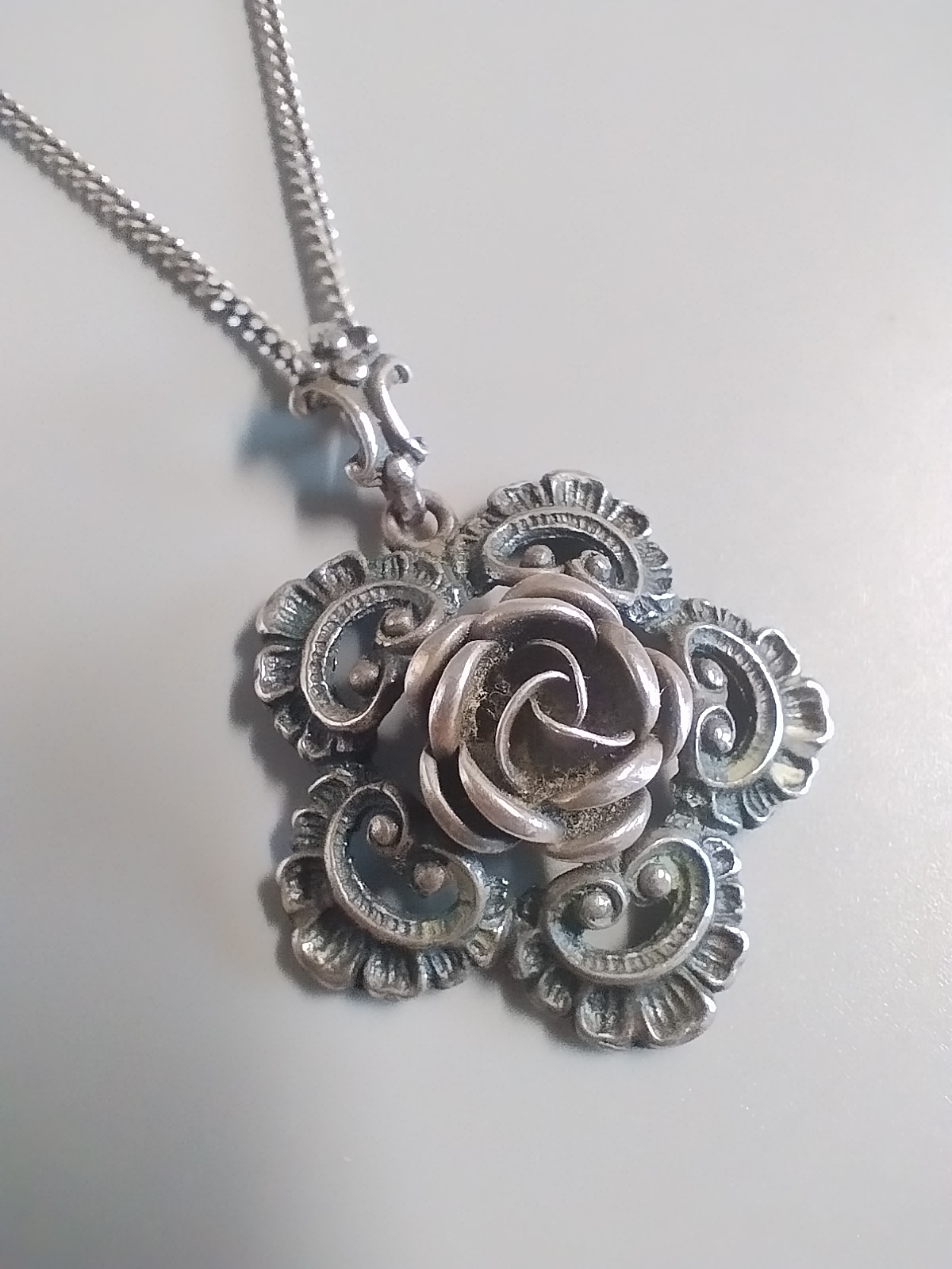 Wisiorek ażurowy z różyczką wykonany ze srebra oksydowanego 925. W komplecie z łańcuszkiem.