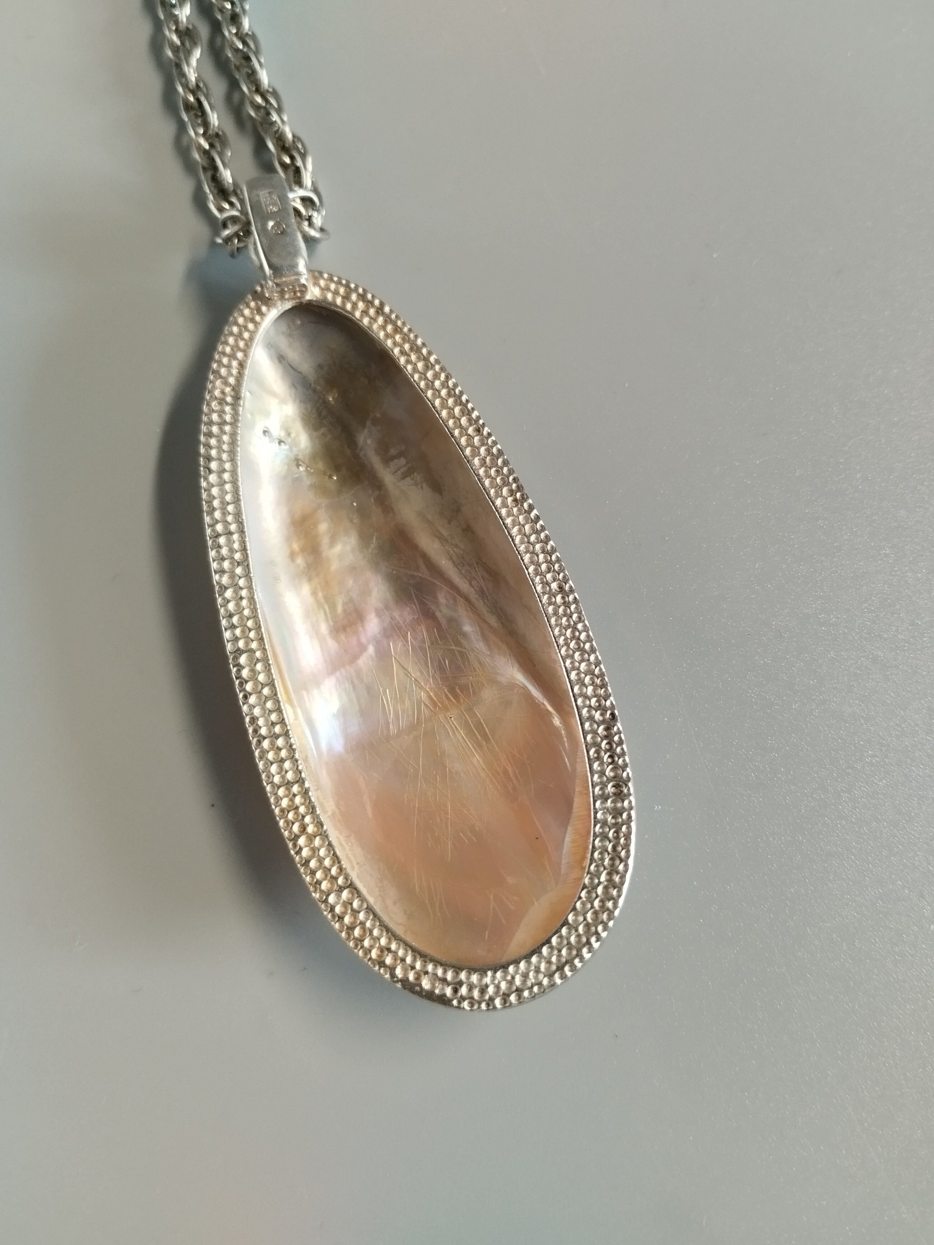 Duży wisior z muszlą naturalną w srebrnej oprawie. Do zawieszki możemy dołączyć gratis (na życzenie klienta) łańcuszek ze stali chirurgicznej o długości 50 cm, widoczny na zdjęciu. W Uwagach do zamówienia prosimy wpisać "łańcuszek".
