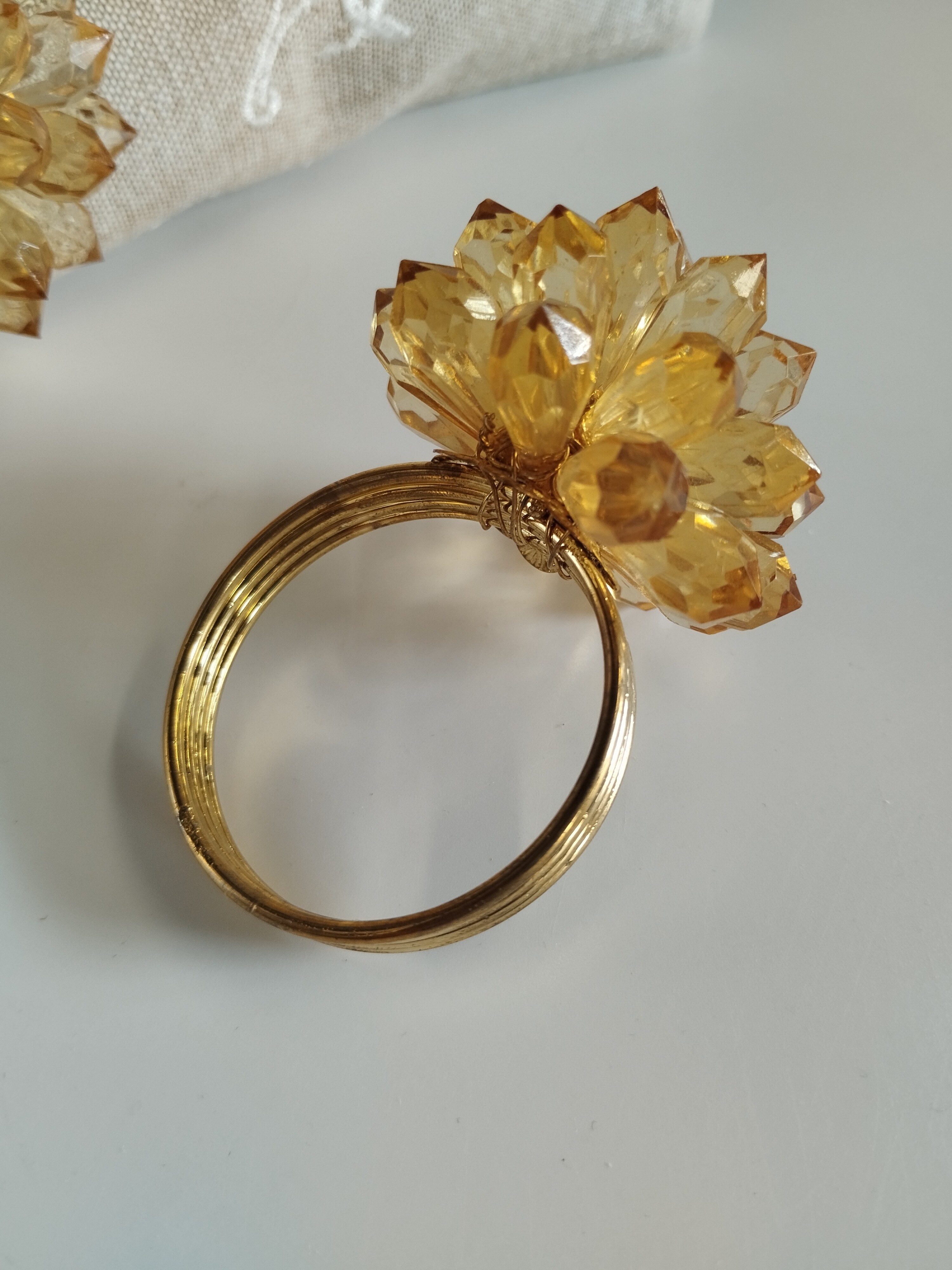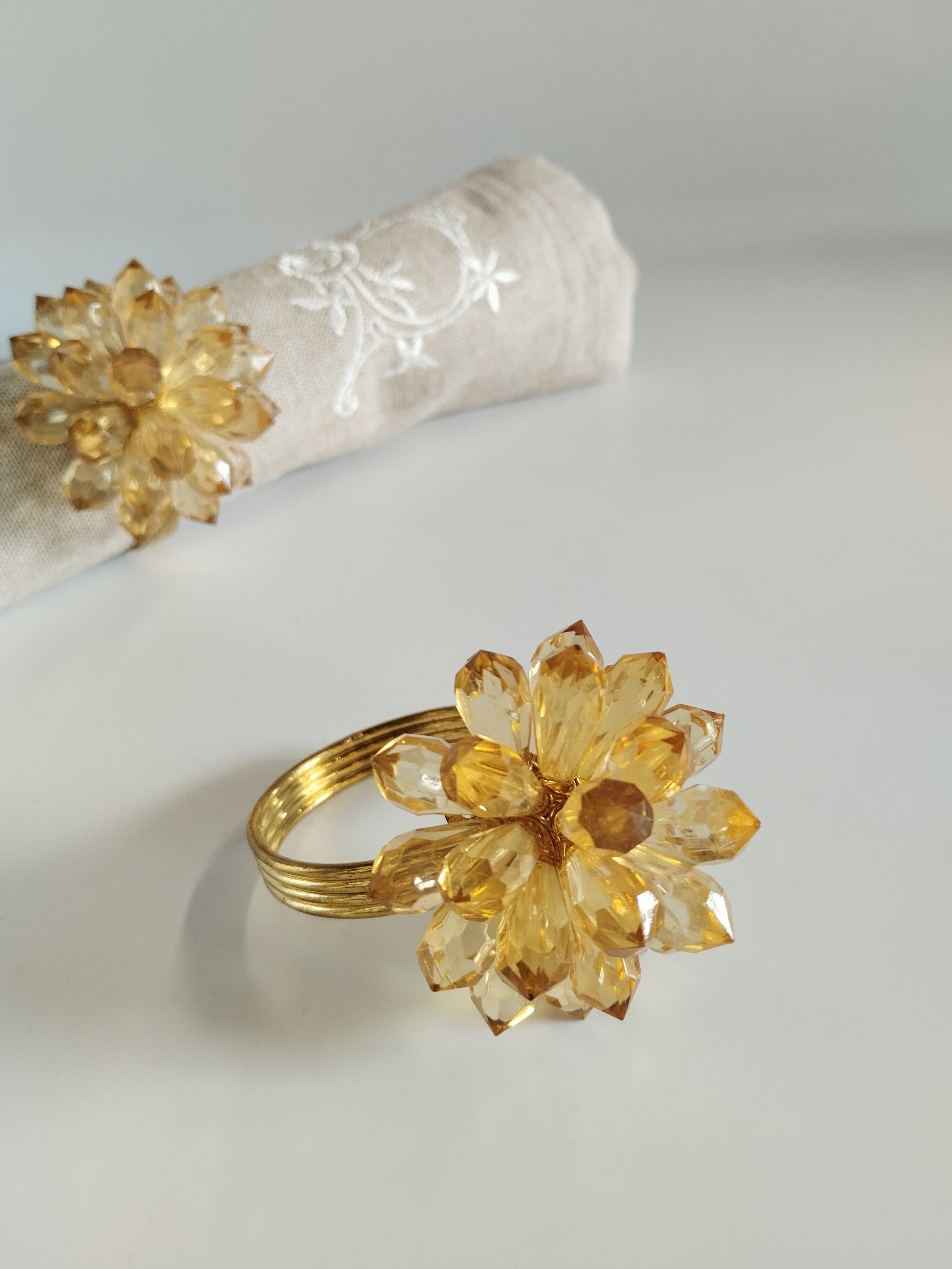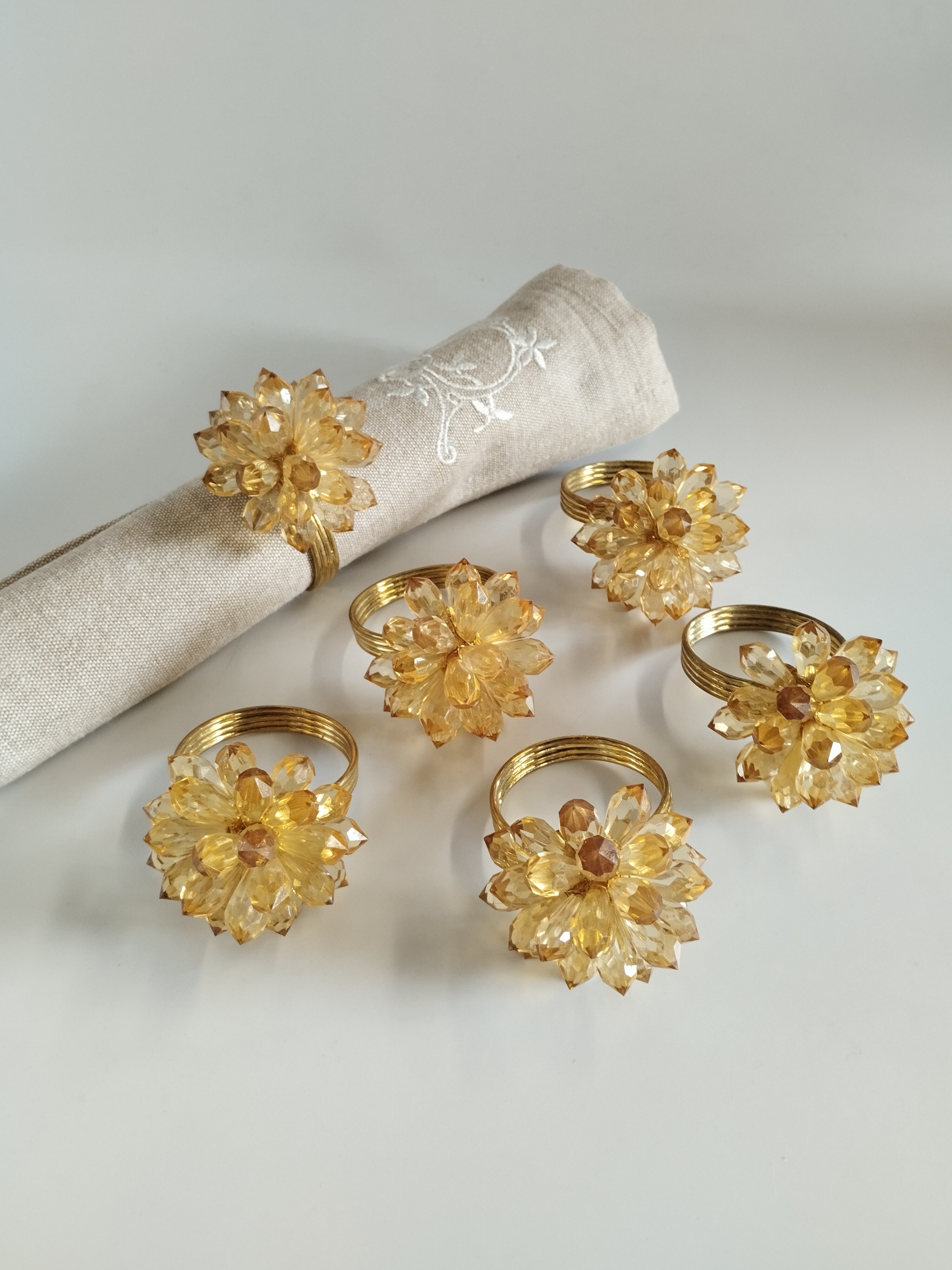 Komplet (6 sztuk) obrączek do serwetek. Metal w kolorze złotym, kwiaty z żywicy.