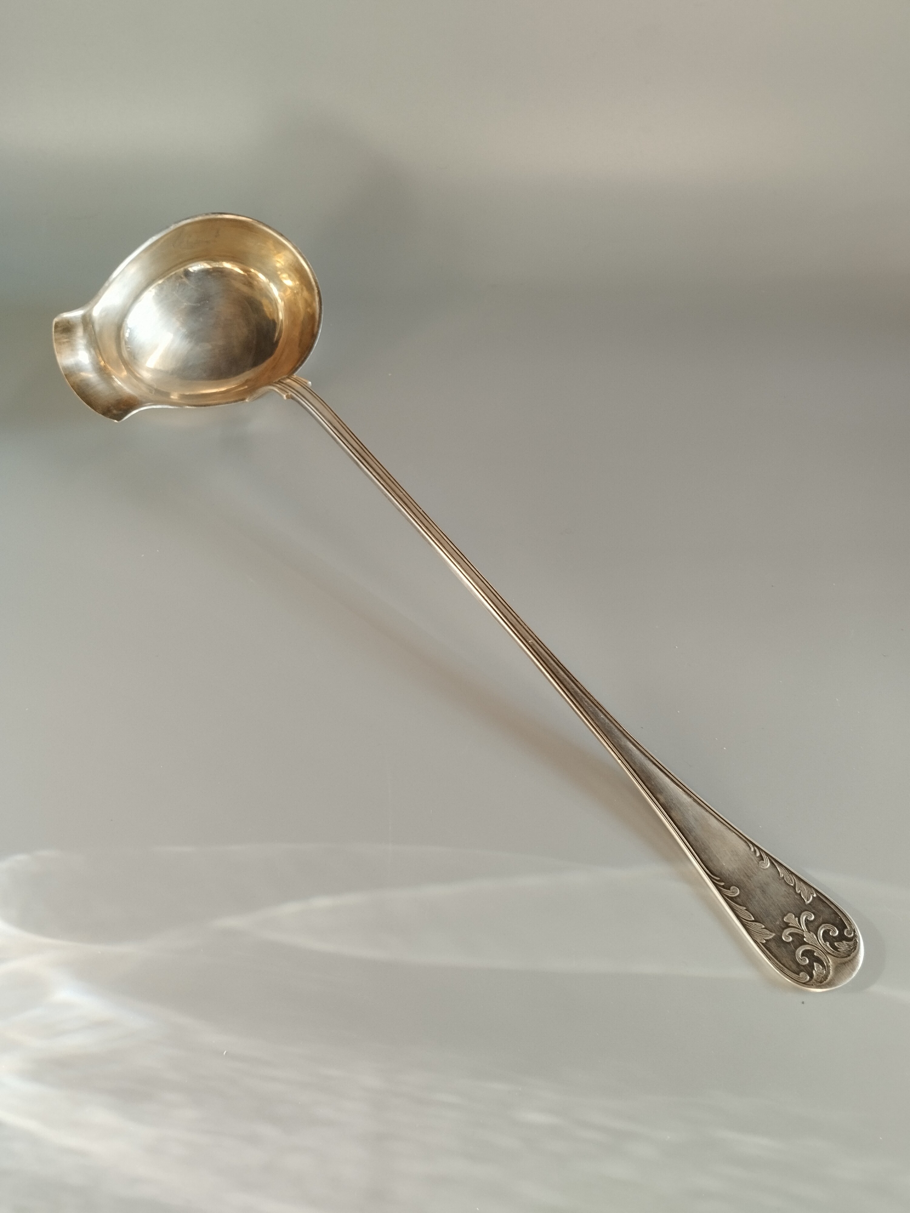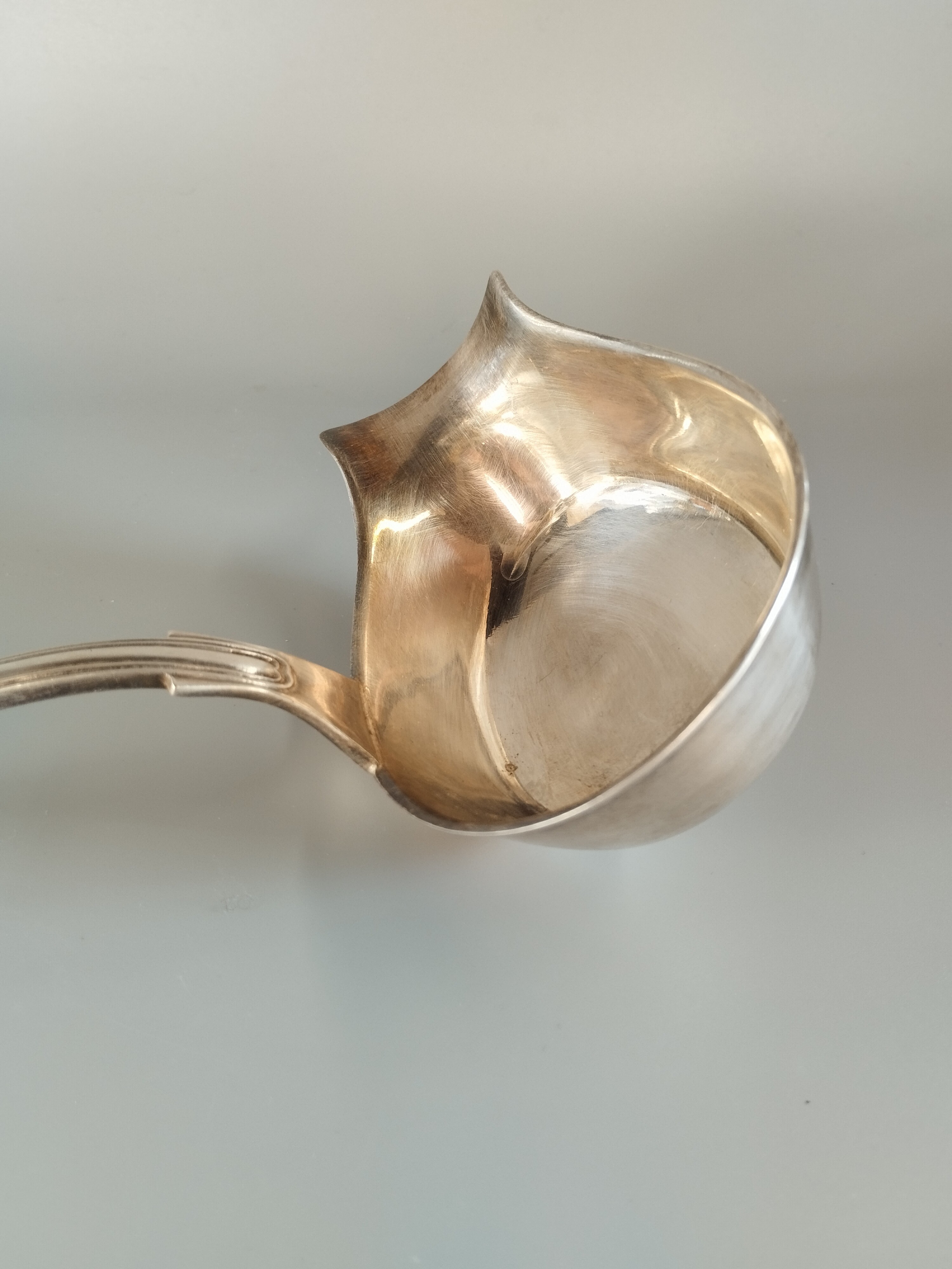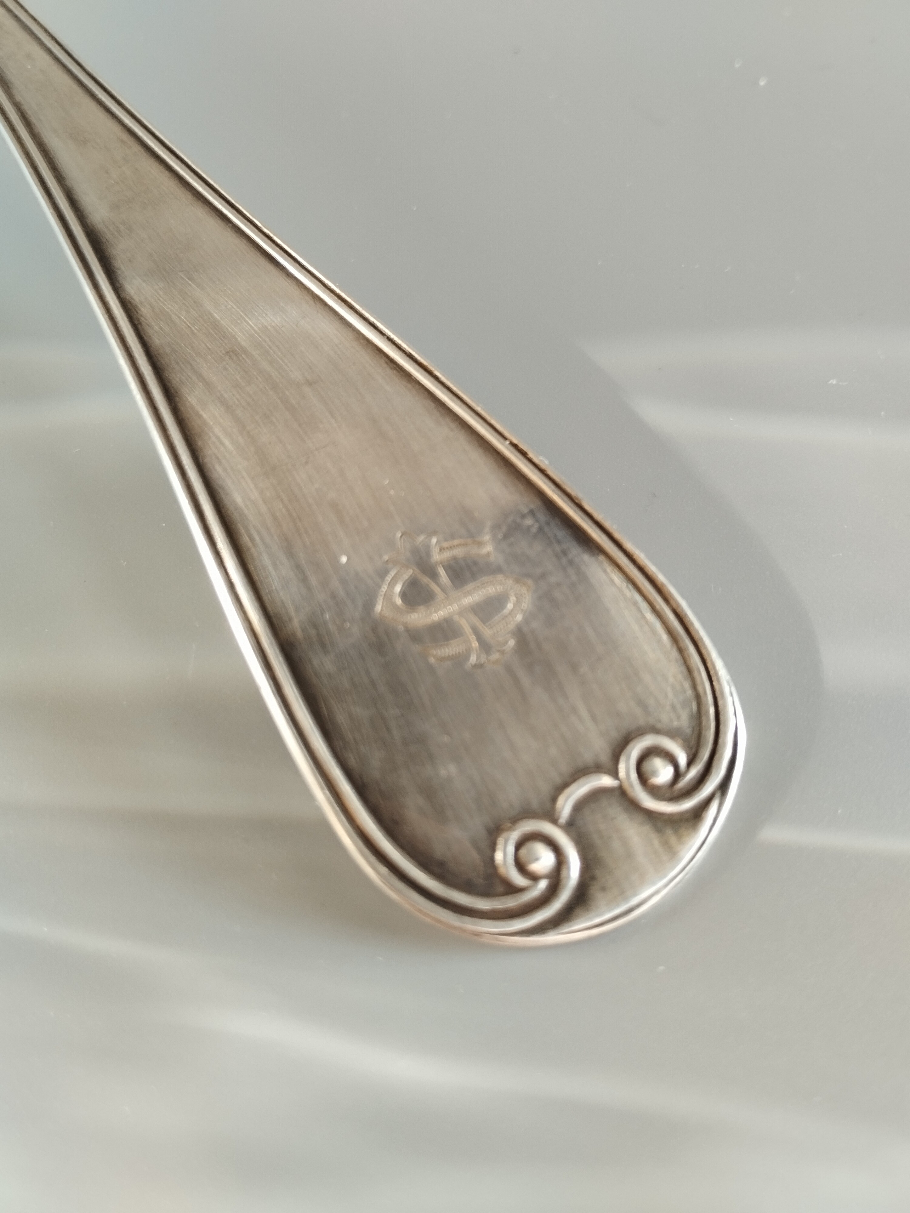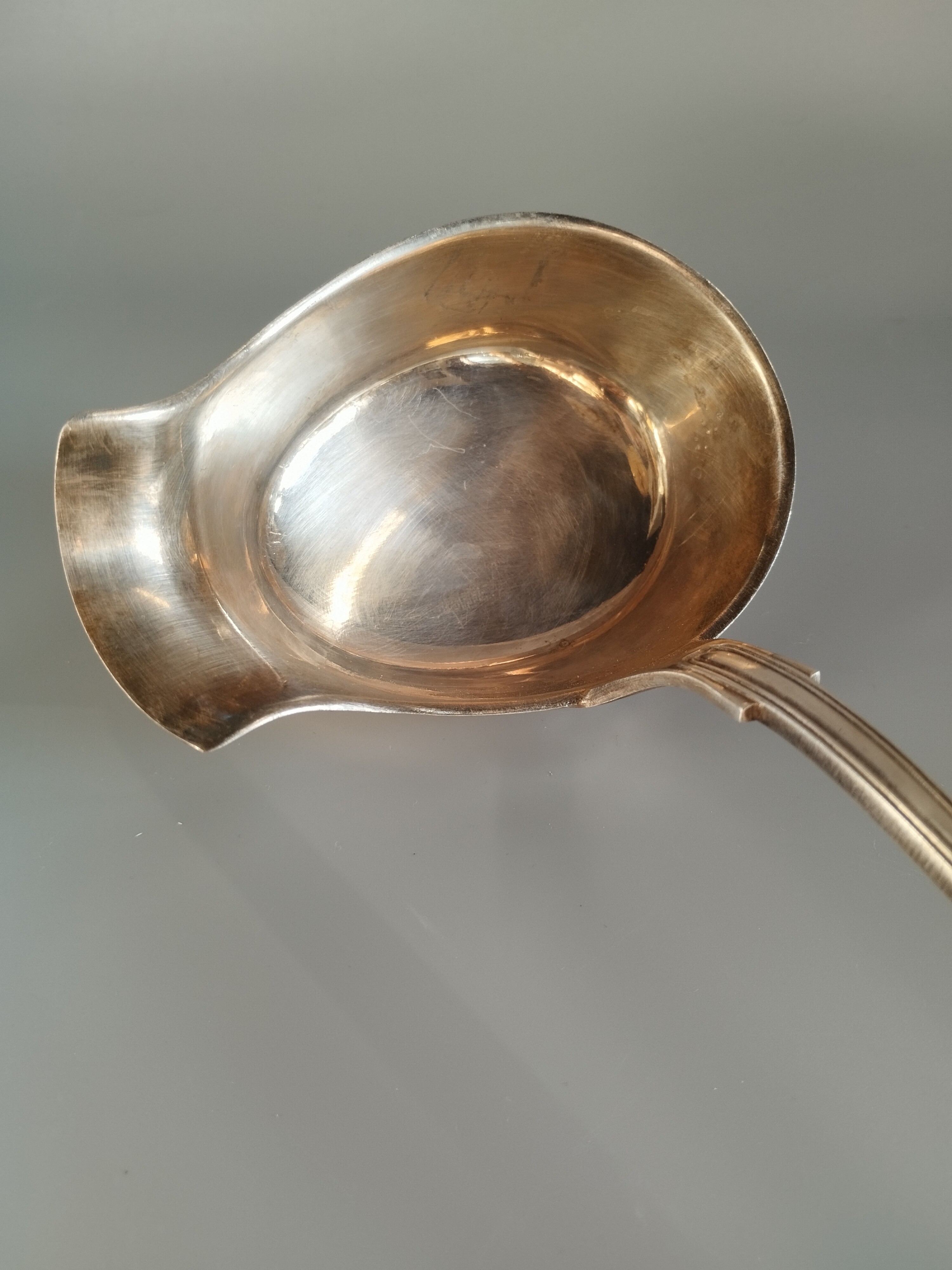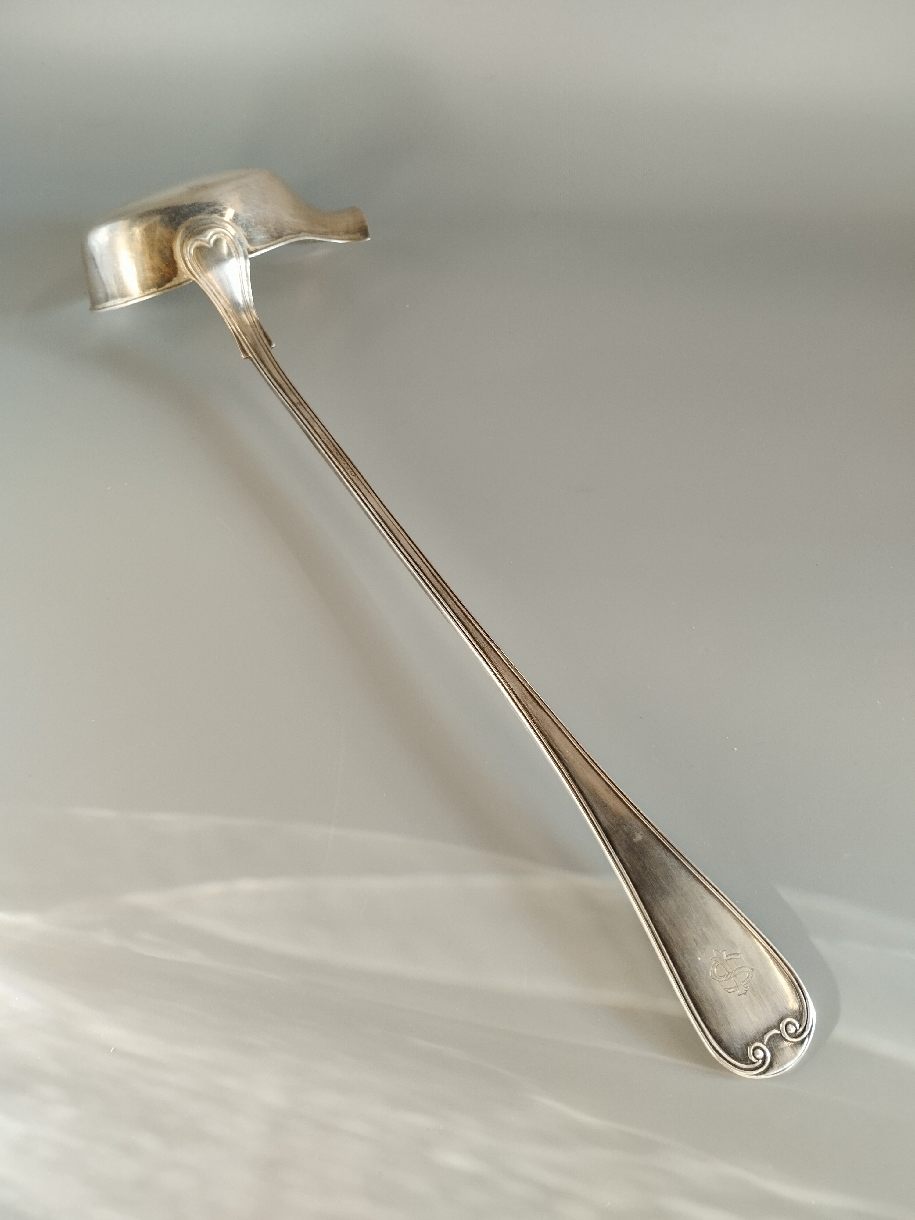 Posrebrzana chochla do sosów z monogramem (prawdopodobnie "S" i "P").